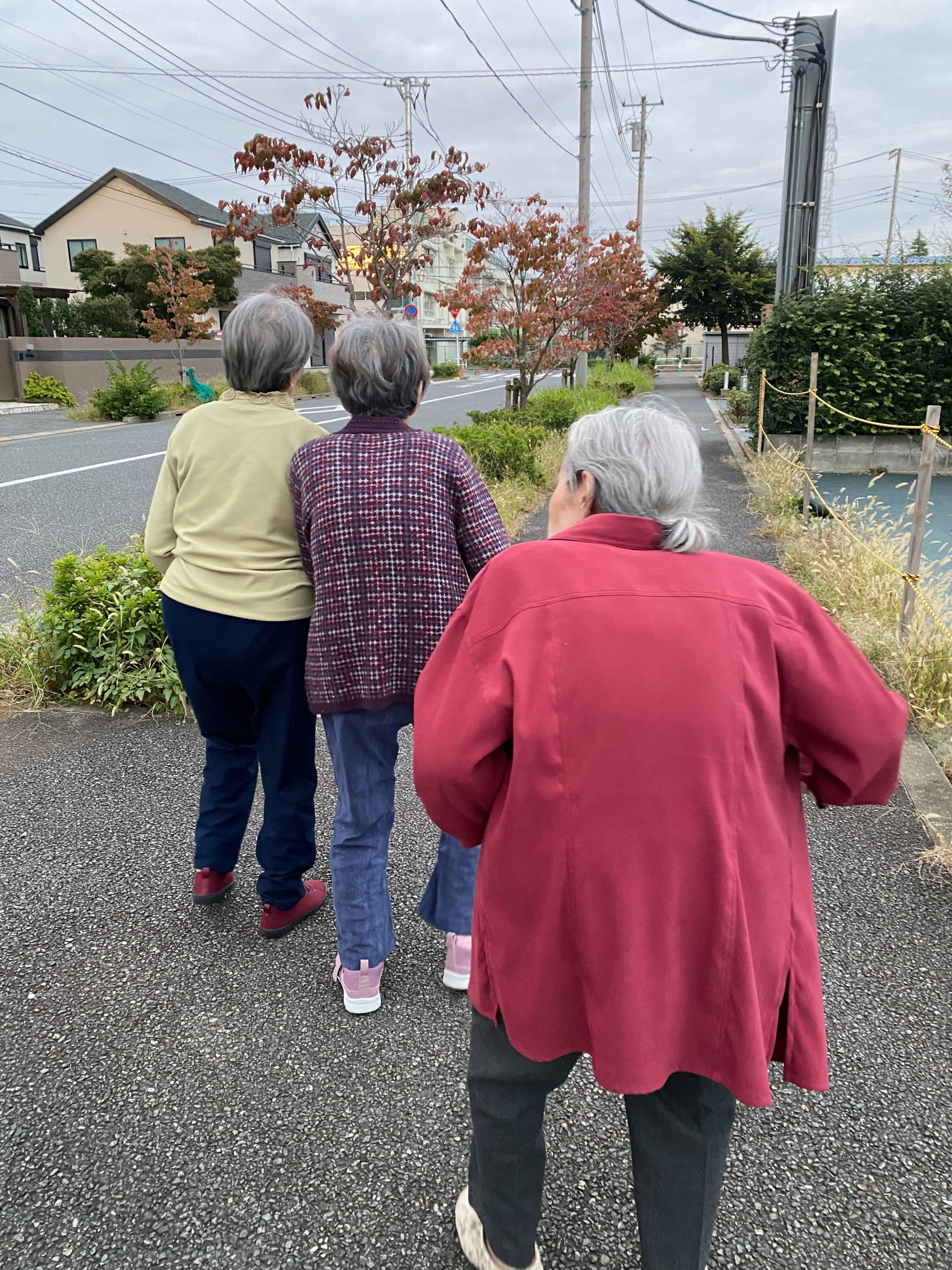 一昨日いい天気ですので、皆様と一緒に外にお散歩しに行ってきました。「もう秋だね。。涼しくていい気持ち」「葉っぱのいろもう赤くなってきたね、秋だね。。」と声が聞こえました。