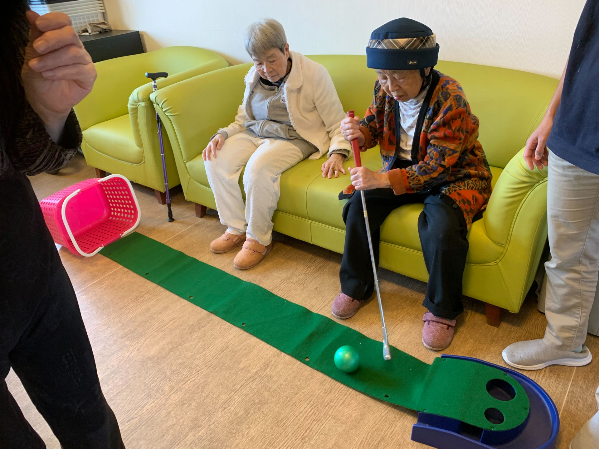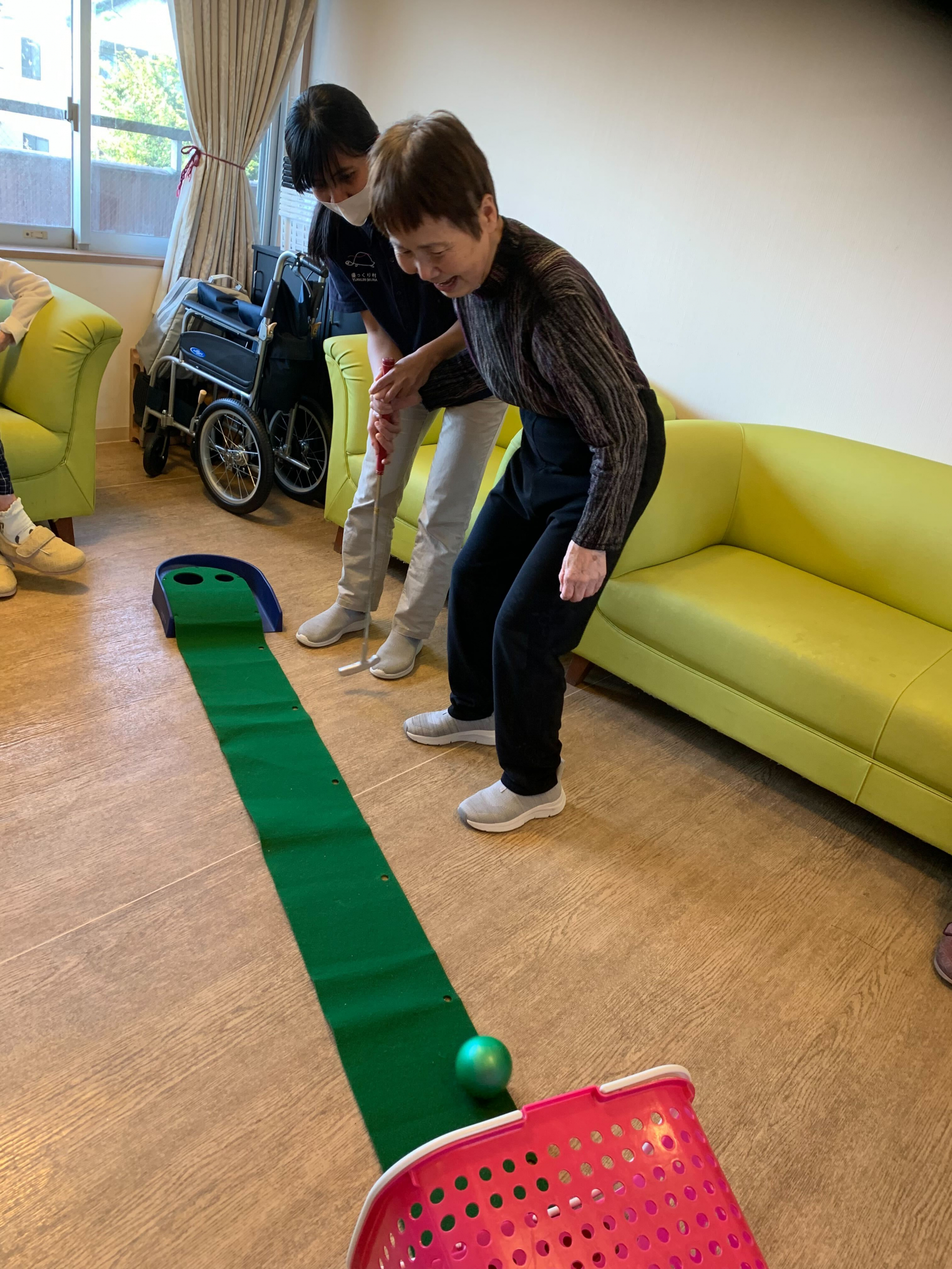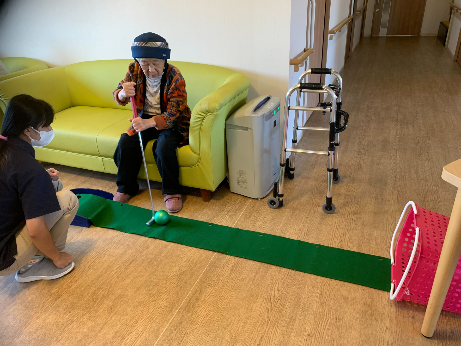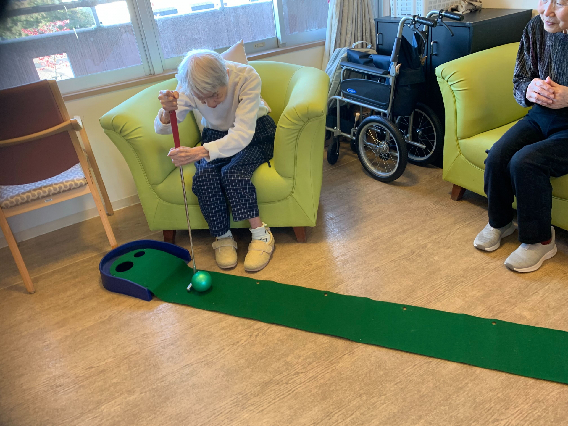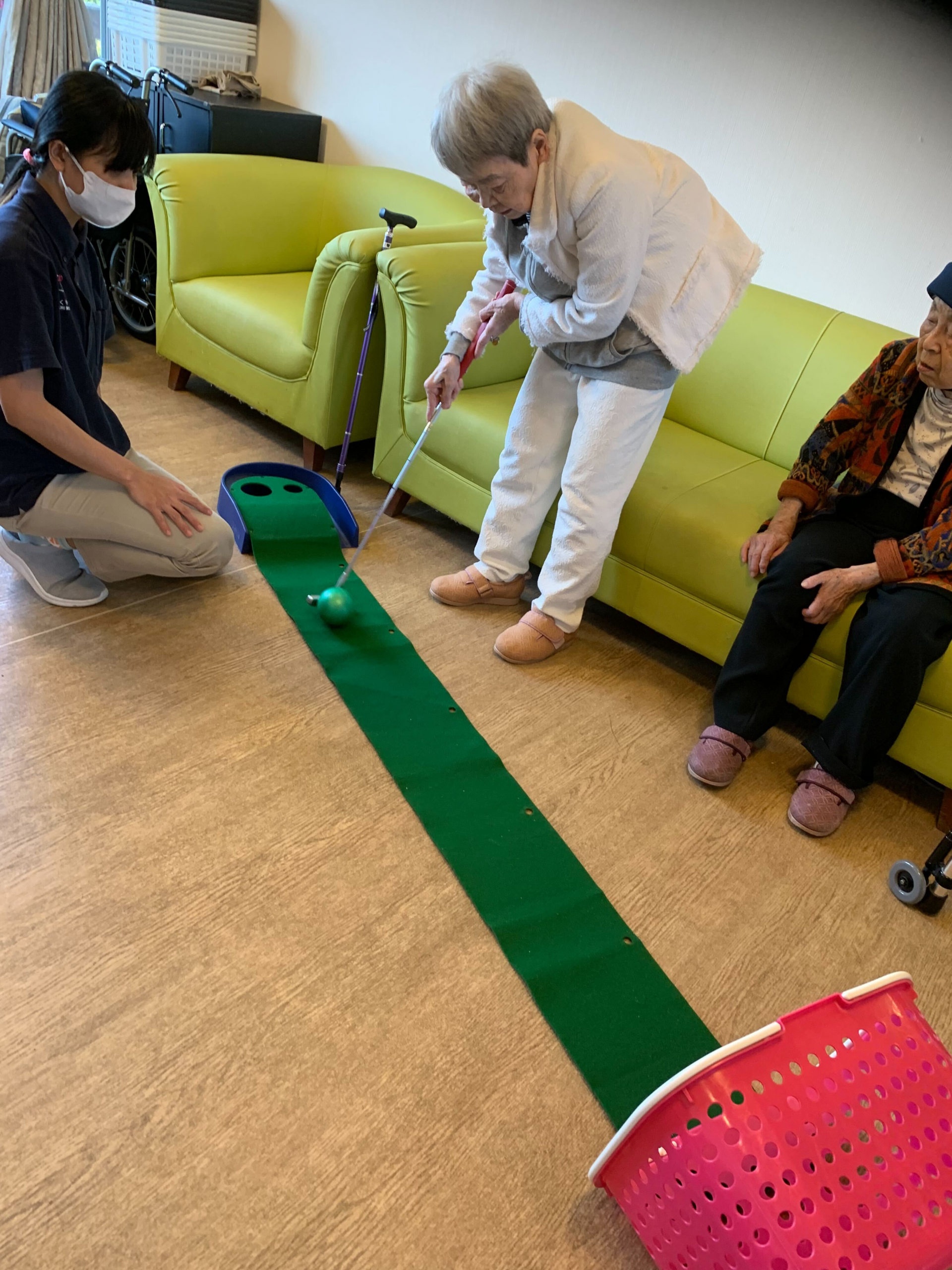 椅子に座ってのゴルフ!よーくねらいをさだめてカゴにいれてきます!