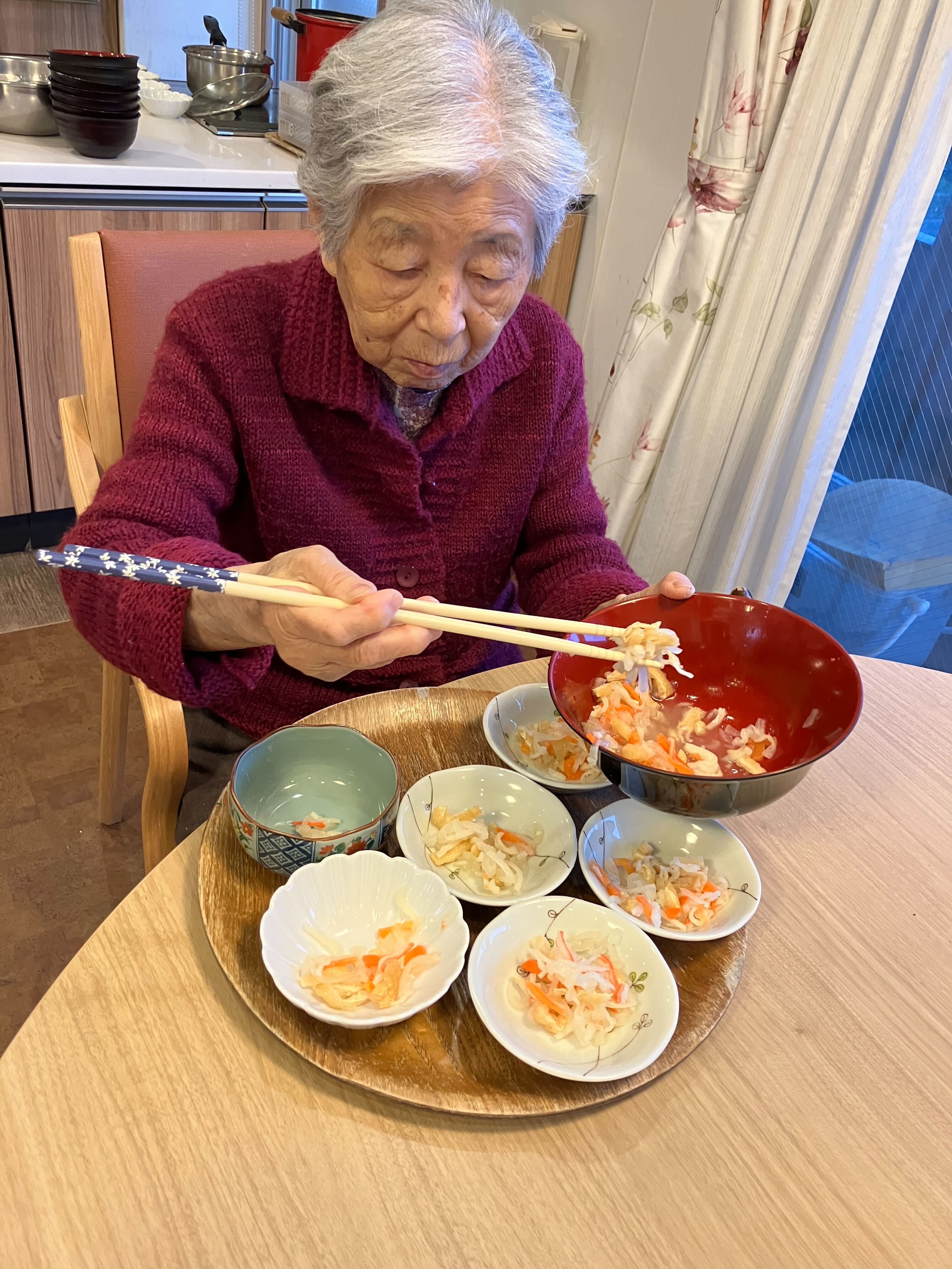 夕食のおかずの盛り付け中、A様がご自宅にいた時の料理の話を聞かせてくださいました。