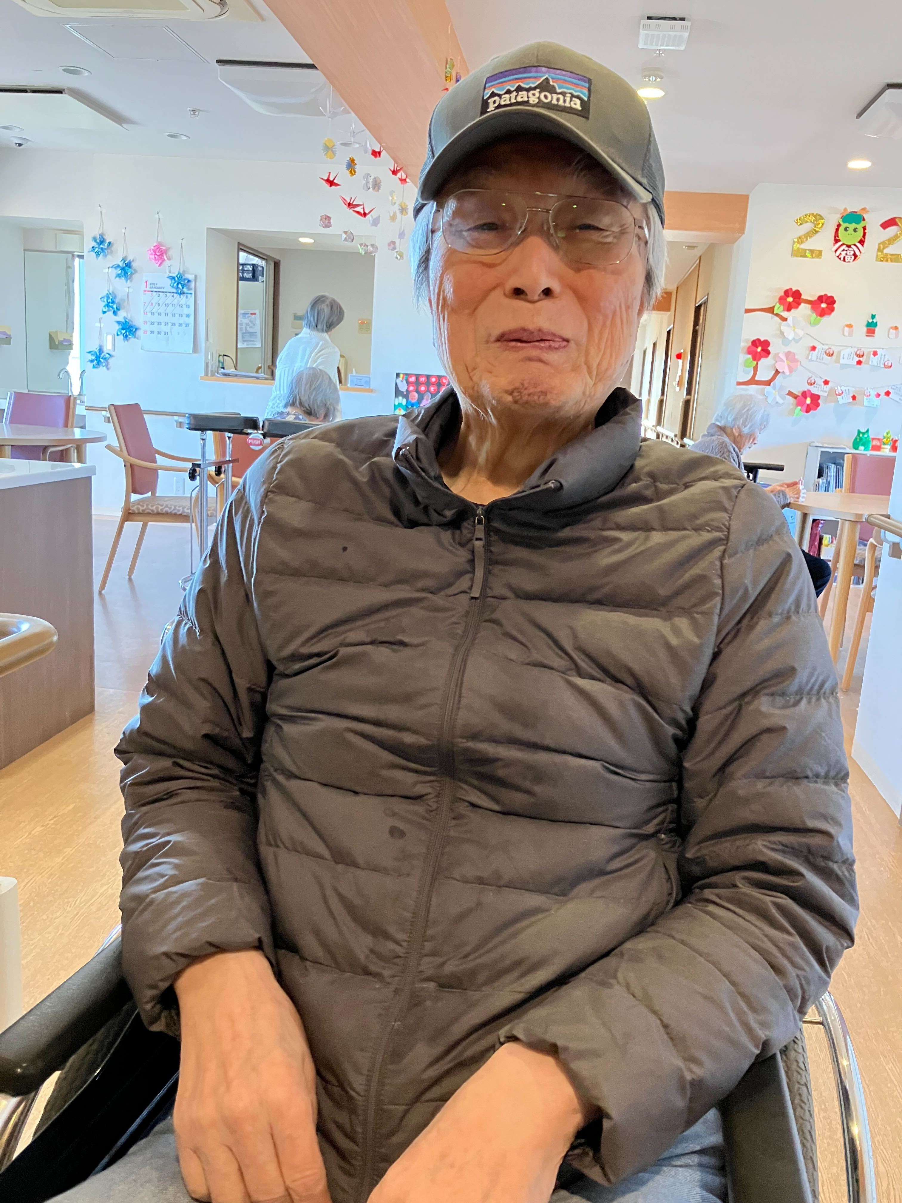 s様に散歩のお誘いすると、しばらくしてから、居室から帽子を被ってフロアに来てくださいました!