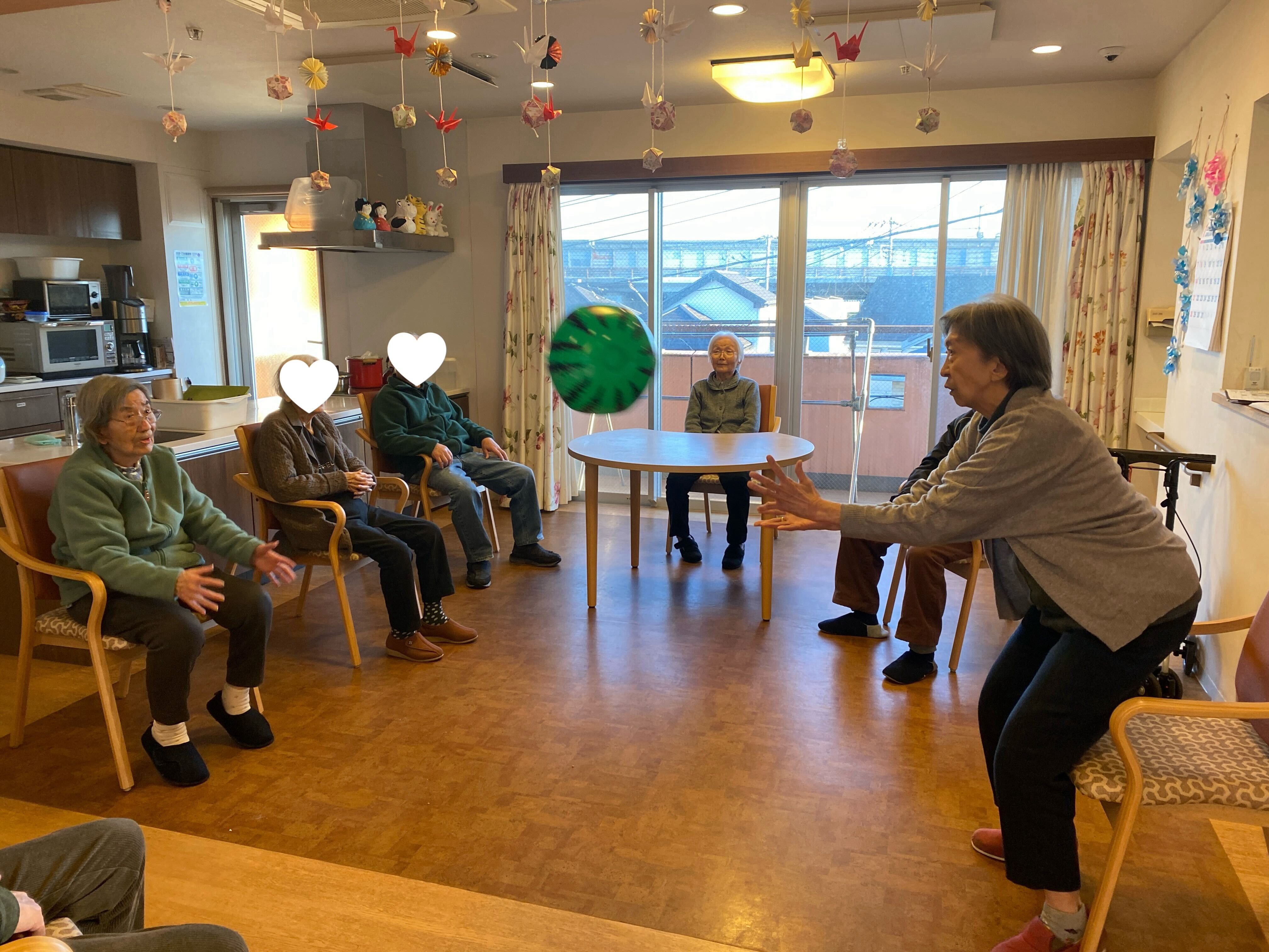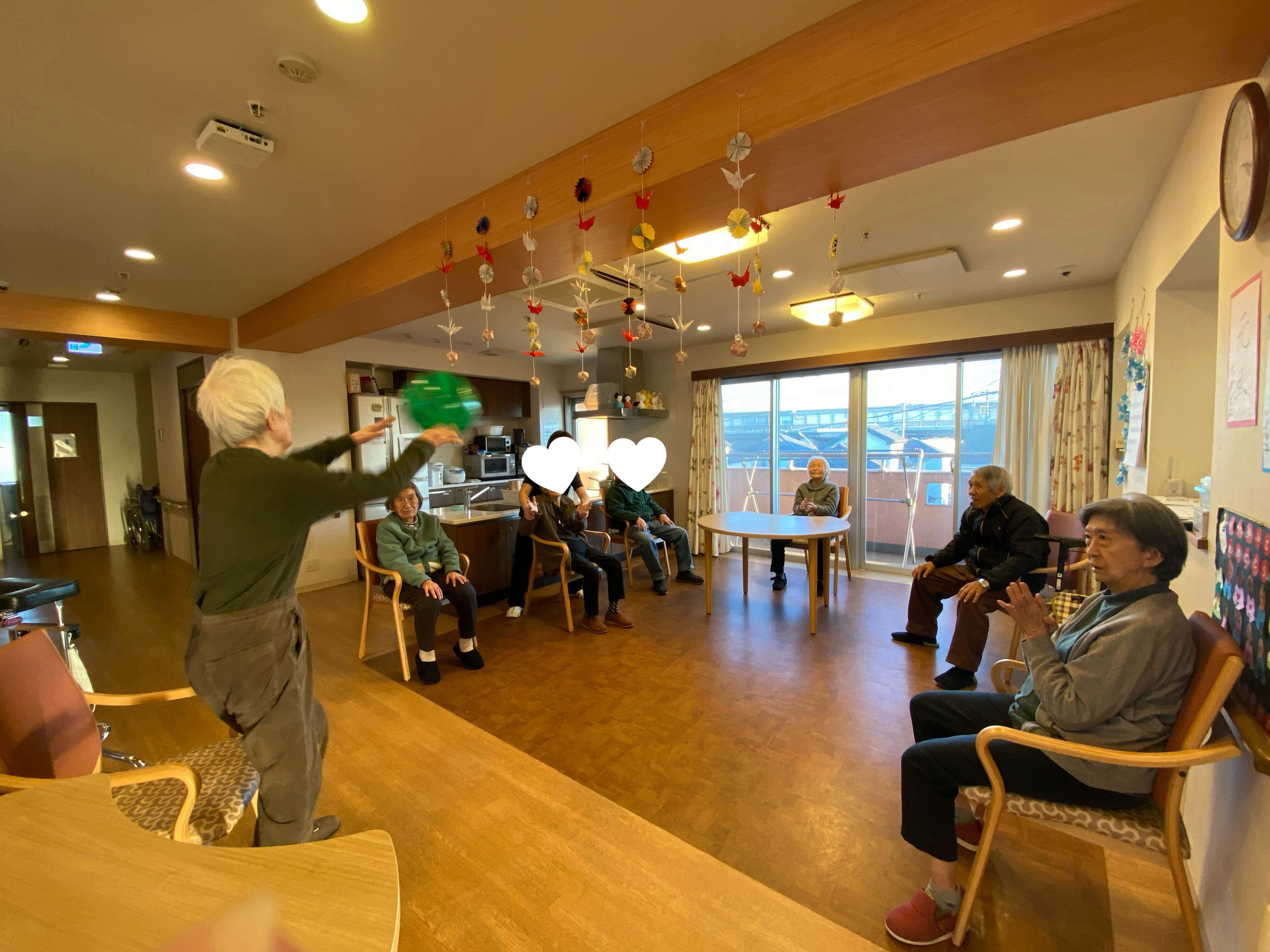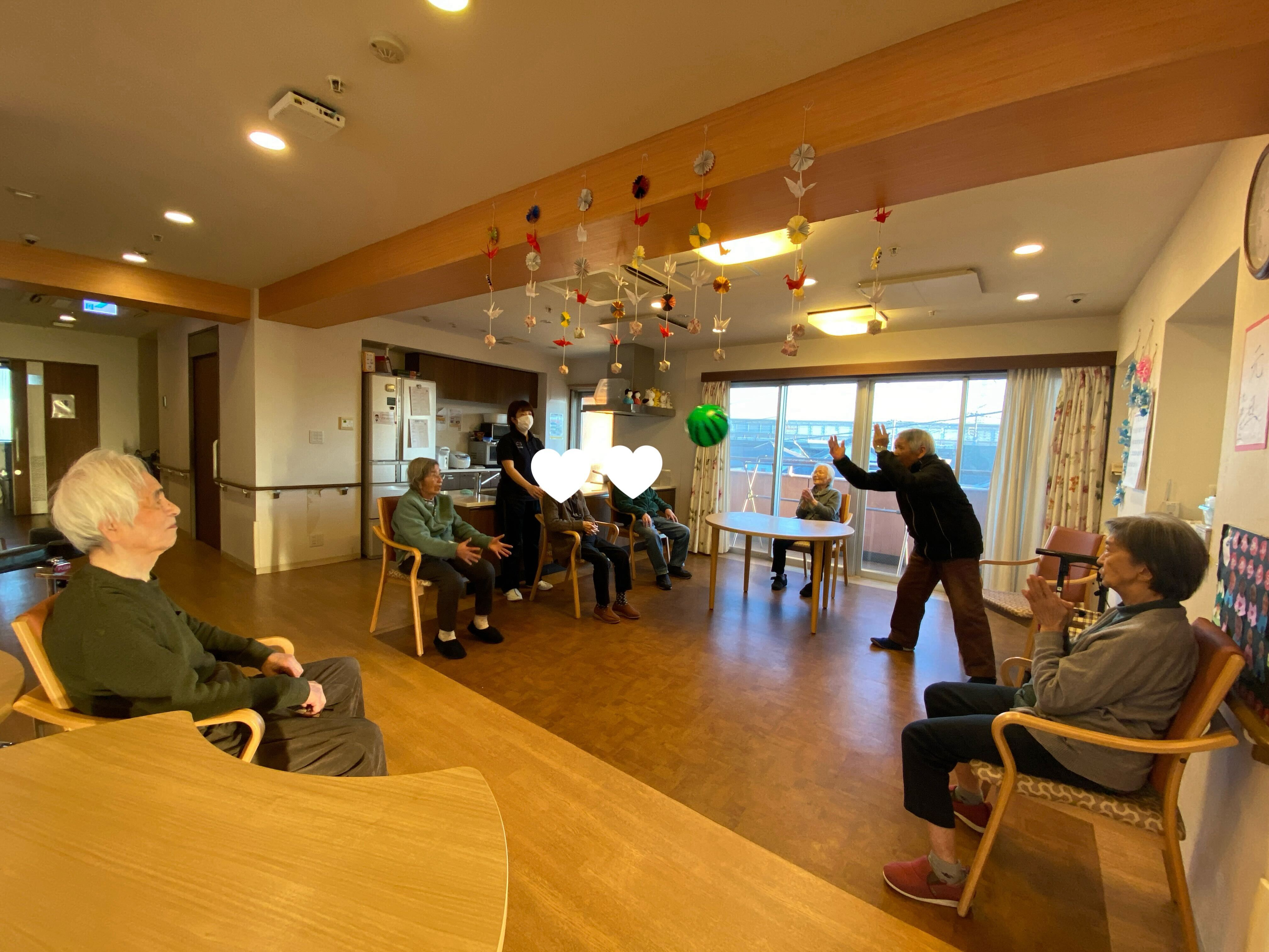 こんばんは!喜多見のご利用者はお元気にすごされています。夕食前に皆で風船バレーを行いました。