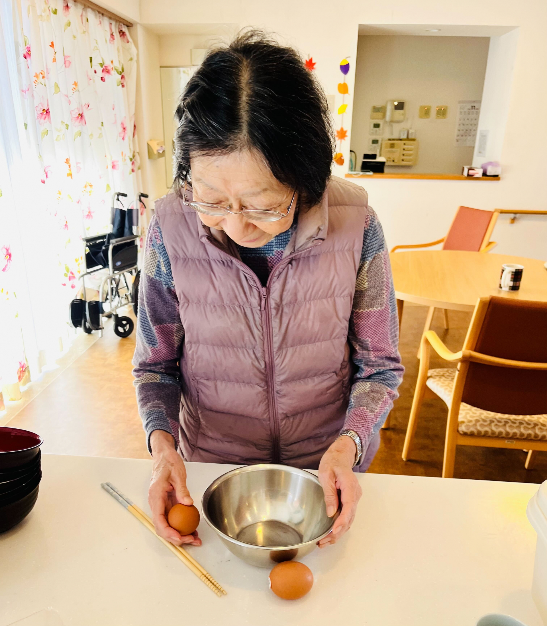 具材を切ったり、卵を溶いたり入居者様にもお手伝いいただきました。