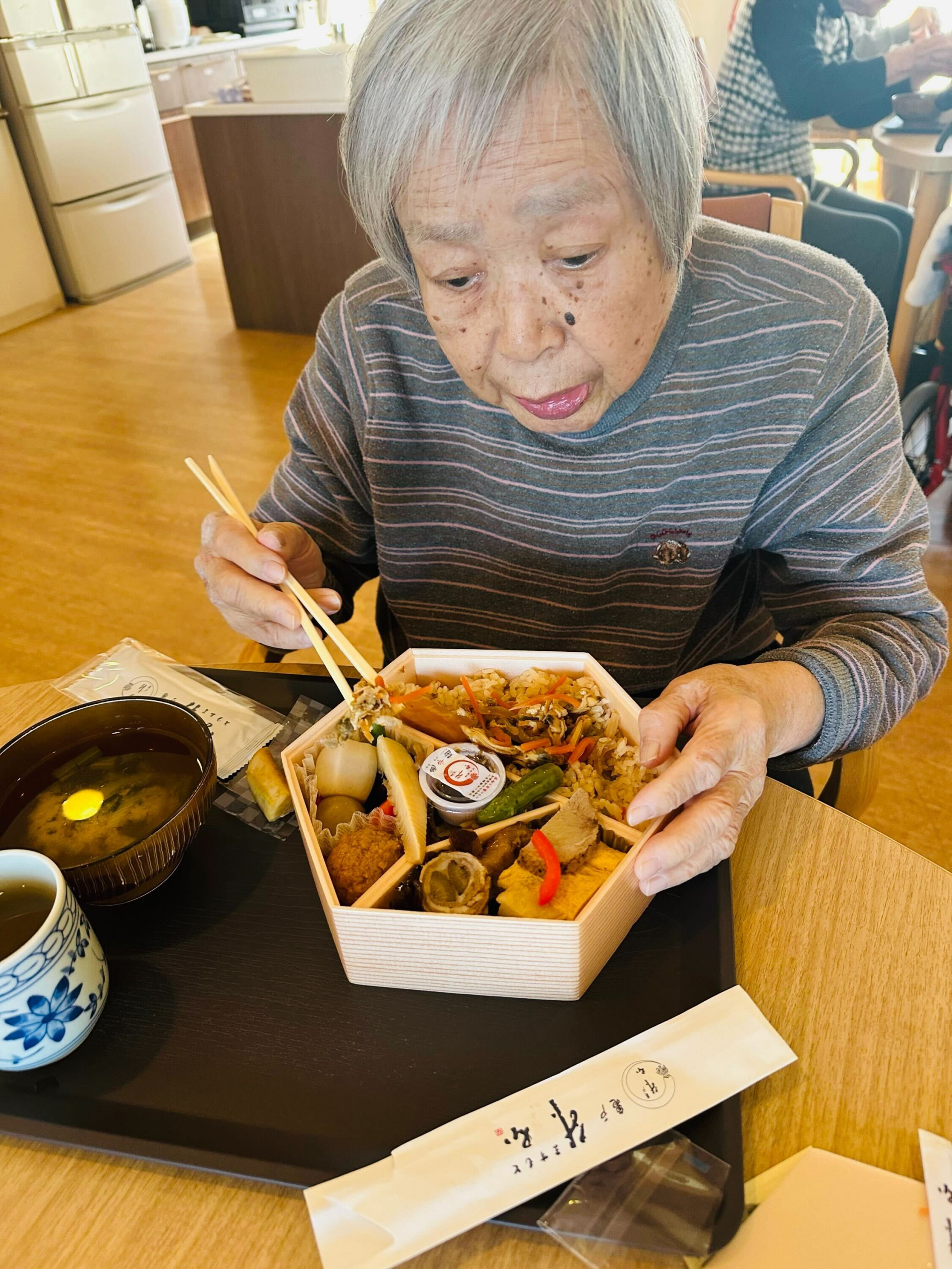 当日は、ちょっと特別な昼食をご用意し、美味しいお弁当や入居者の皆さんと作った手作りケーキでお祝いしました。