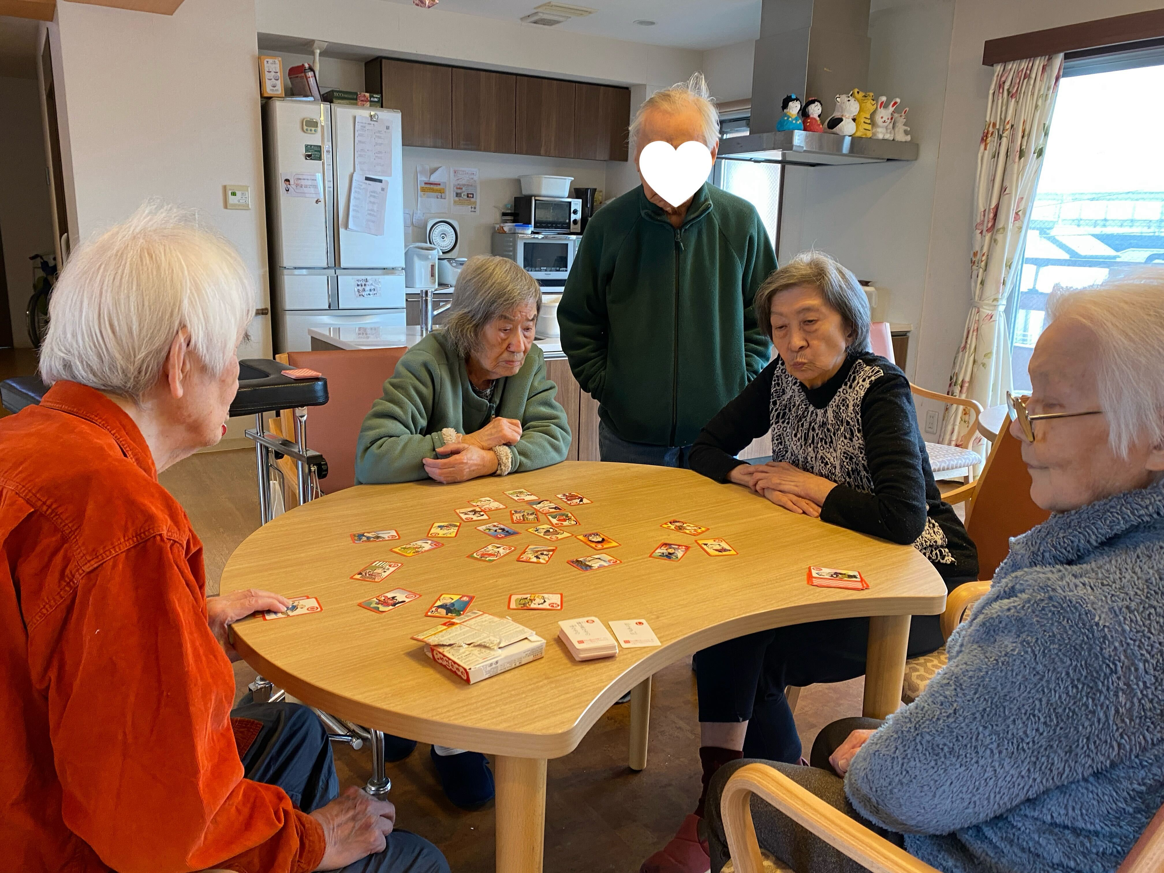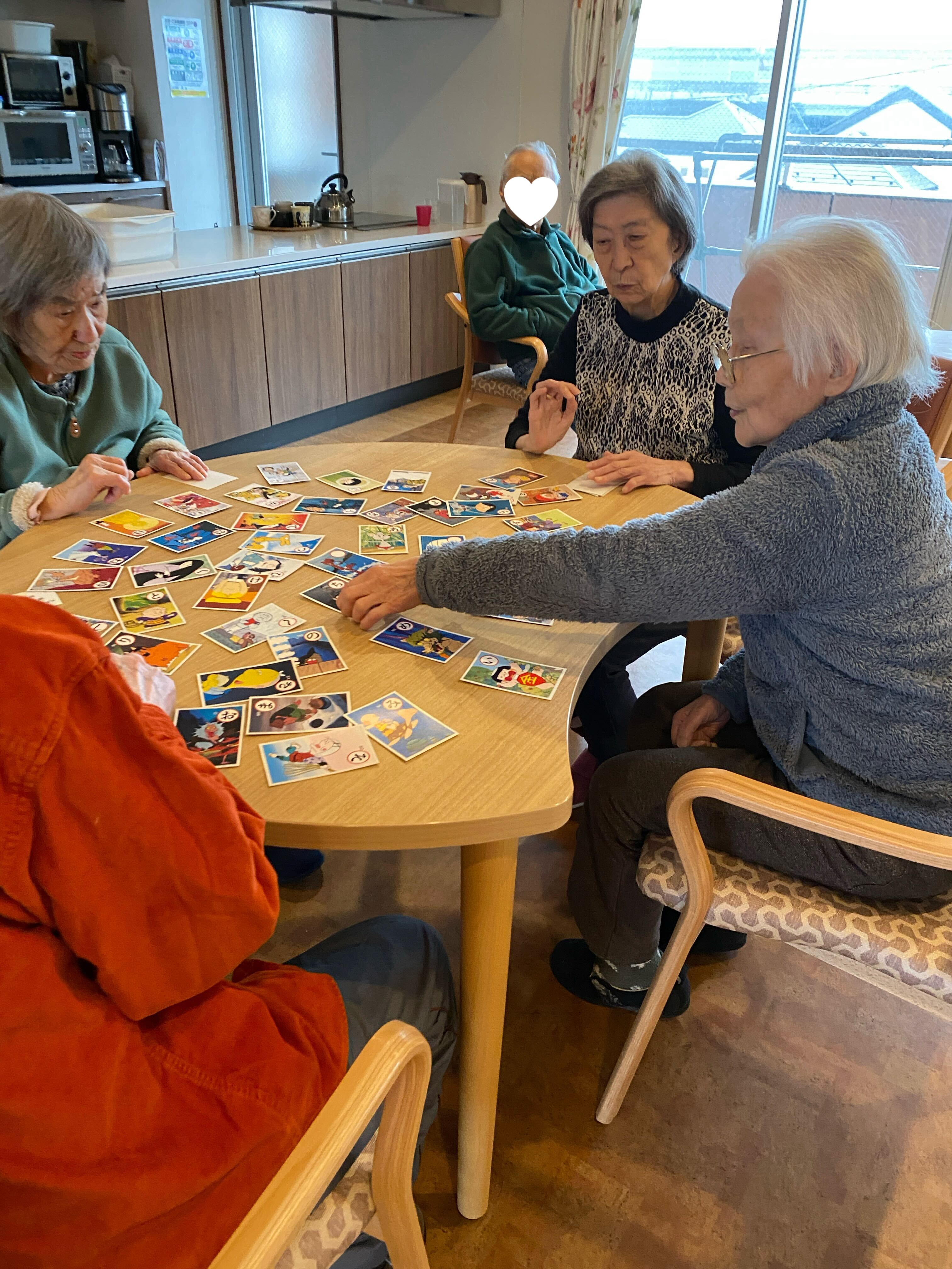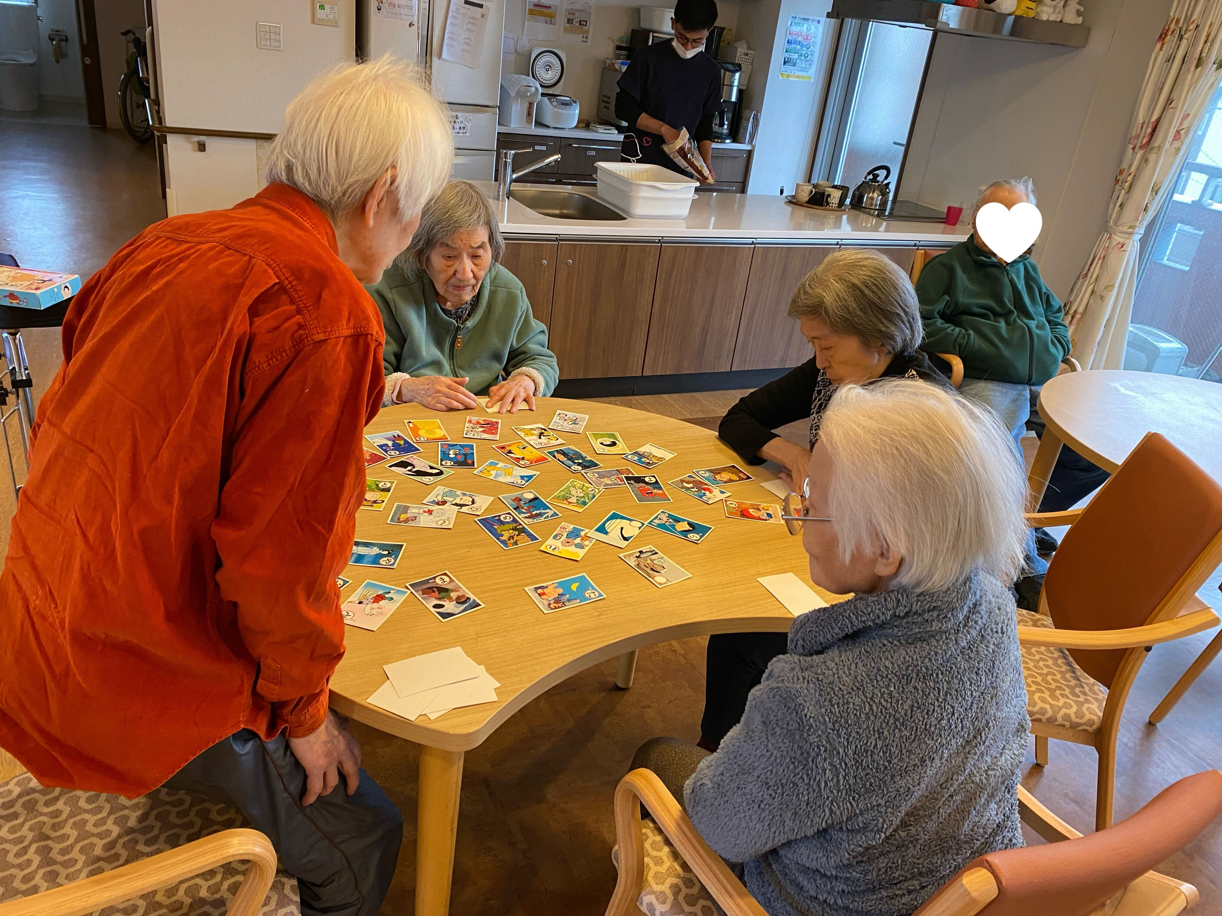 皆さまでカルタを行いました。職員が読んであげたらすぐに目の前においてあるカードーを狙って下さいました。