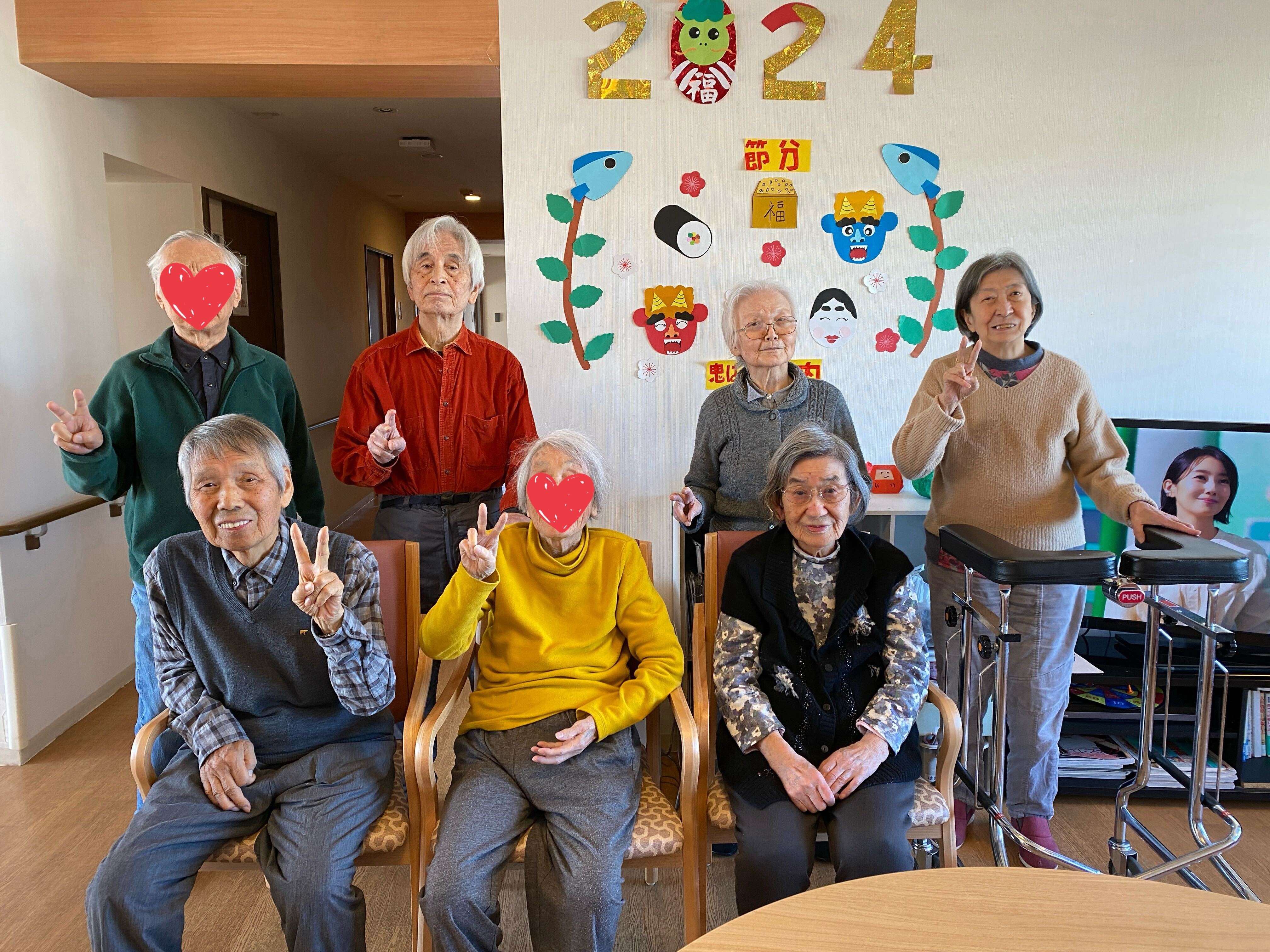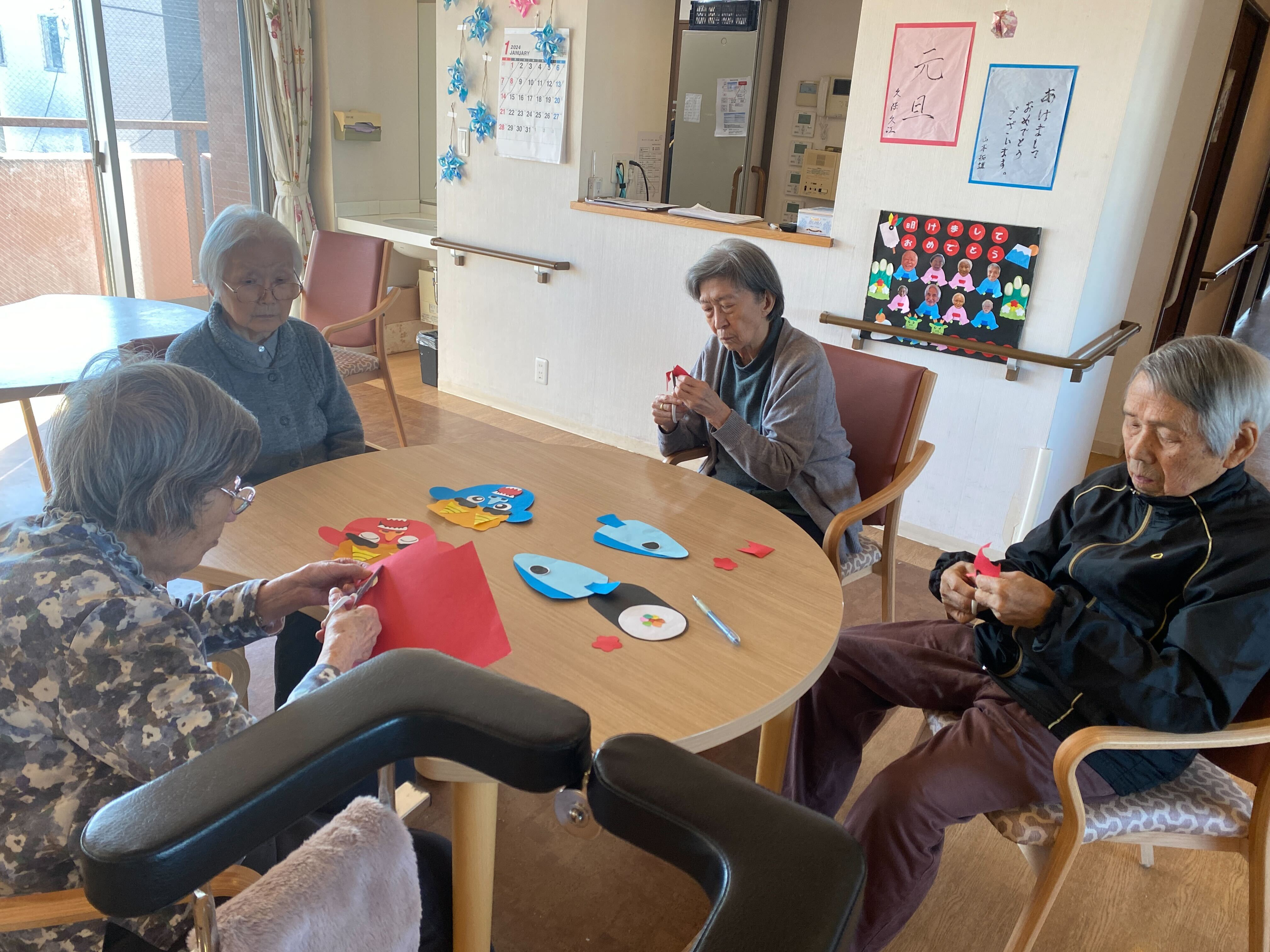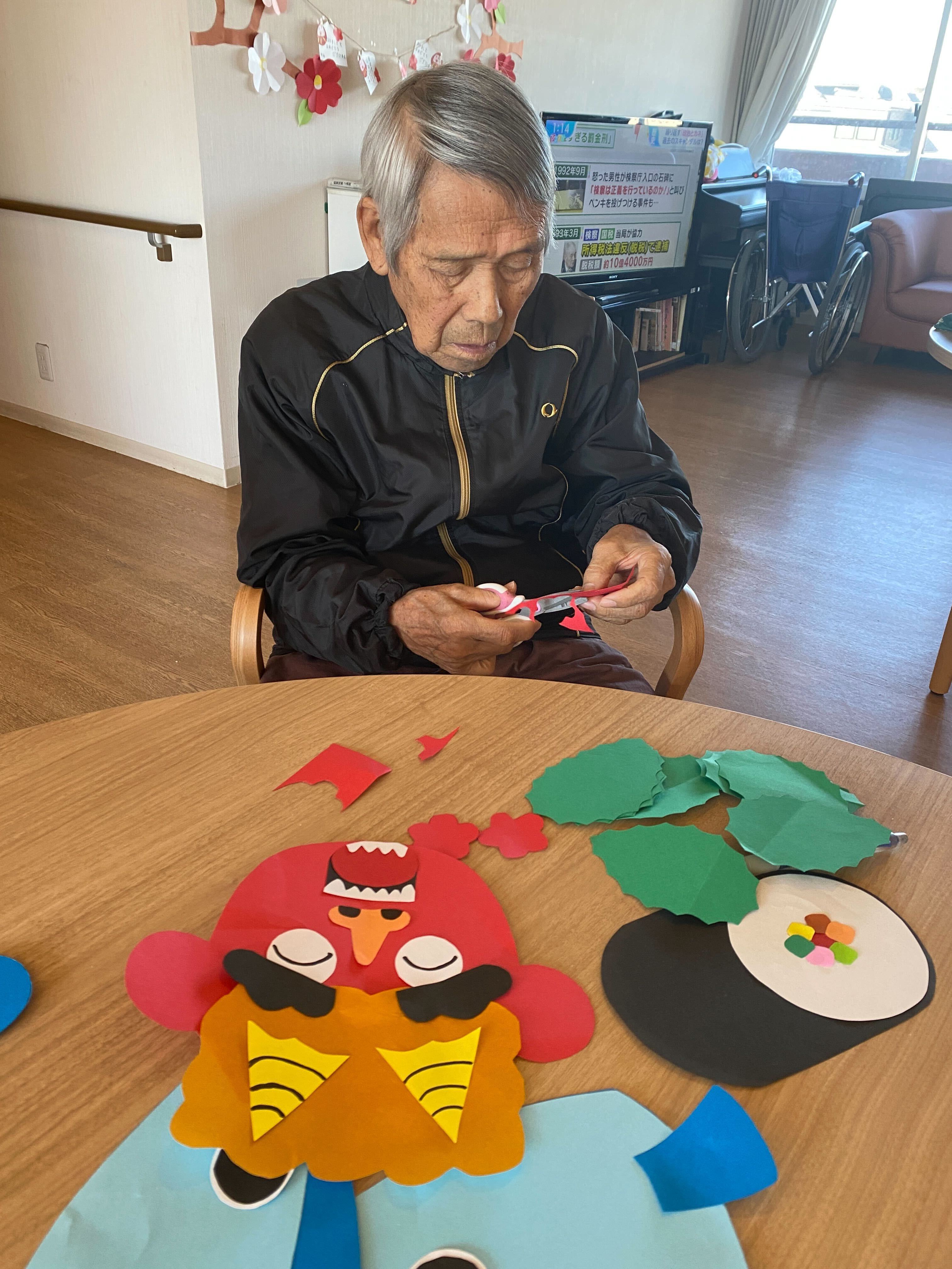 あともう少し節分なんですが皆様での節分の飾りを作ってみました。「これ切るの?」「線通りに切るの?」「これでいいですねぇ、どういいか?」と職員に話しかけられました。「これはかわいい鬼だねぇ、節分は何かあるの」「おにがくるの?まめ用意している?と盛り上がりで言ってました(^^♪