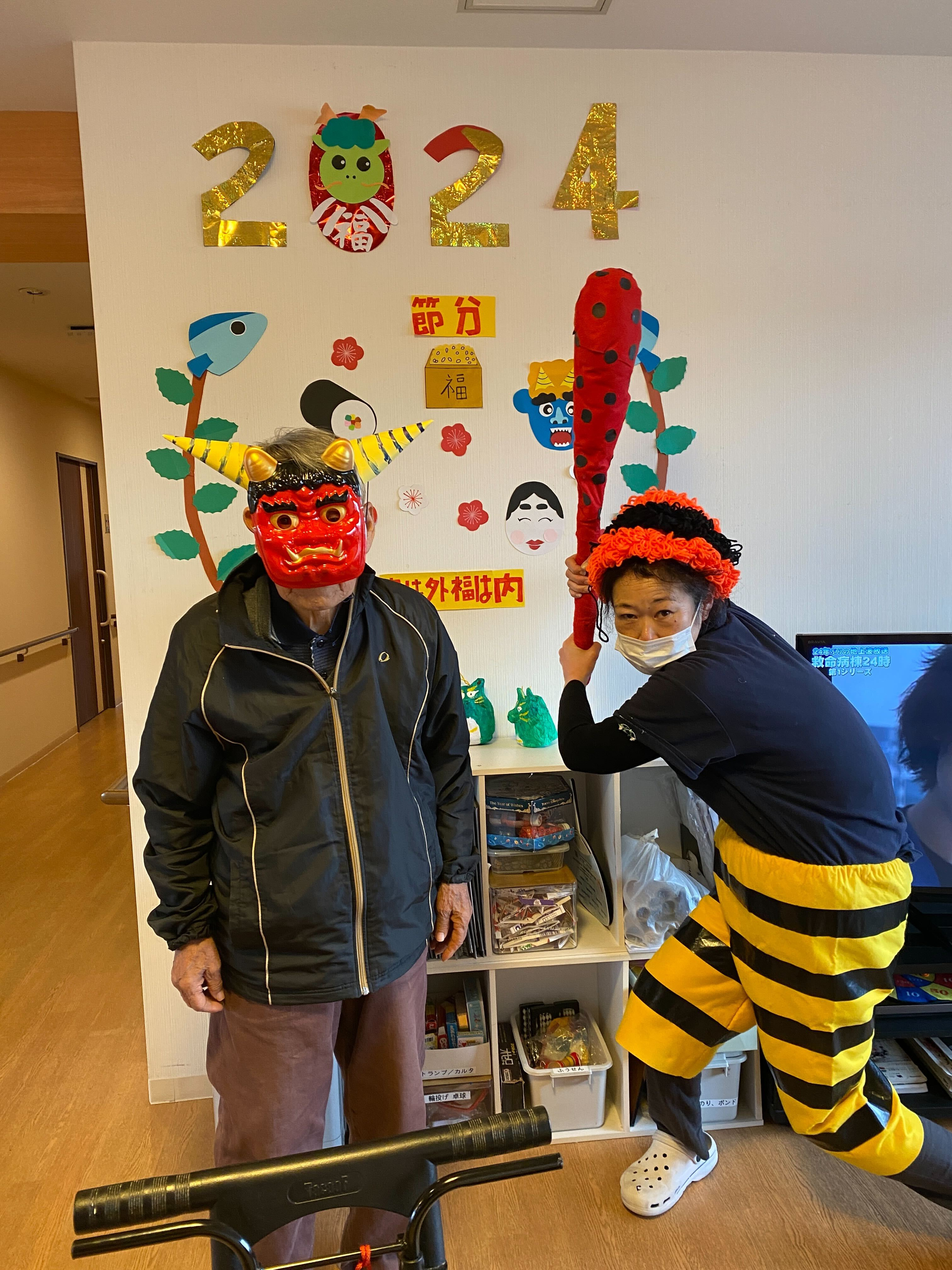 早いですが今日3階で節分祭を行いました。今年は職員やご利用者のY様が鬼になってくれました。「怖い鬼になるから、よしよしやろうぜ」とY様が大笑いに言ってました。(^^♪