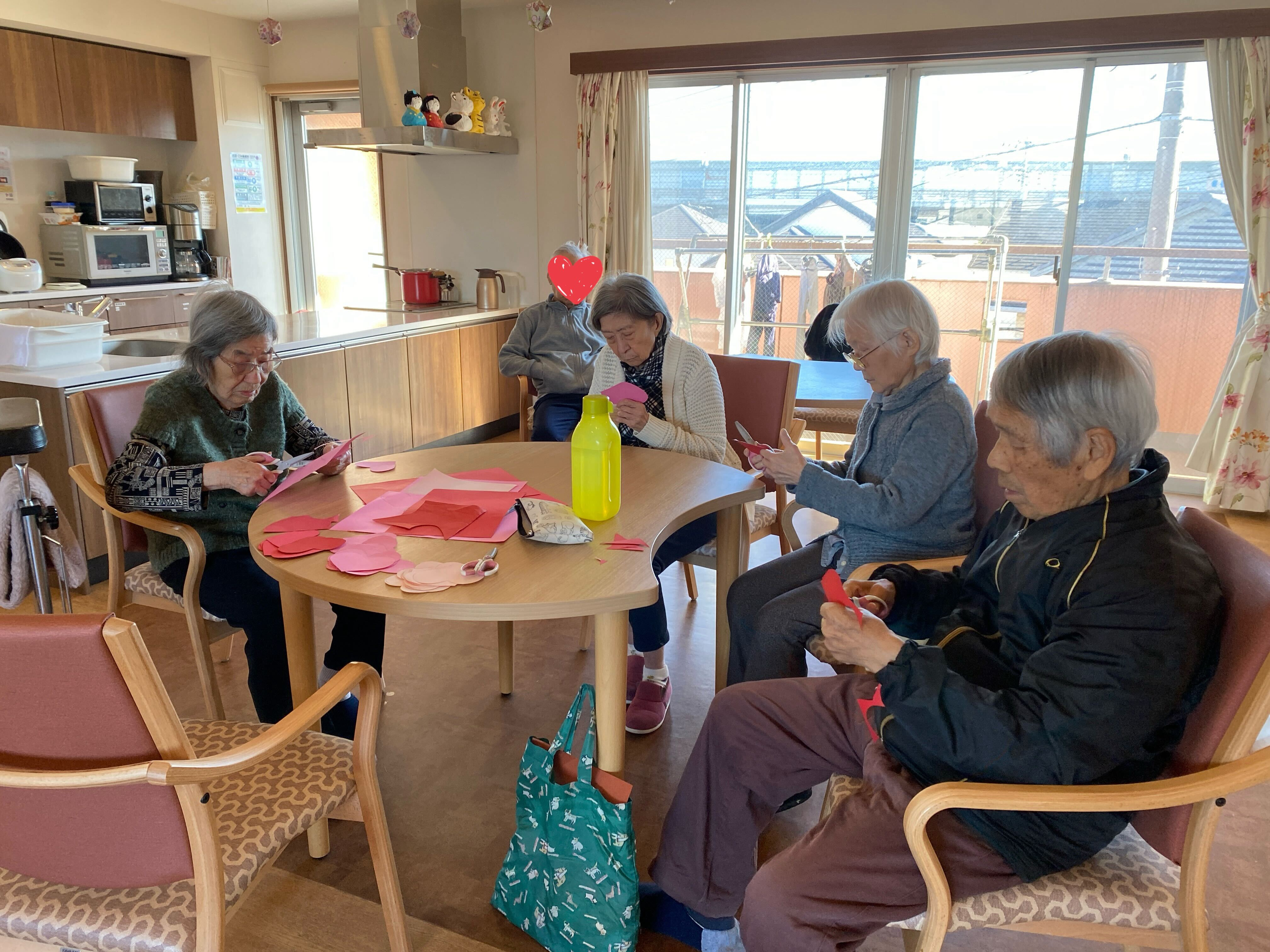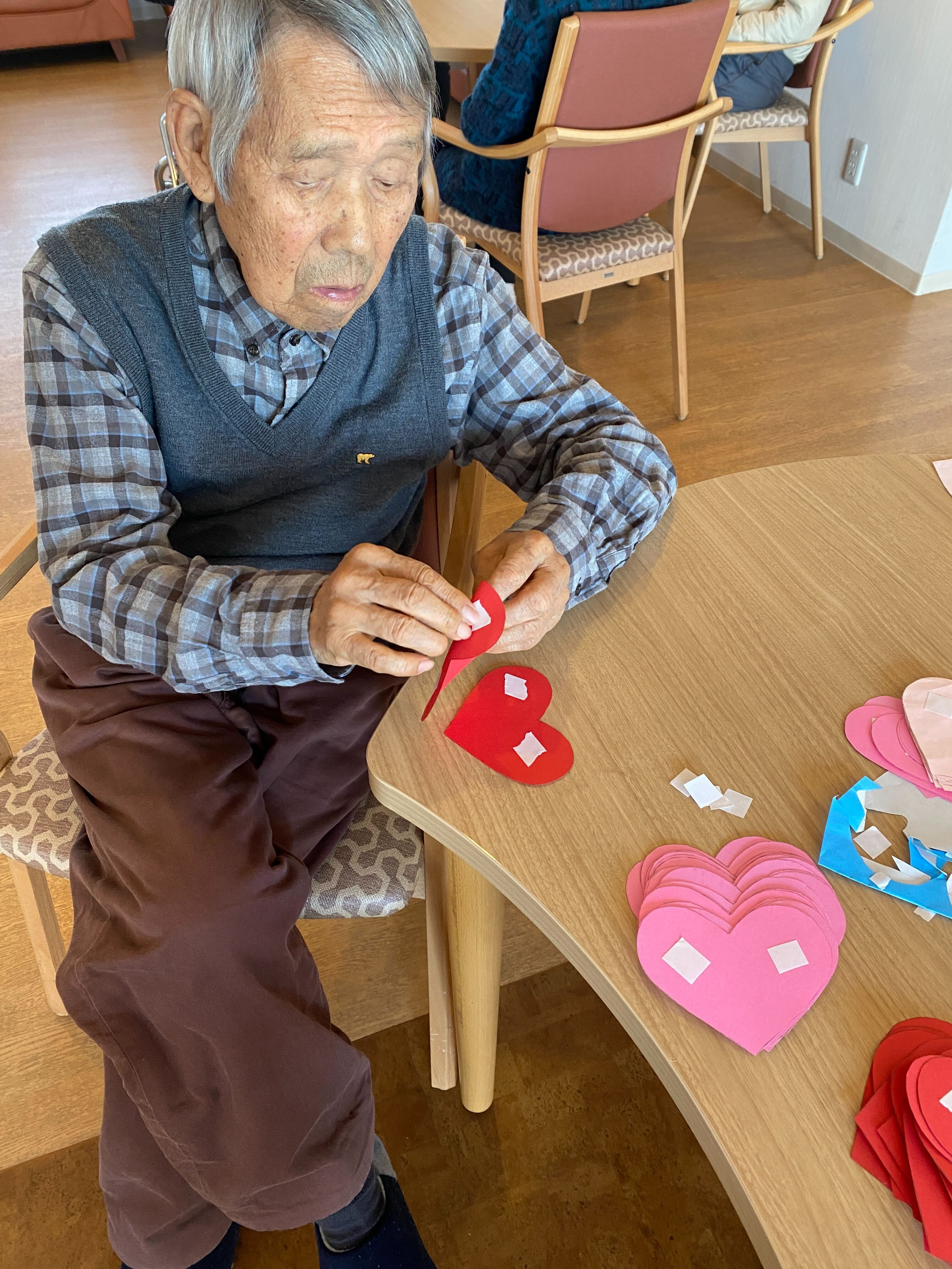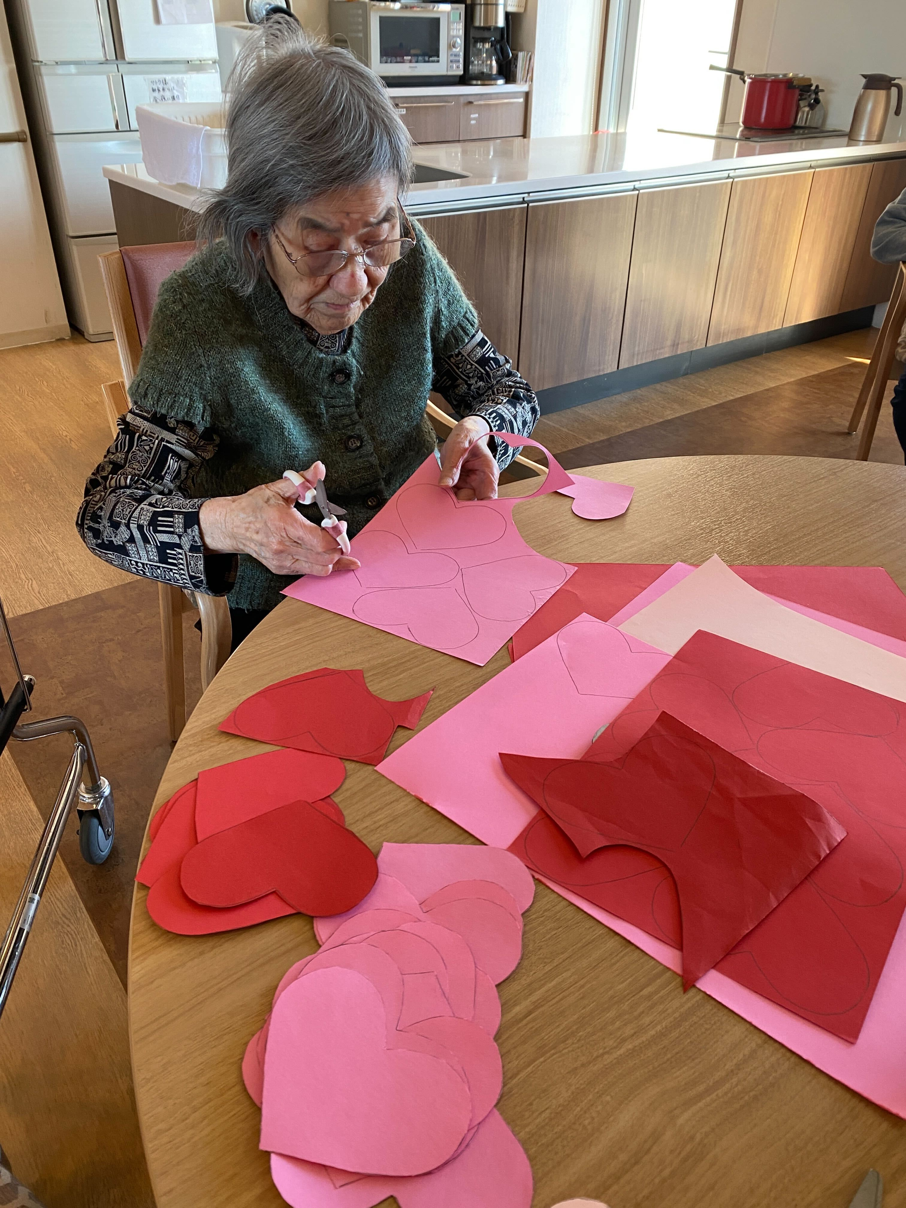 そろそろバレンタインになるので、みんなでのバレンタインの飾りを作ってみました。「ええ?バレンタインなの?」「チョコレートもらえるかな?」「素敵なハートだねぇ、可愛すぎて~」「これってはがすの?」と会話をするも手が止まらなく真剣にやってくれました。