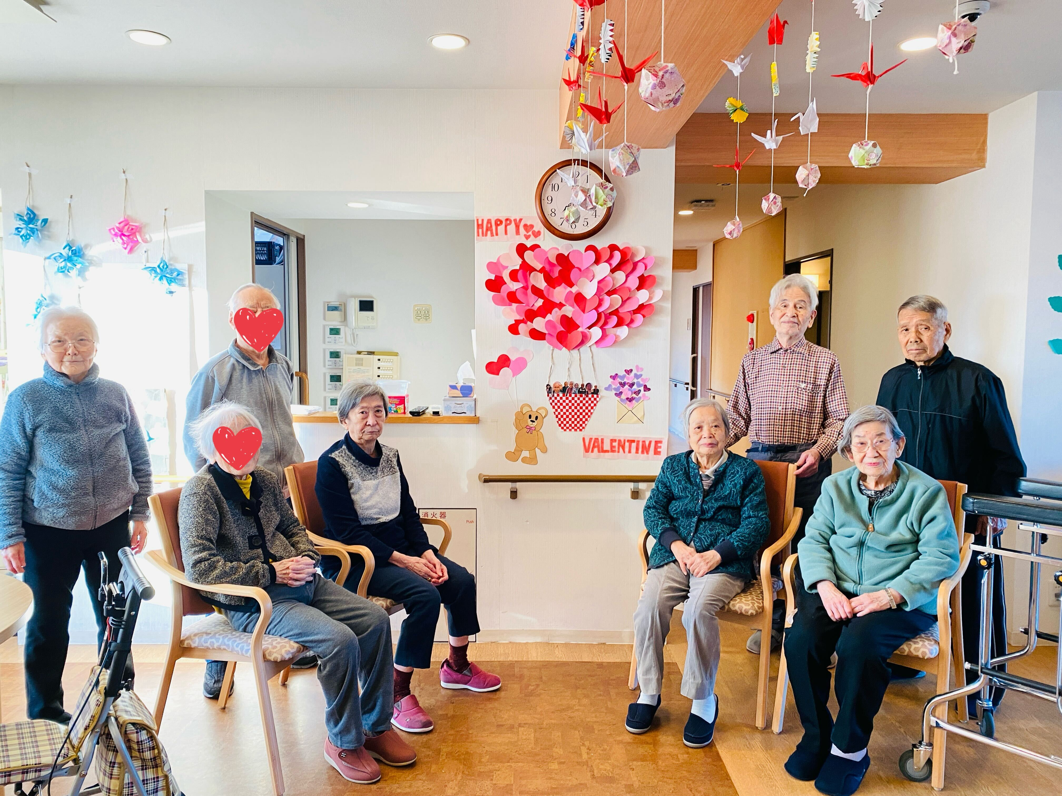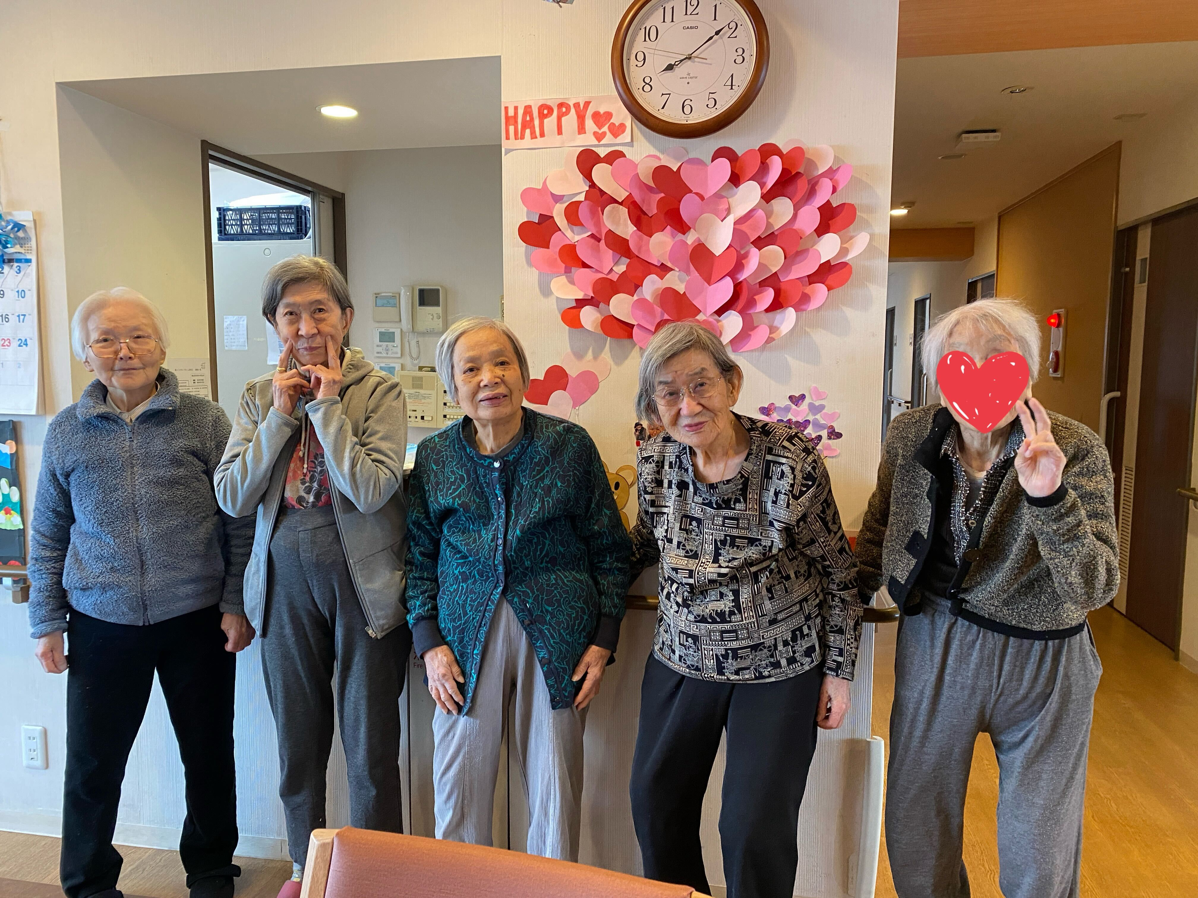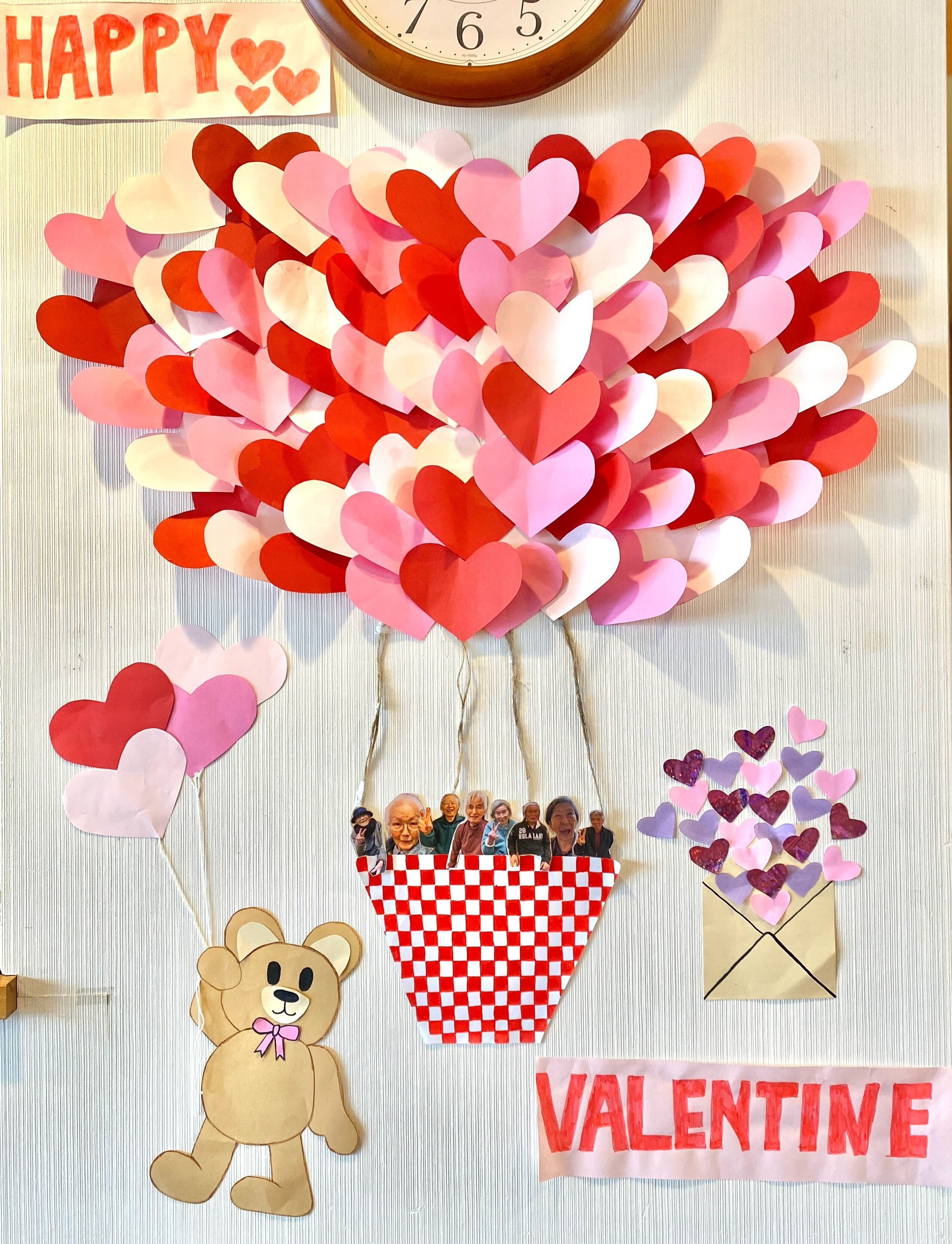 そろそろバレンタインになるので、みんなでのバレンタインの飾りを作ってみました。「ええ?バレンタインなの?」「チョコレートもらえるかな?」「素敵なハートだねぇ、可愛すぎて~」「これってはがすの?」と会話をするも手が止まらなく真剣にやってくれました。