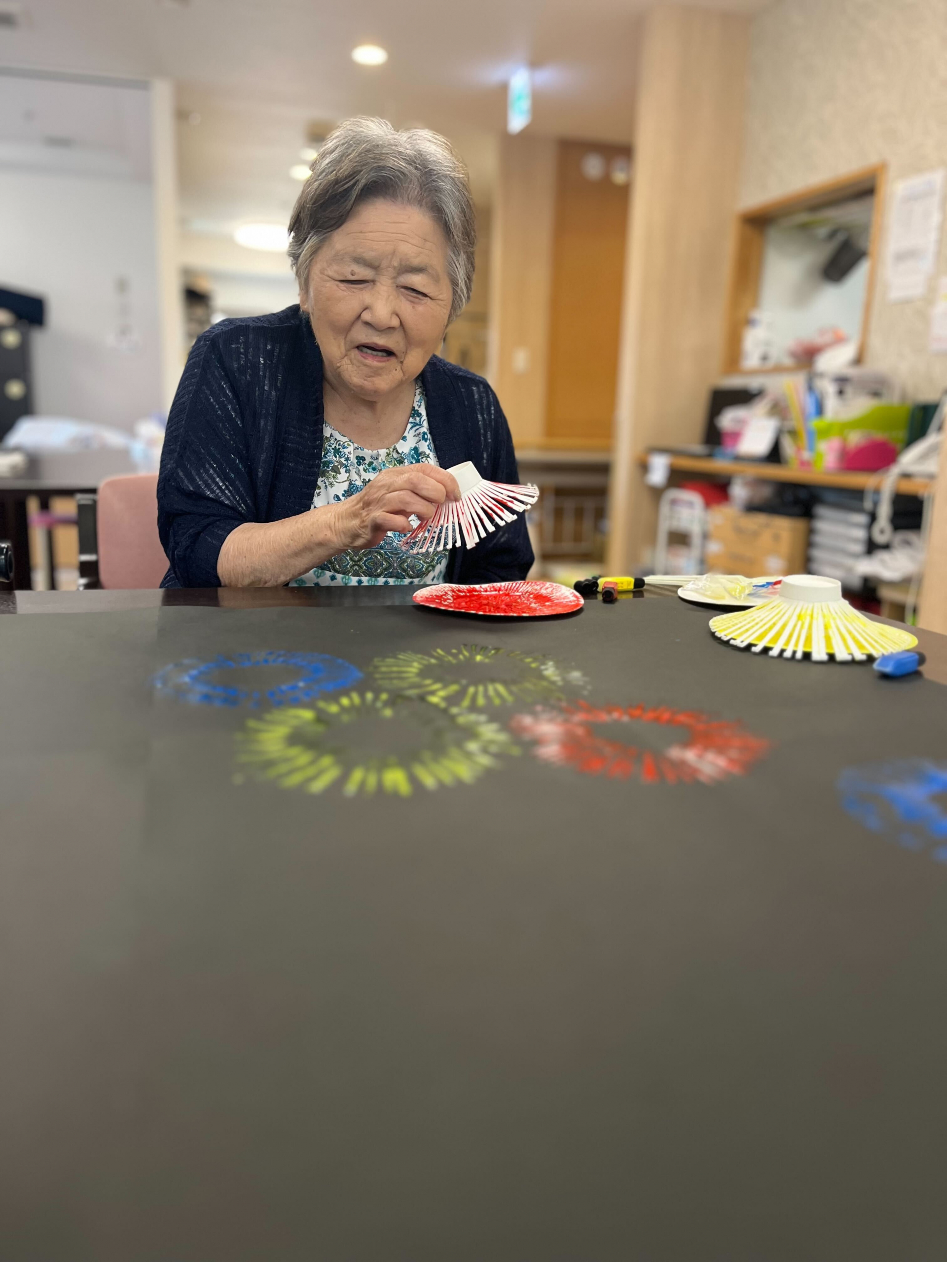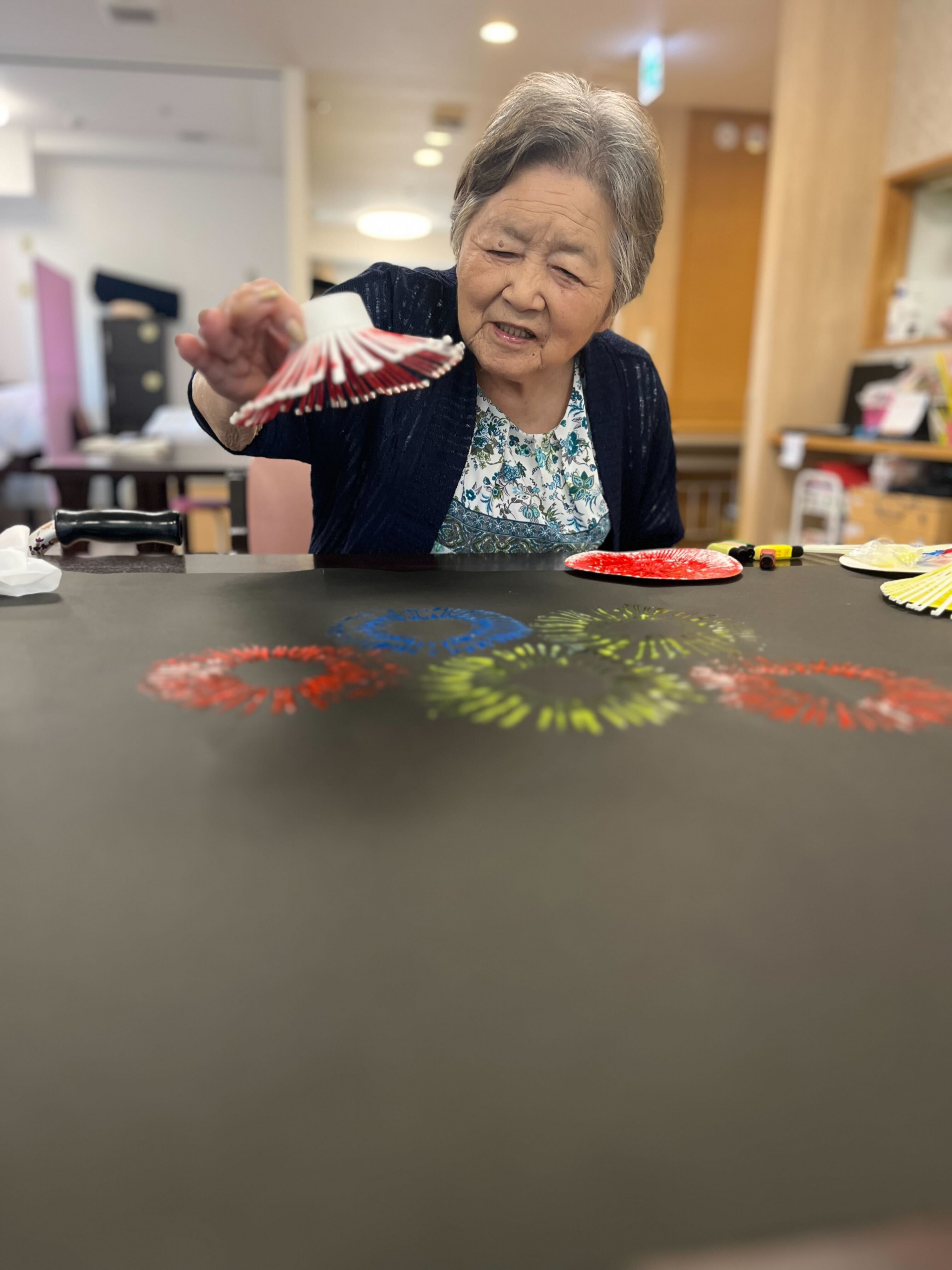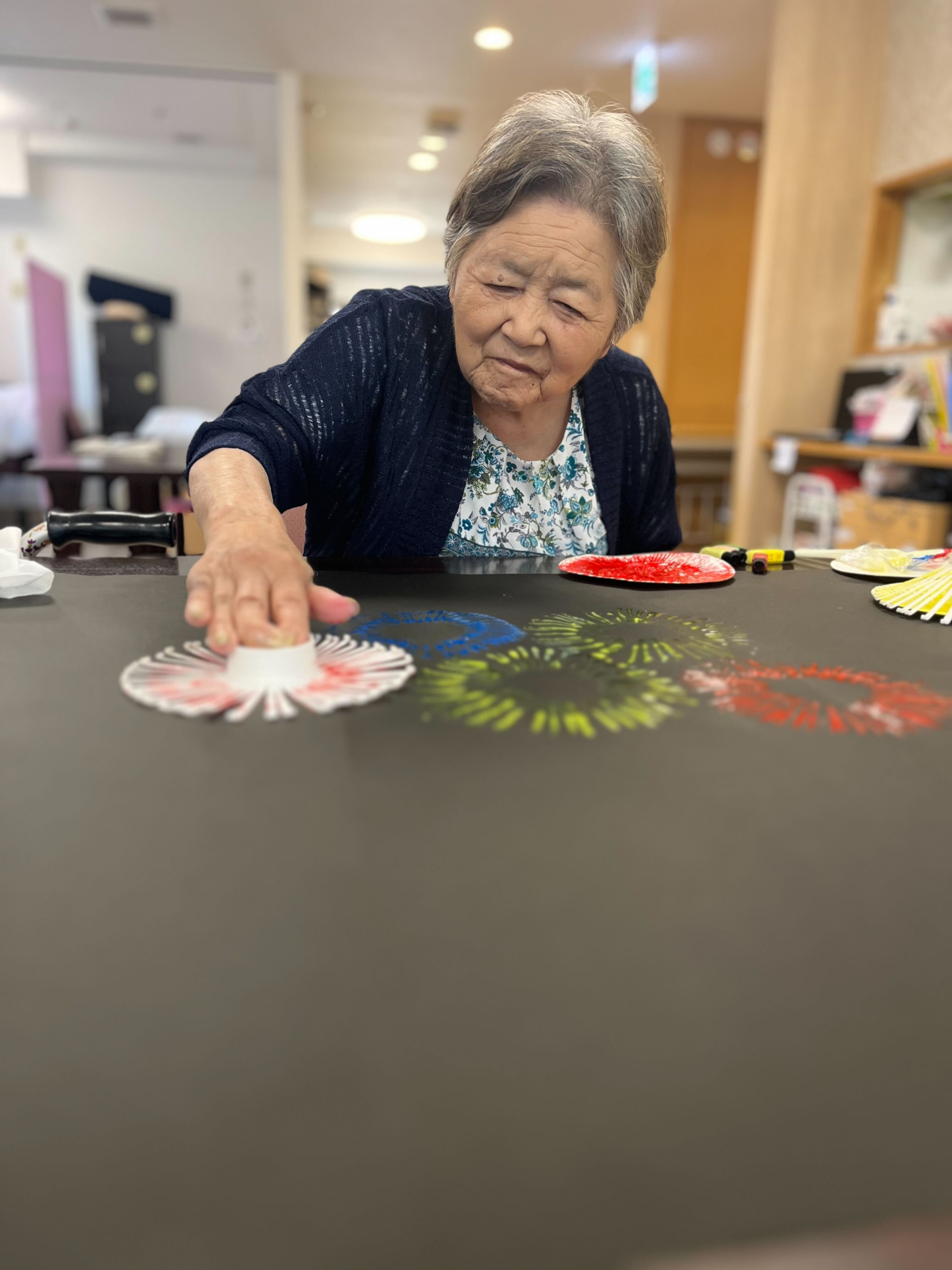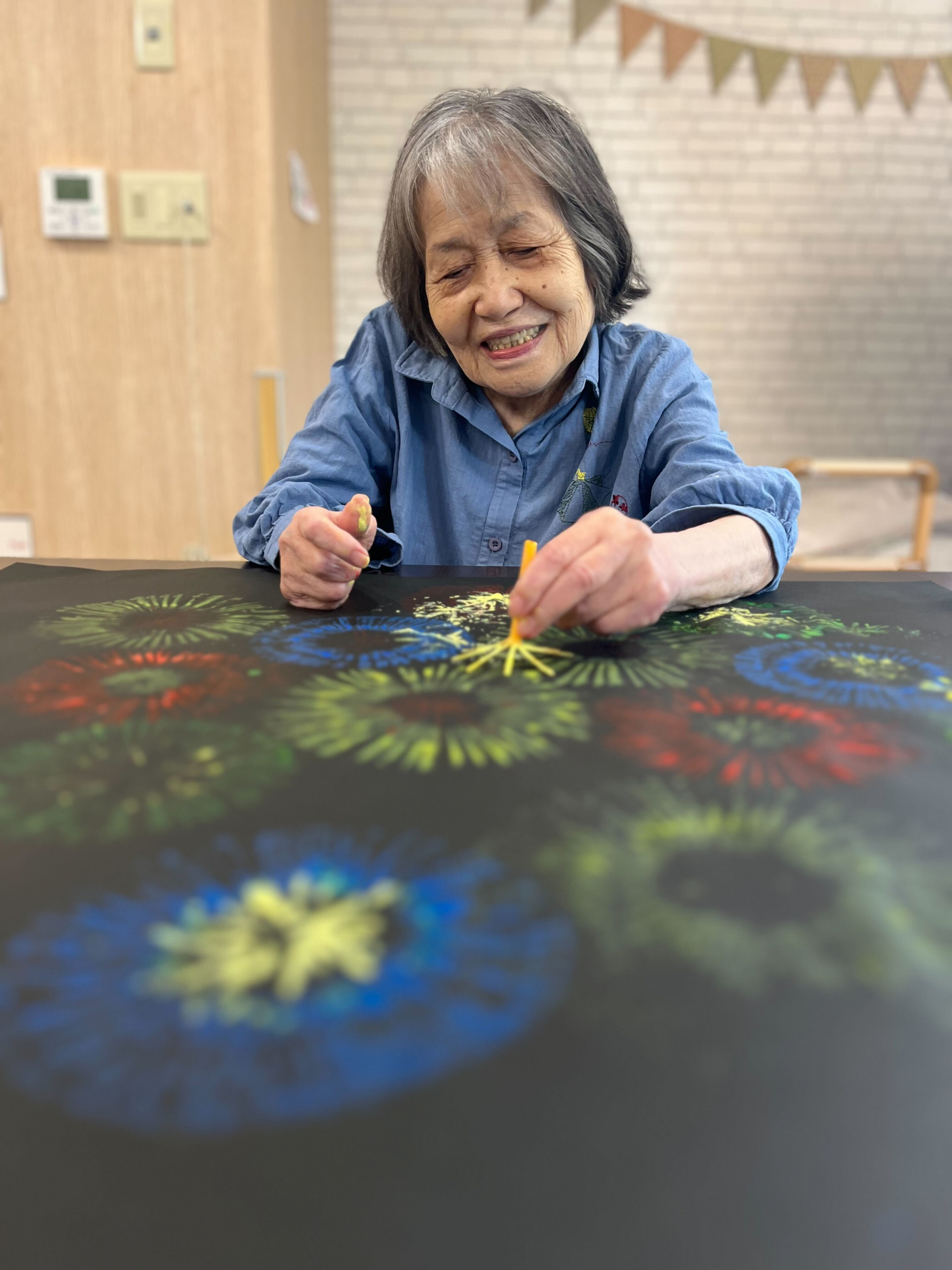 ストロー、アクリル絵の具、黒の画用紙でN様やY様と一緒に花火を打ち上げました。