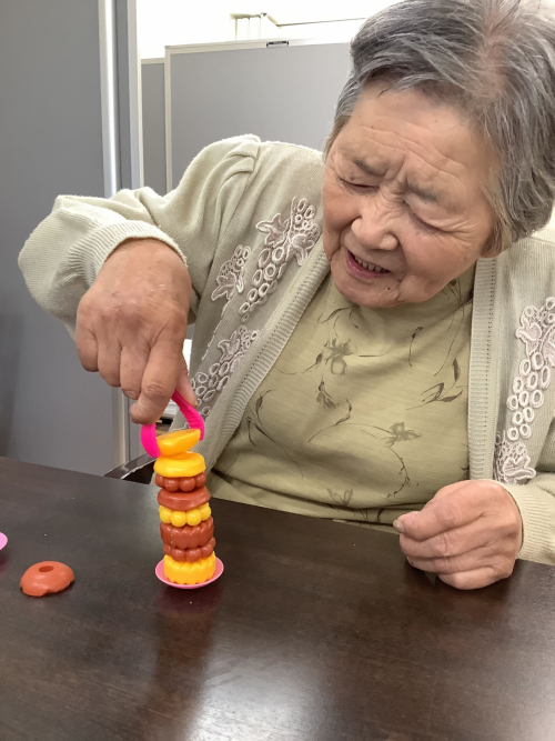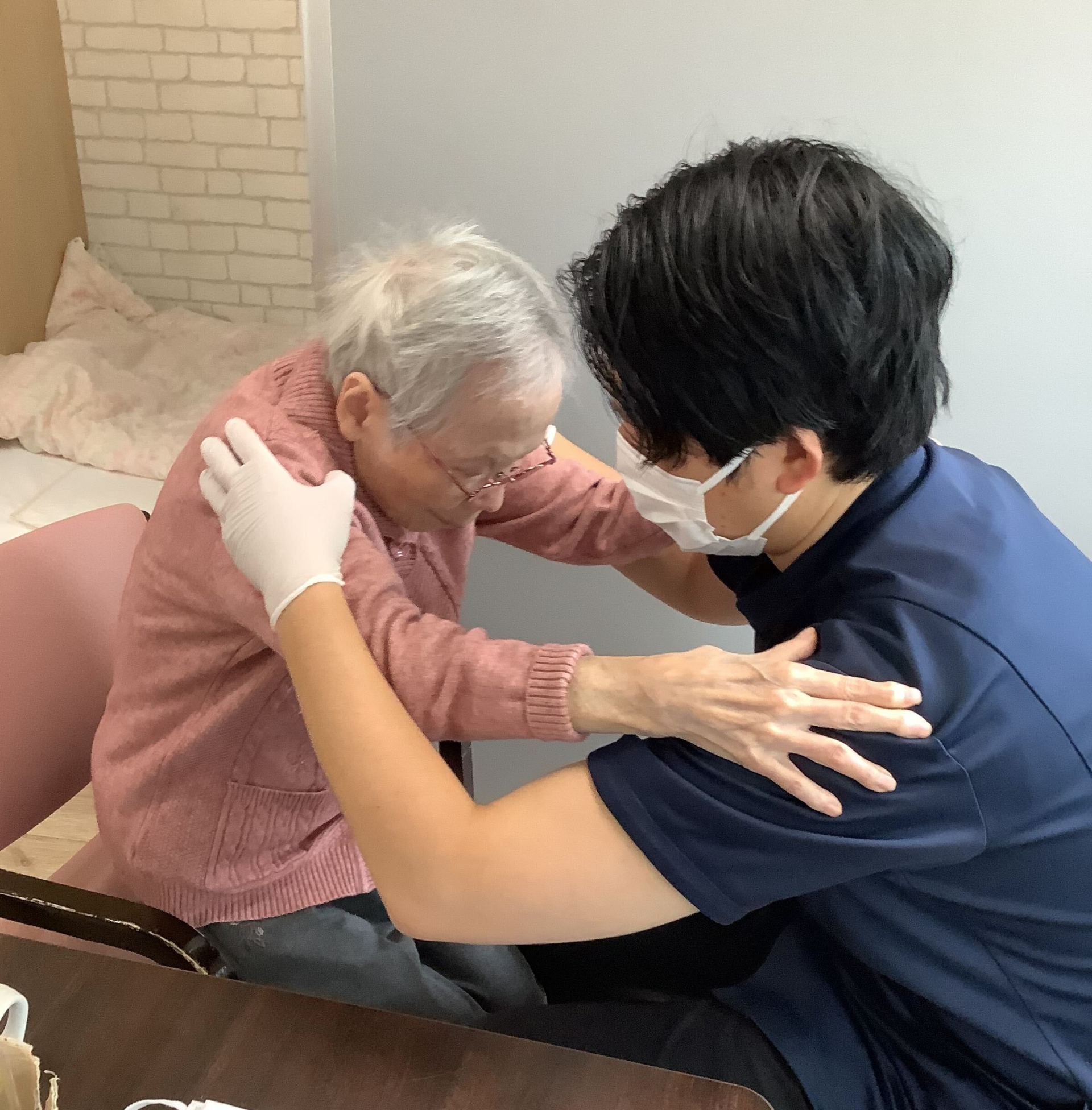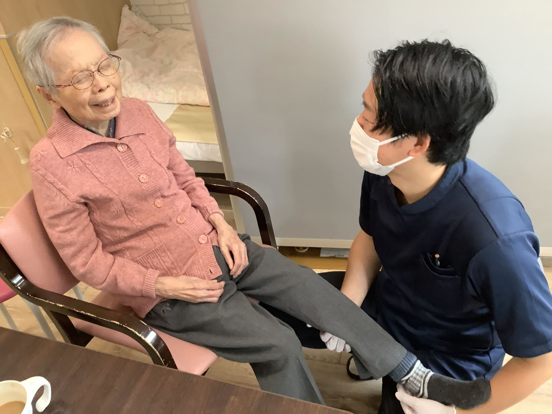利用者S様と歩行練習する前に椅子座位で両足後面筋のストレッチや足の筋力強化のエクササイズを行っております。