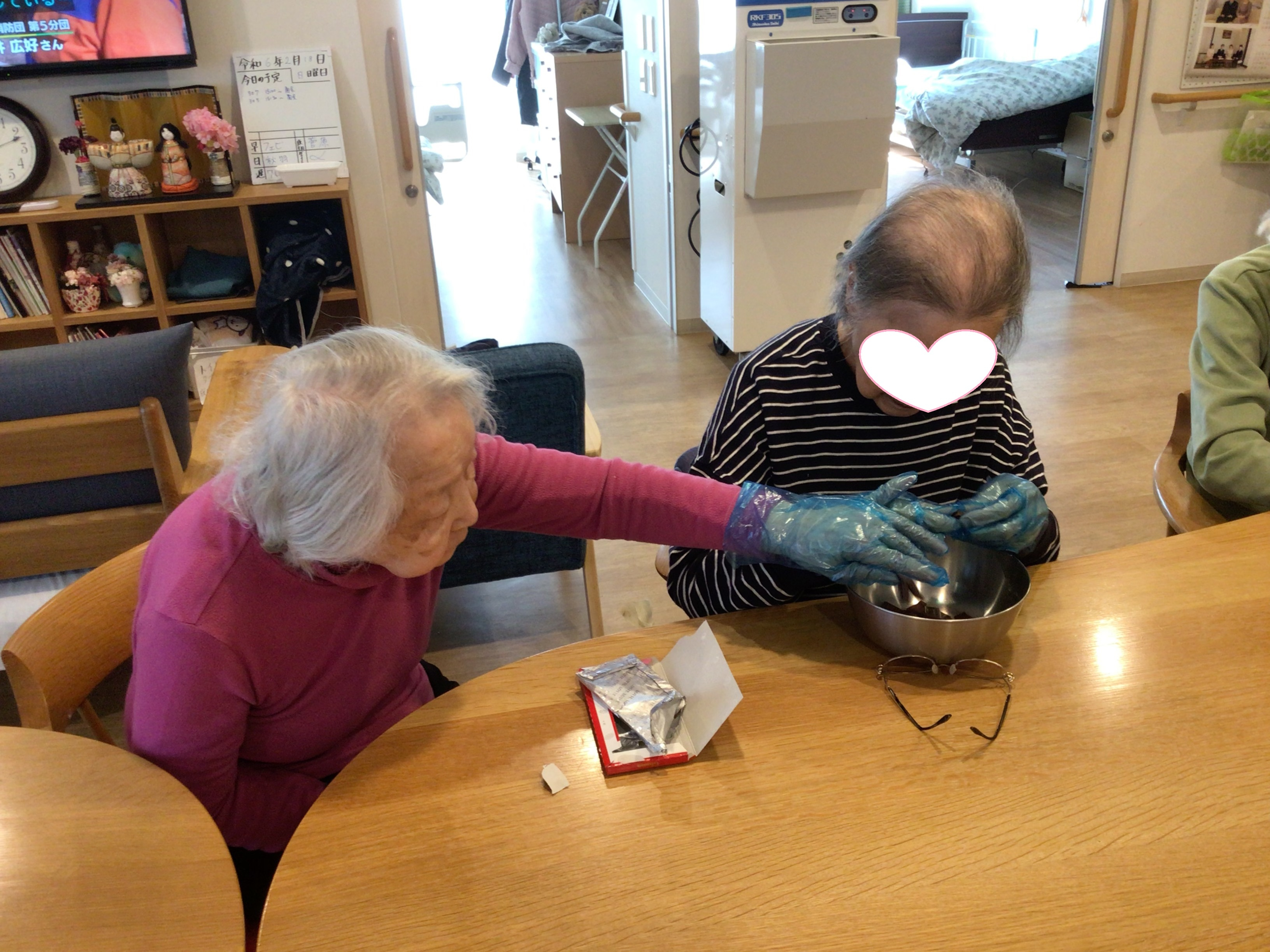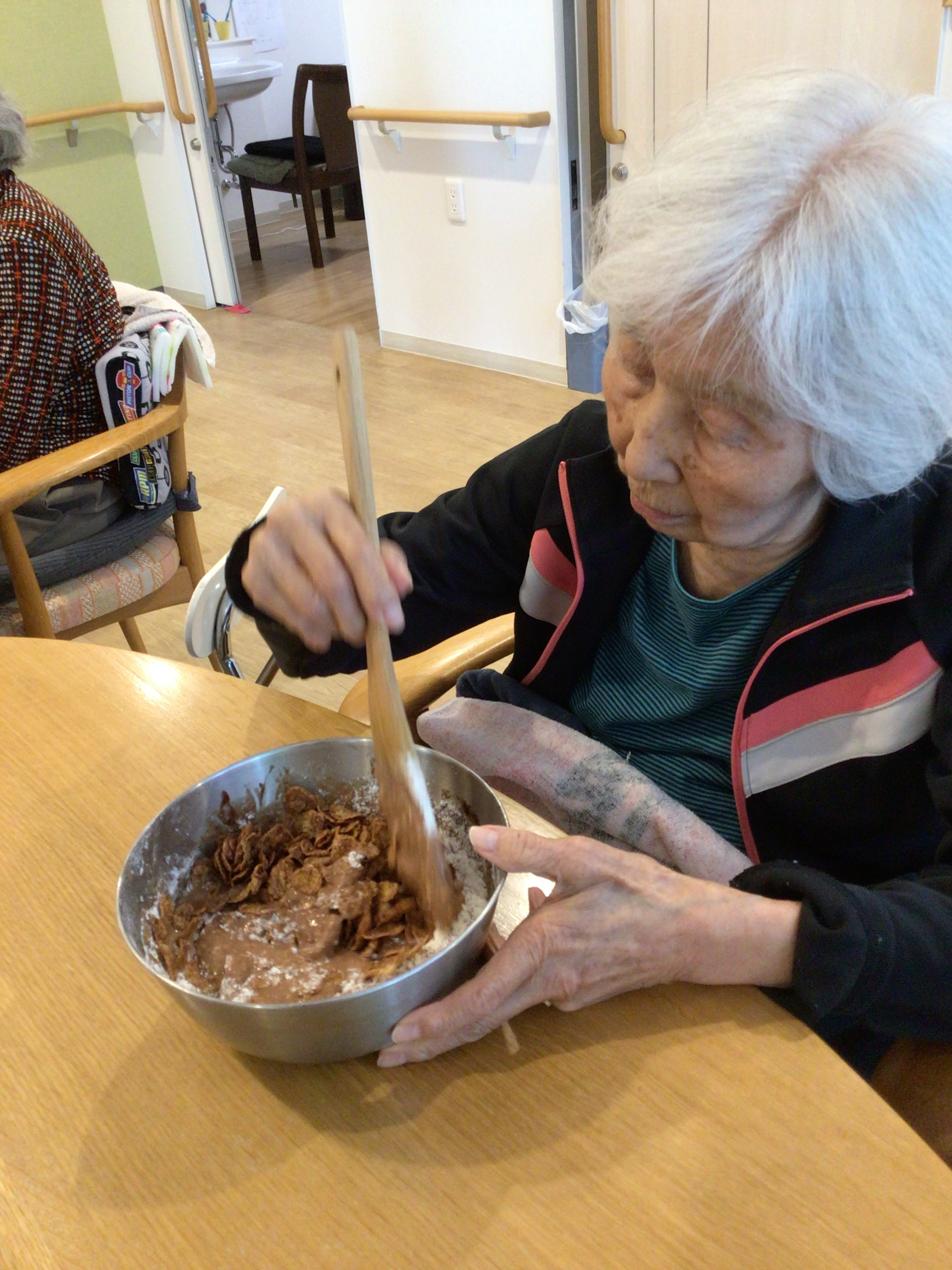 協力して皆さんで混ぜ混ぜ。トースターで焼いて完成です。おやつの時間に頂きます。