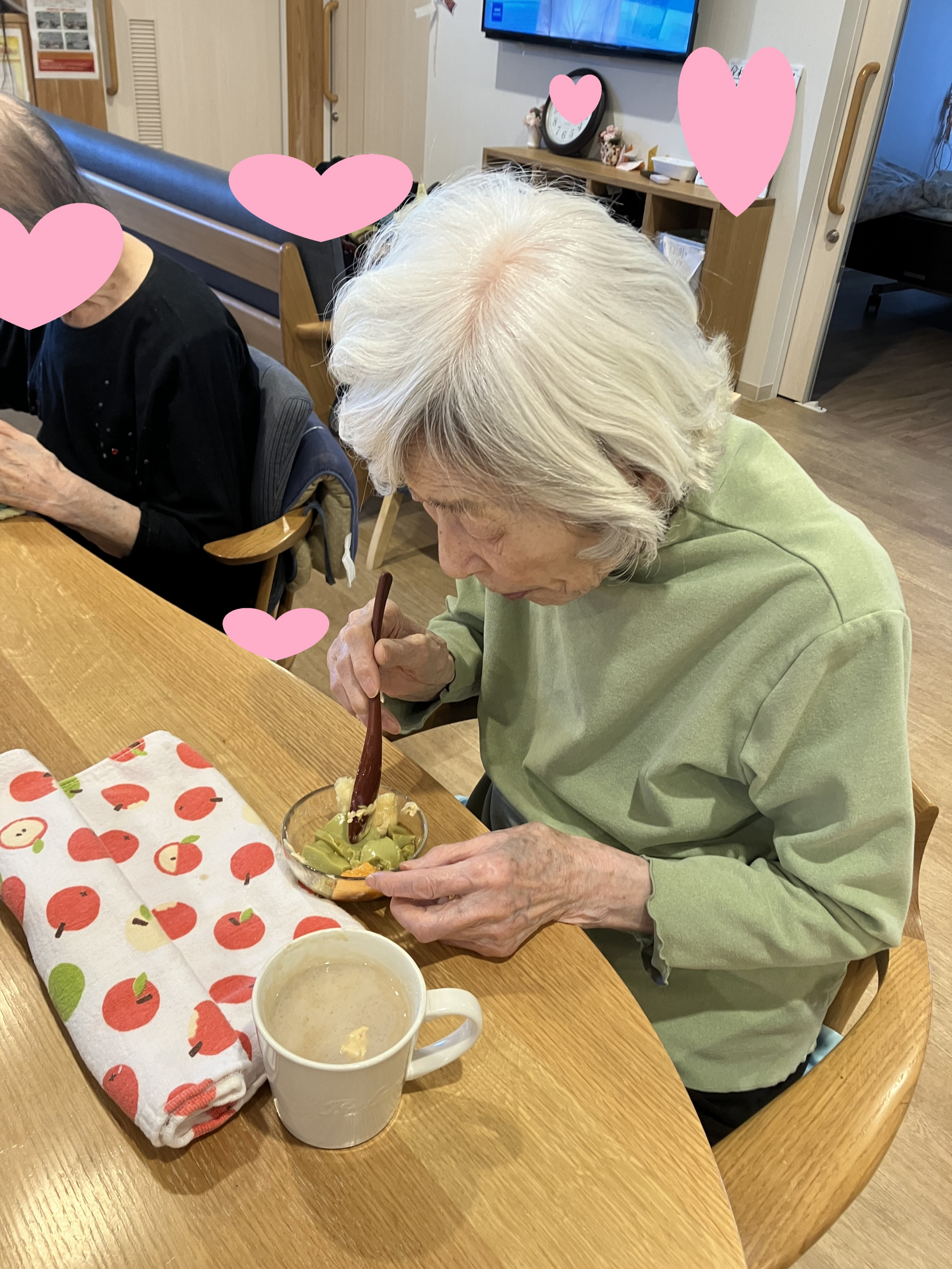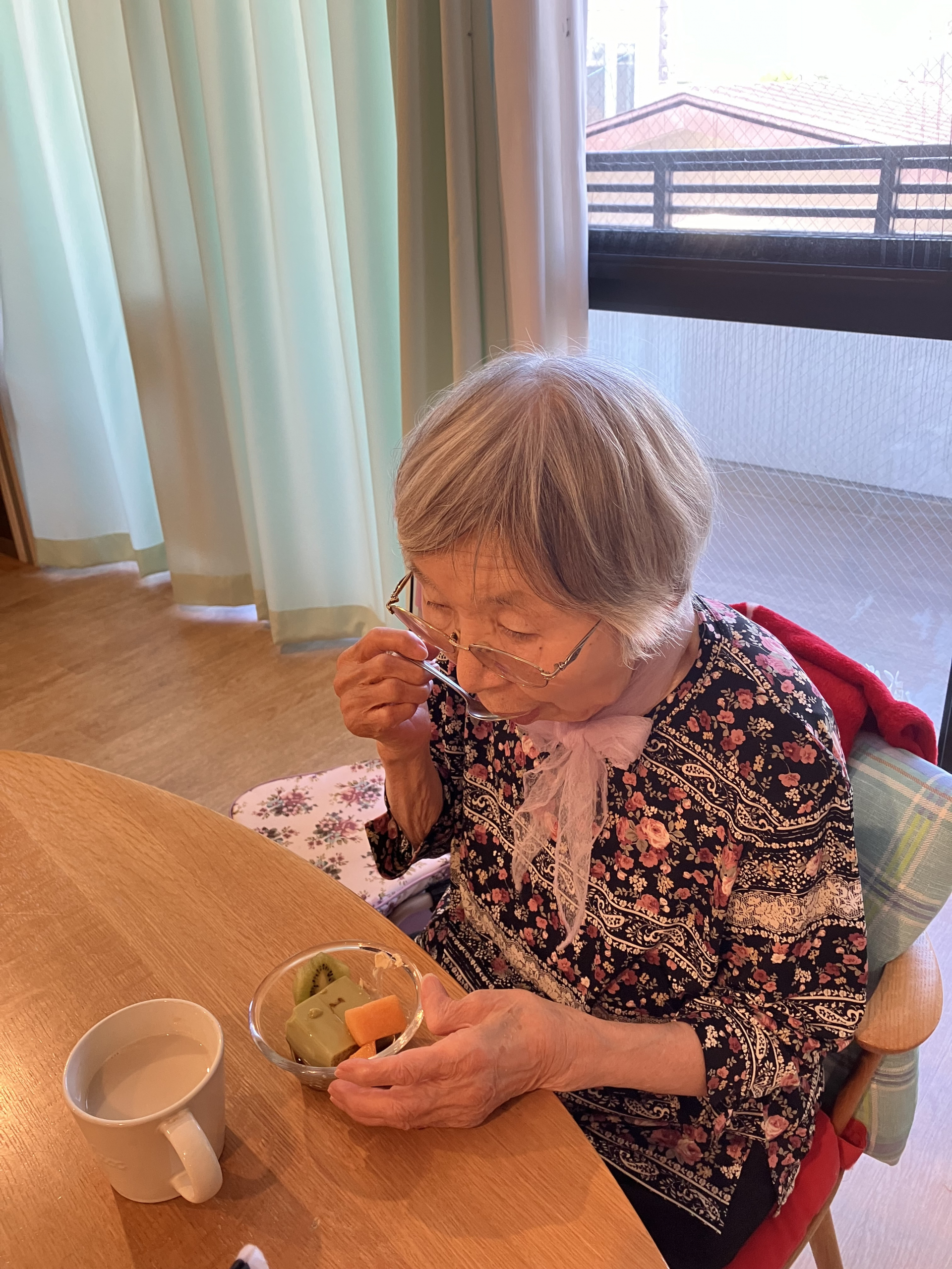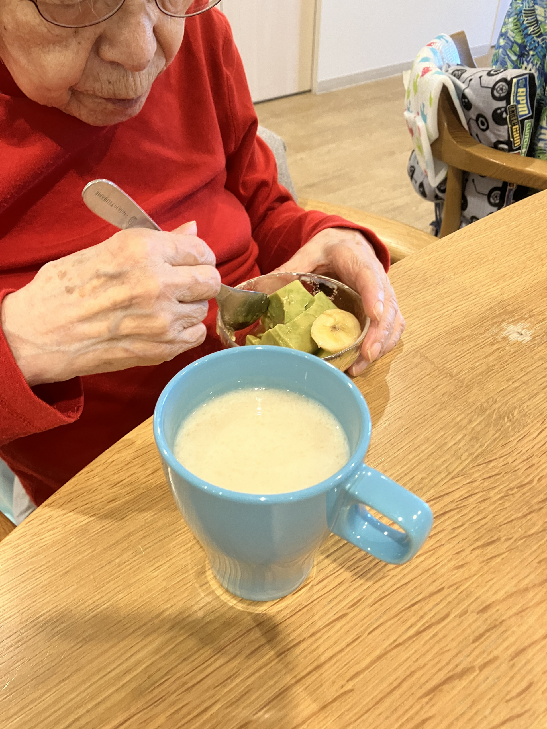 フルーツのせて、黒蜜と、きなこペーストを添えました。