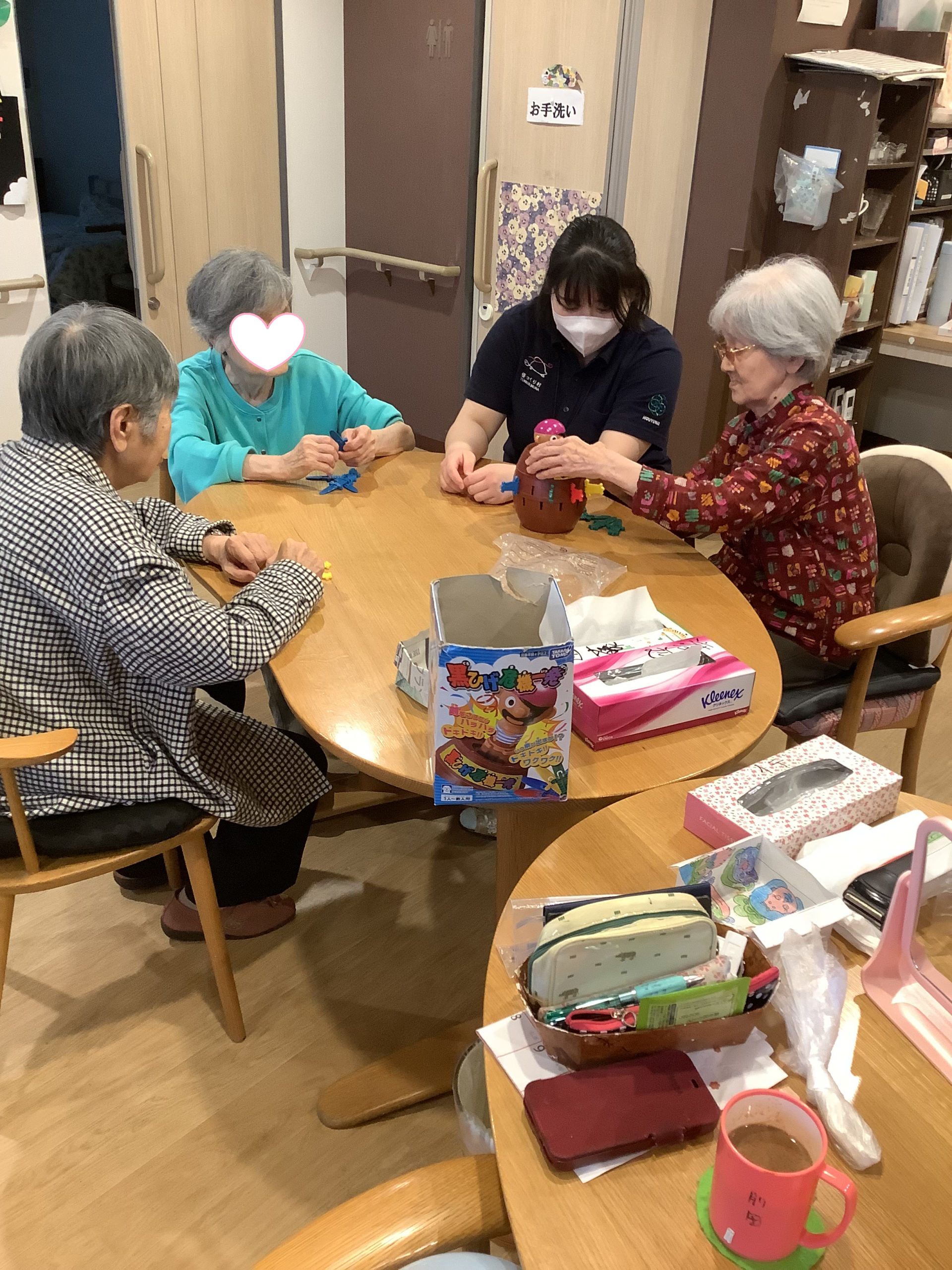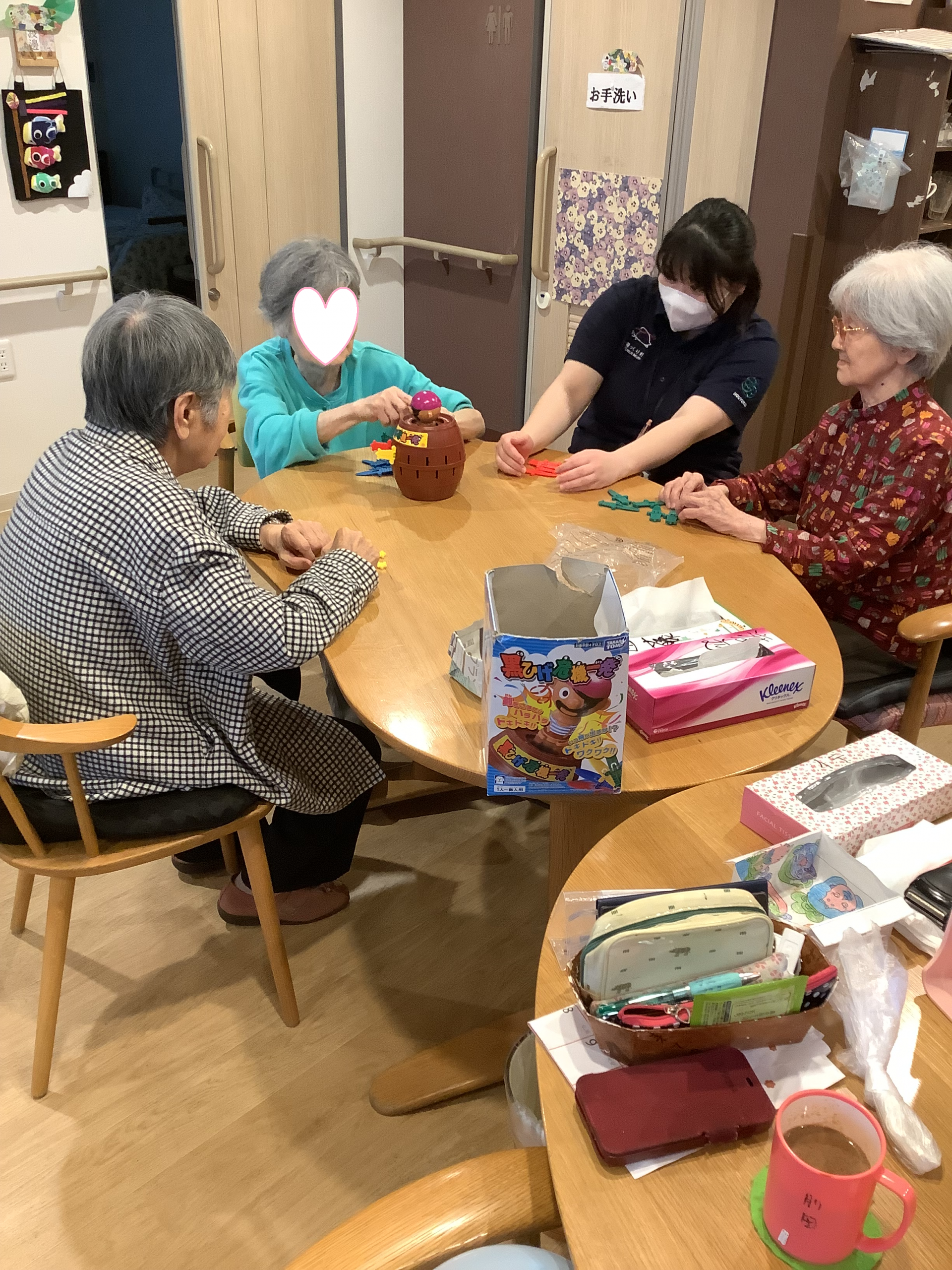 利用者さんと「黒ひげ危機一発」や「ジェンガ」で過ごしています。皆さん、黒ひげ危機一発にはヒヤヒヤドキドキしながら参加されていました。