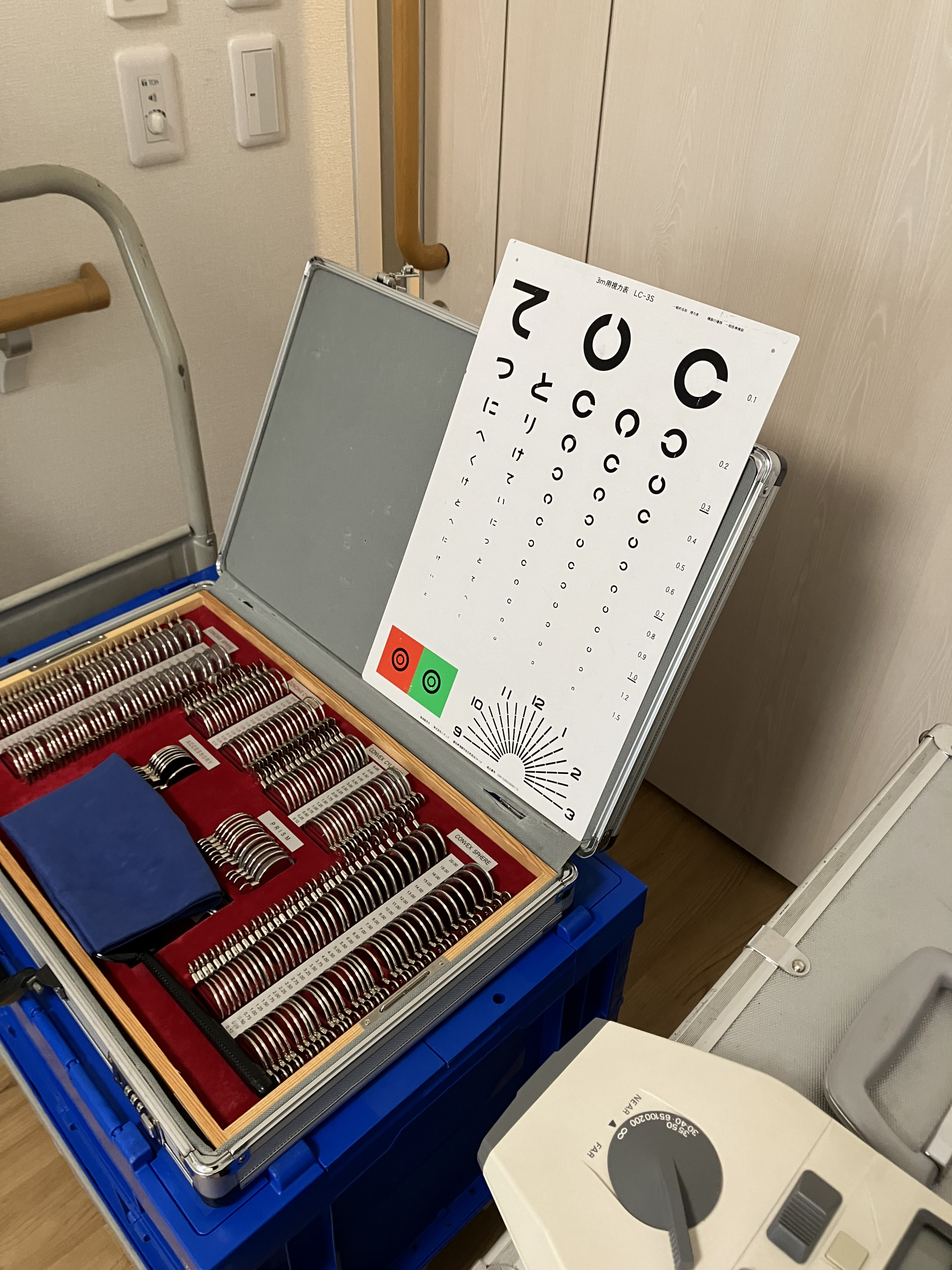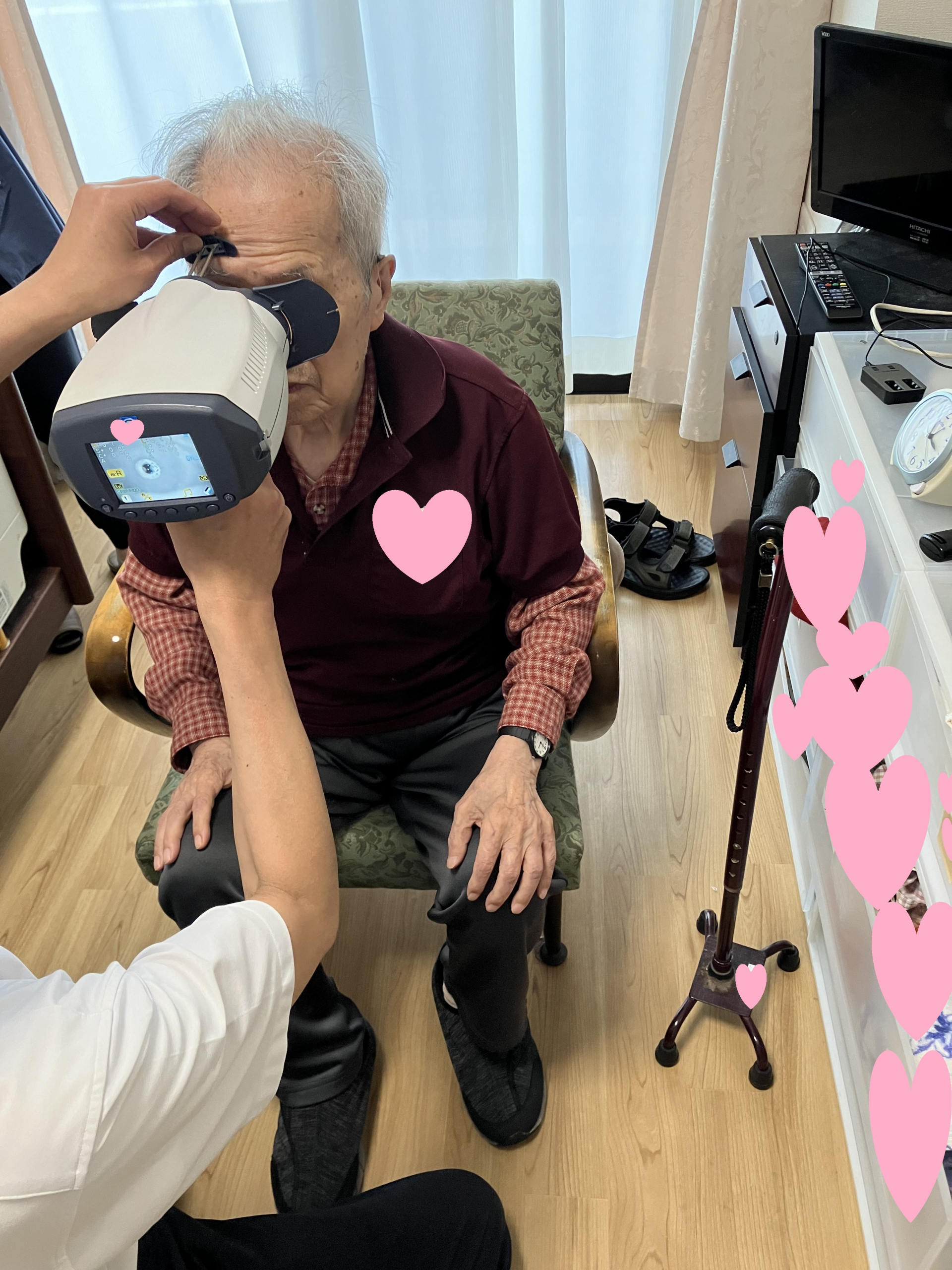 こんにちは! 今日は、眼鏡屋さんがきました!! めがねの度数を測定して、めがねを作るためです。