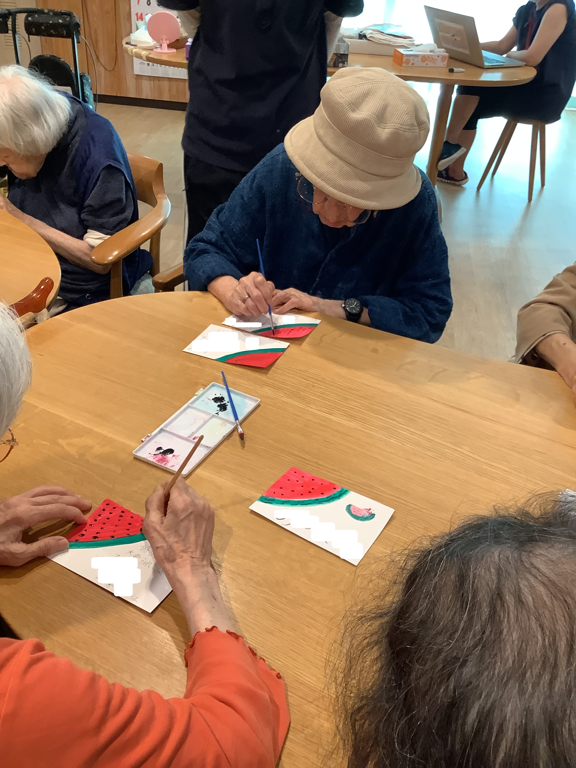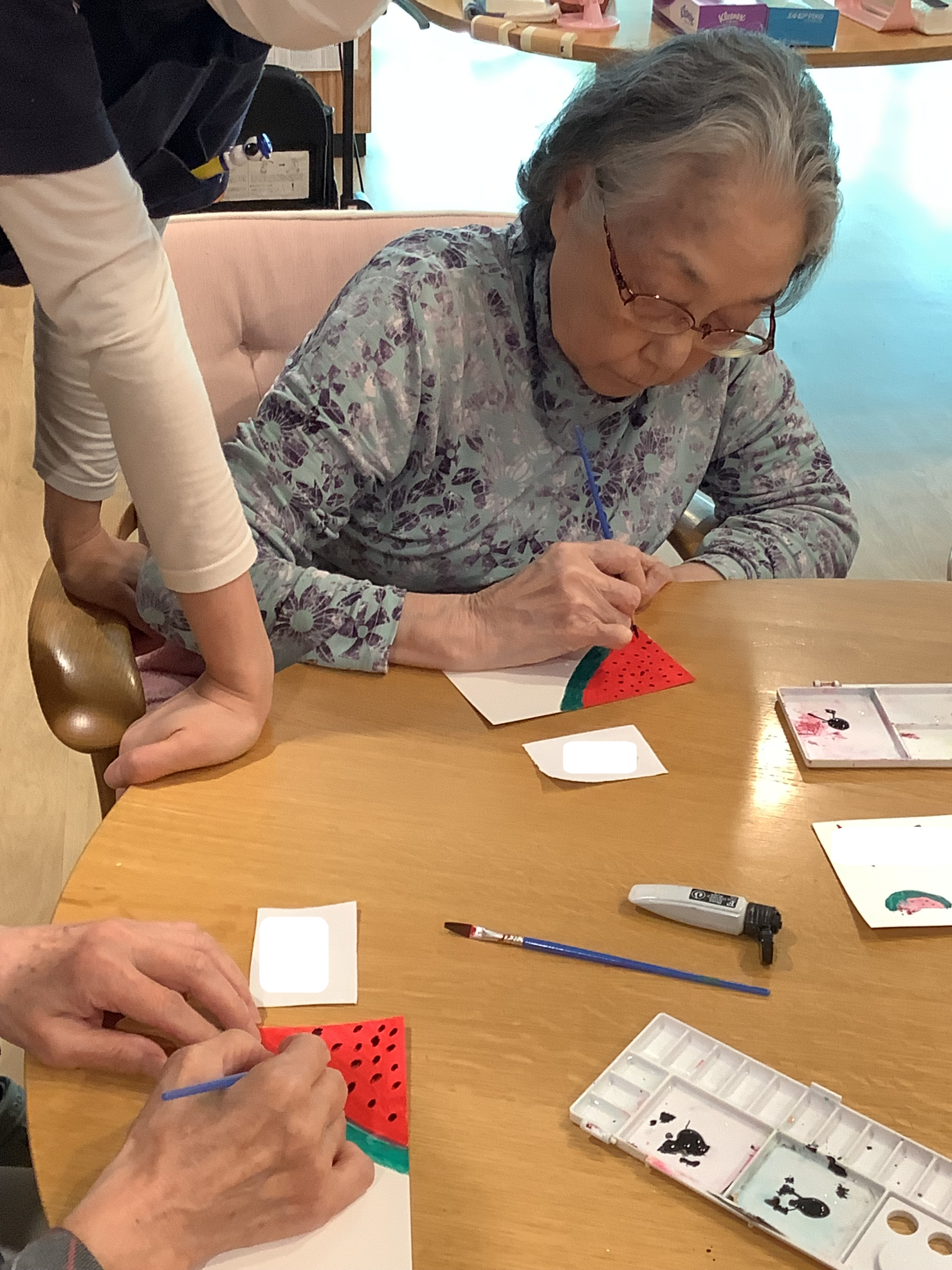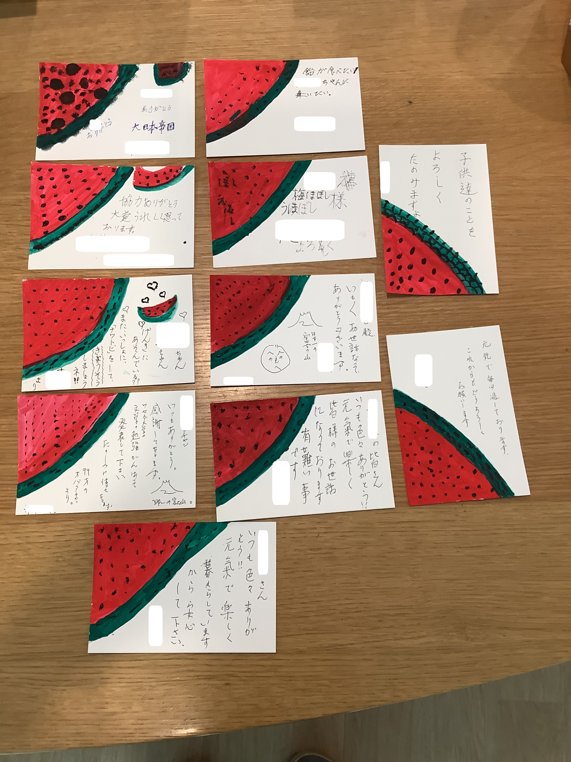 絵の具が乾いたらメッセージとスイカのの種を書きます。