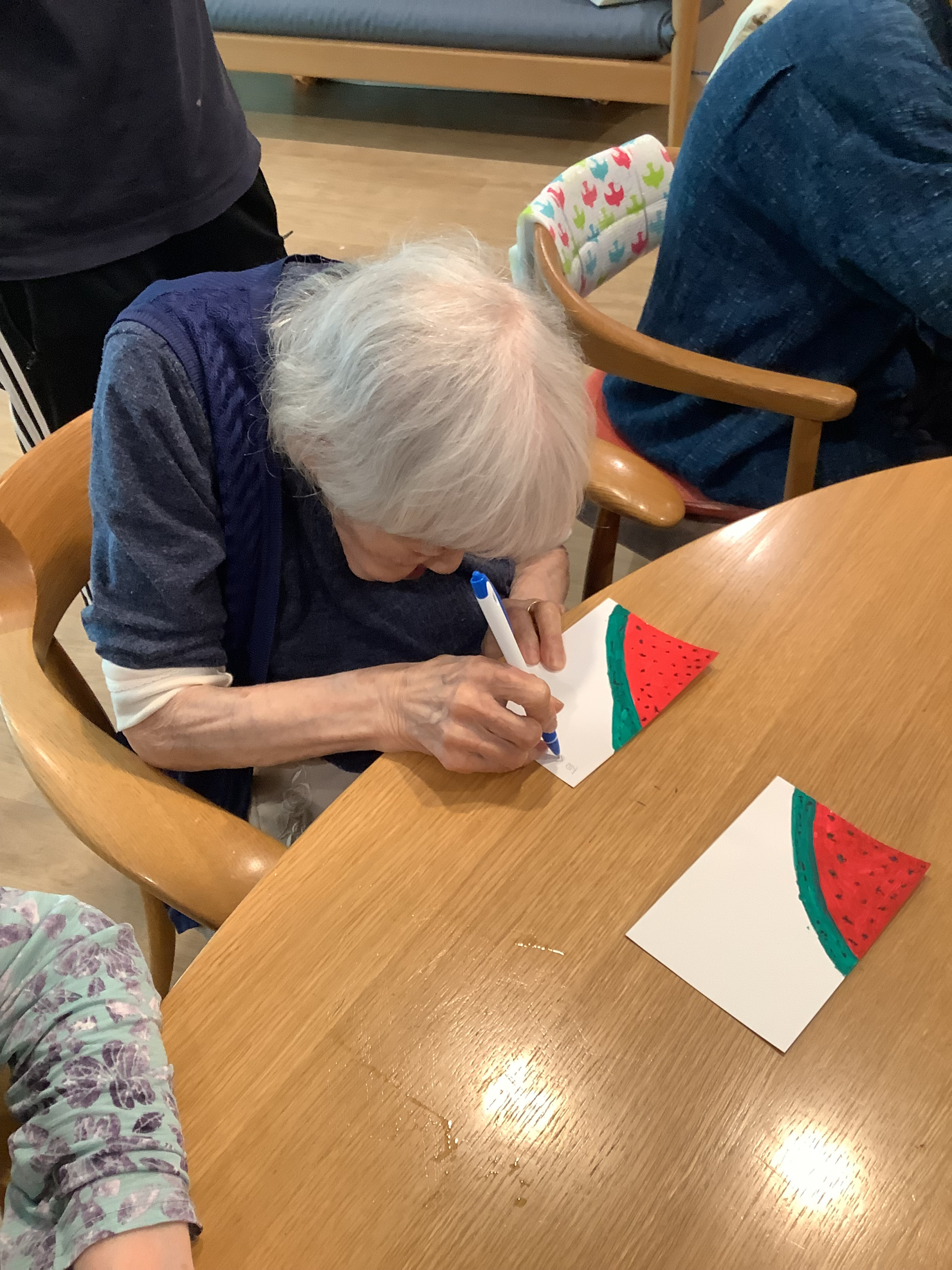 絵の具が乾いたらメッセージとスイカのの種を書きます。