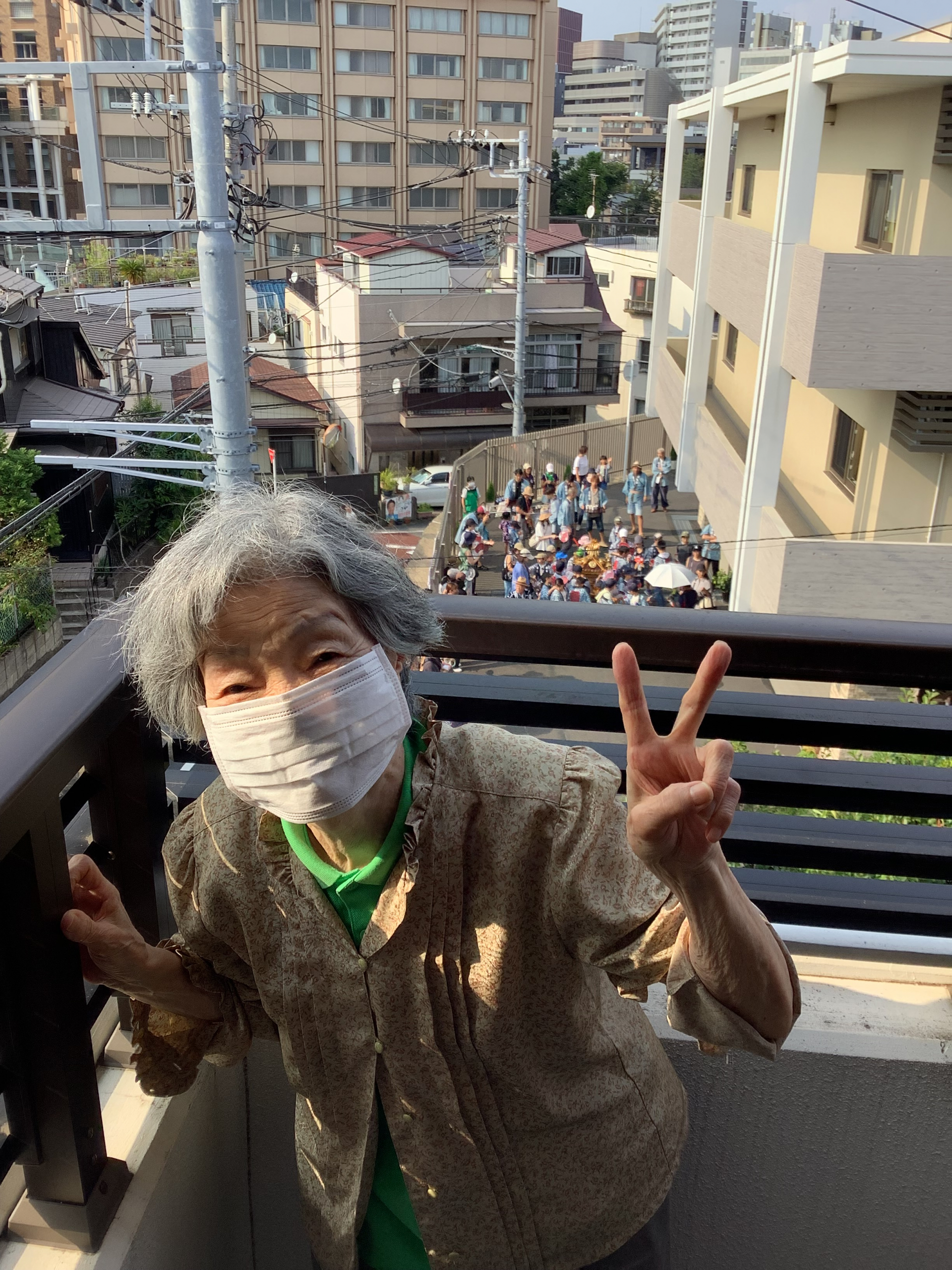 地元のお祭りです。賑やかな声が聞こえてきました。施設の前を子供神輿と山車が通ると聞いて見学です。