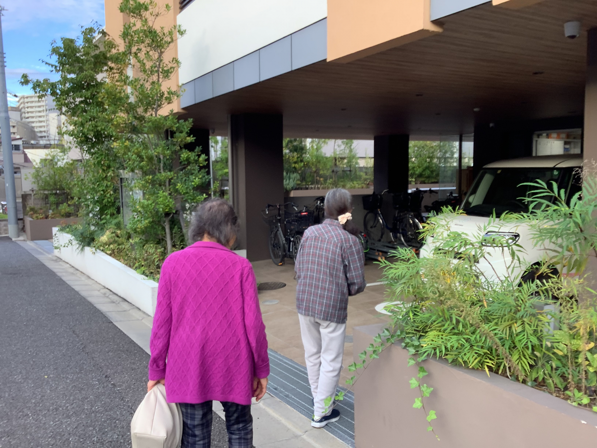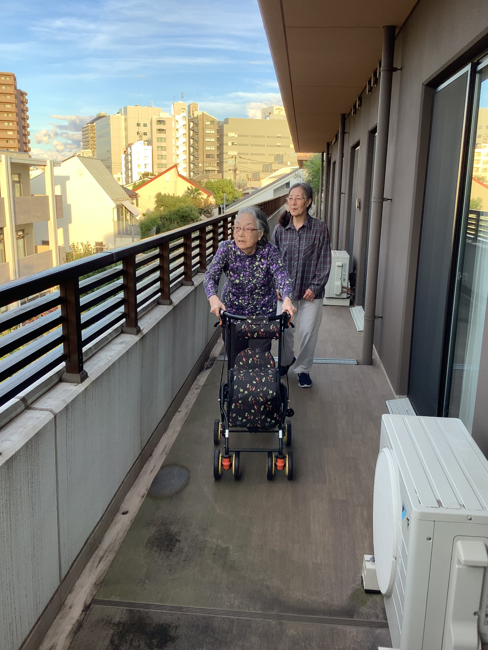 K様は久しぶりにベランダ散歩。外の空気はおいしい、、と。私もK様の笑顔が嬉しい。 小日向GH 秋羽