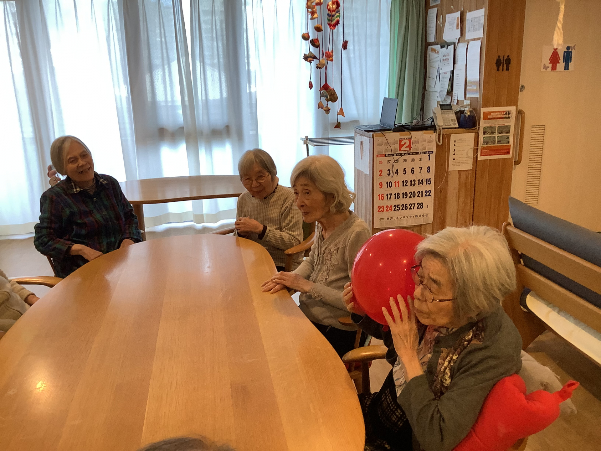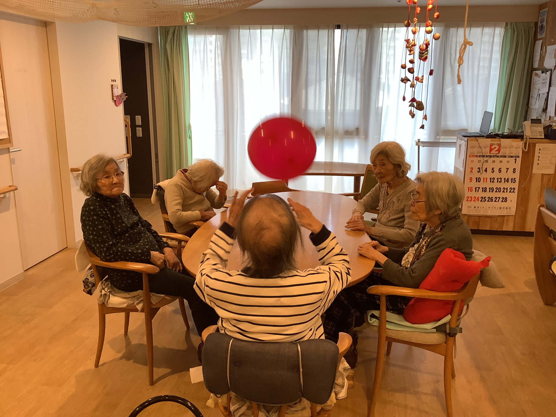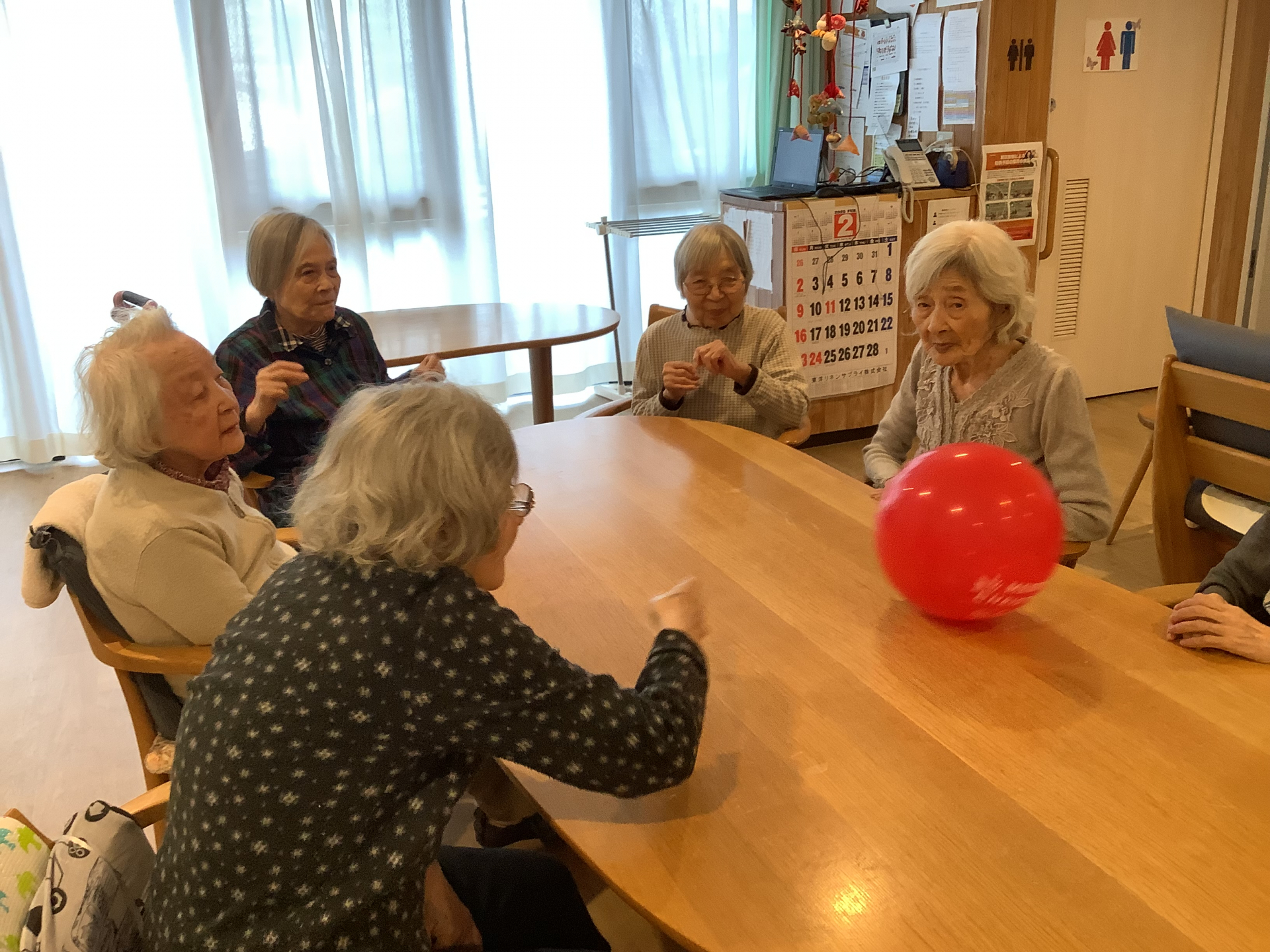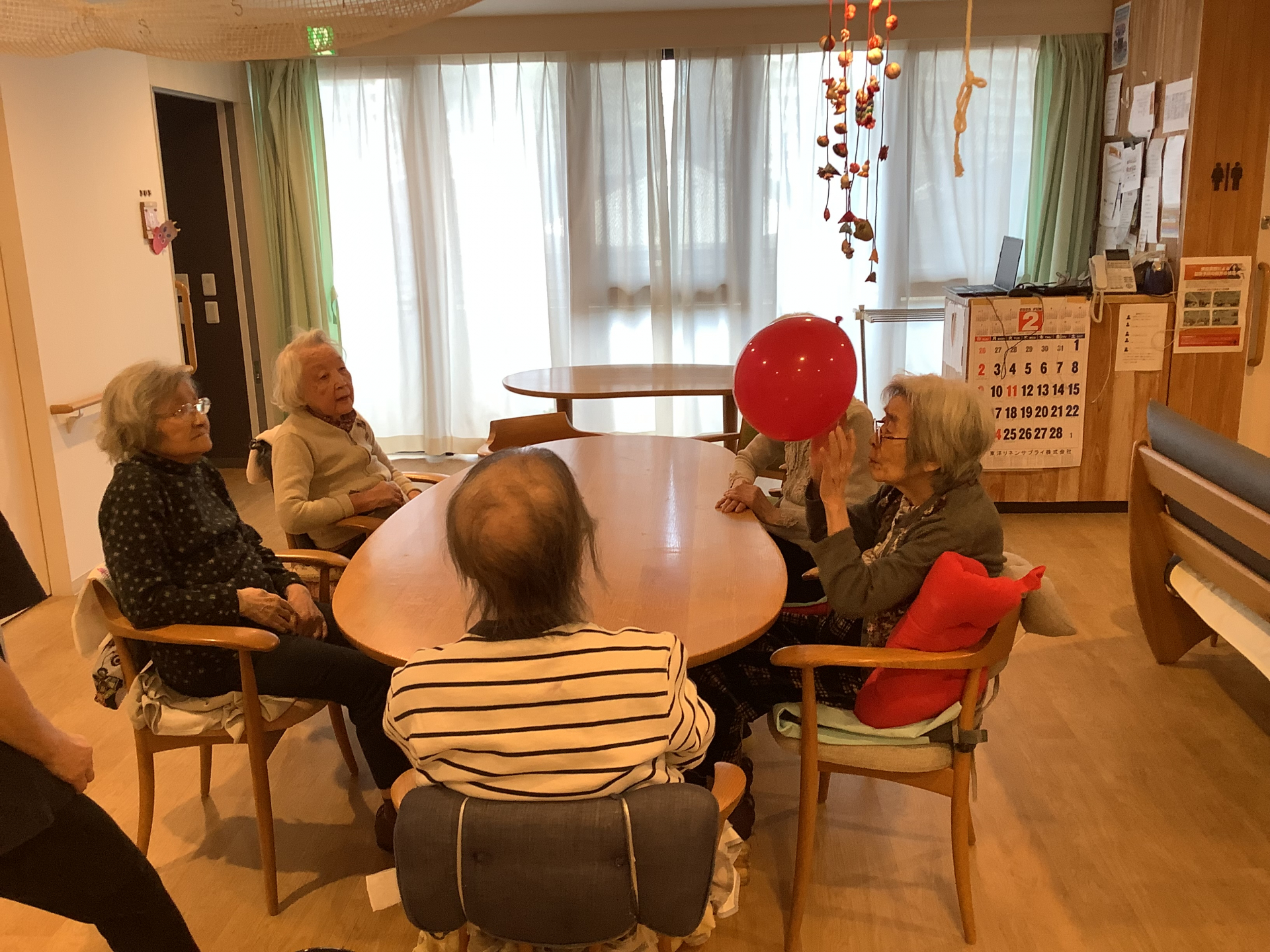 本日風船バレーをやりました,楽しくて運動にもなりま!