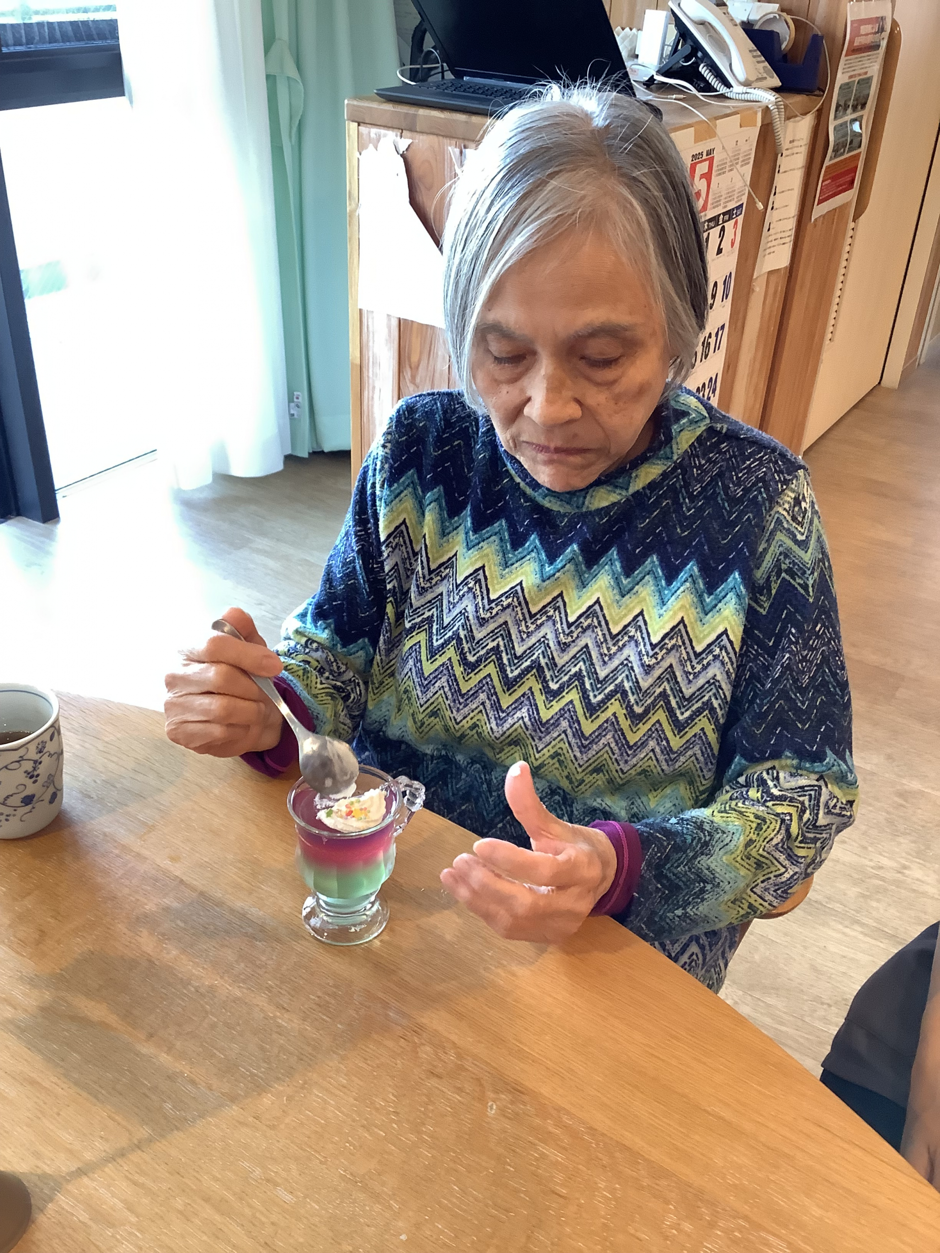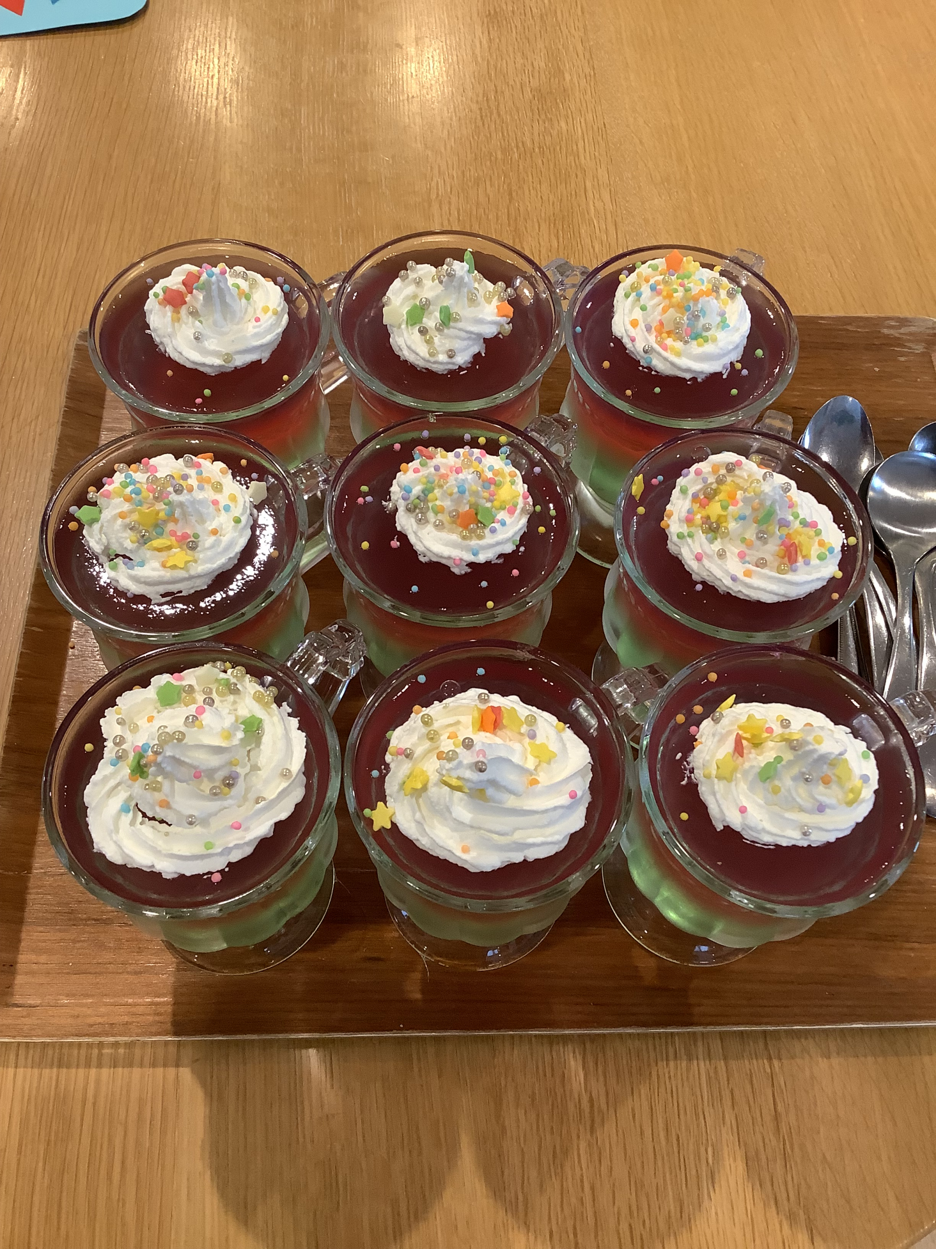 冷やしたプリンにワイプクーリムとキラキラ飾りをのせます!