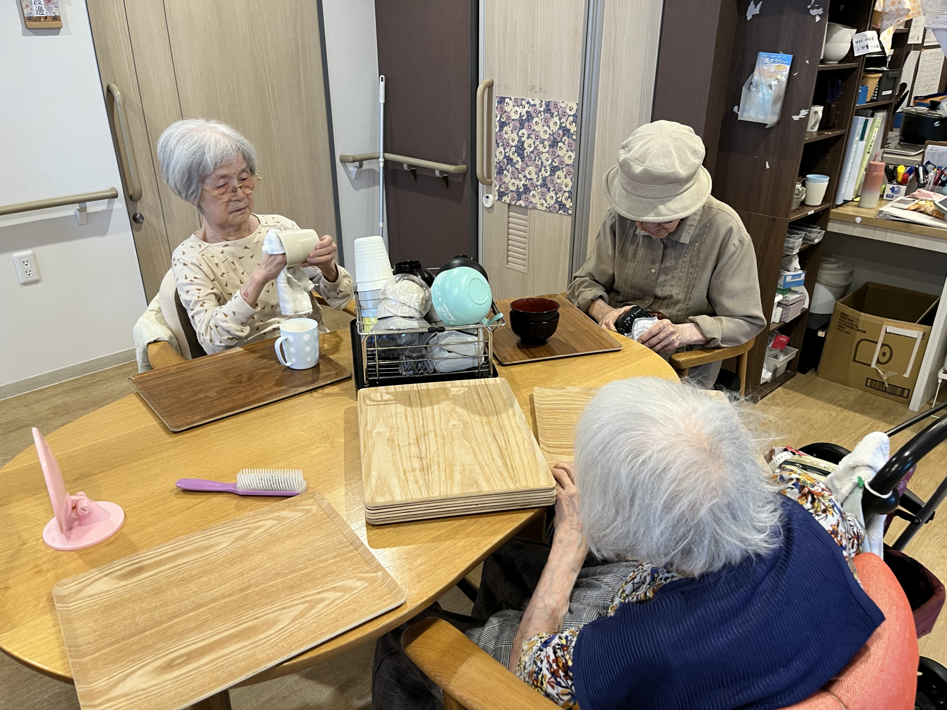 協力して食器を拭いたりトレー拭いたり・・