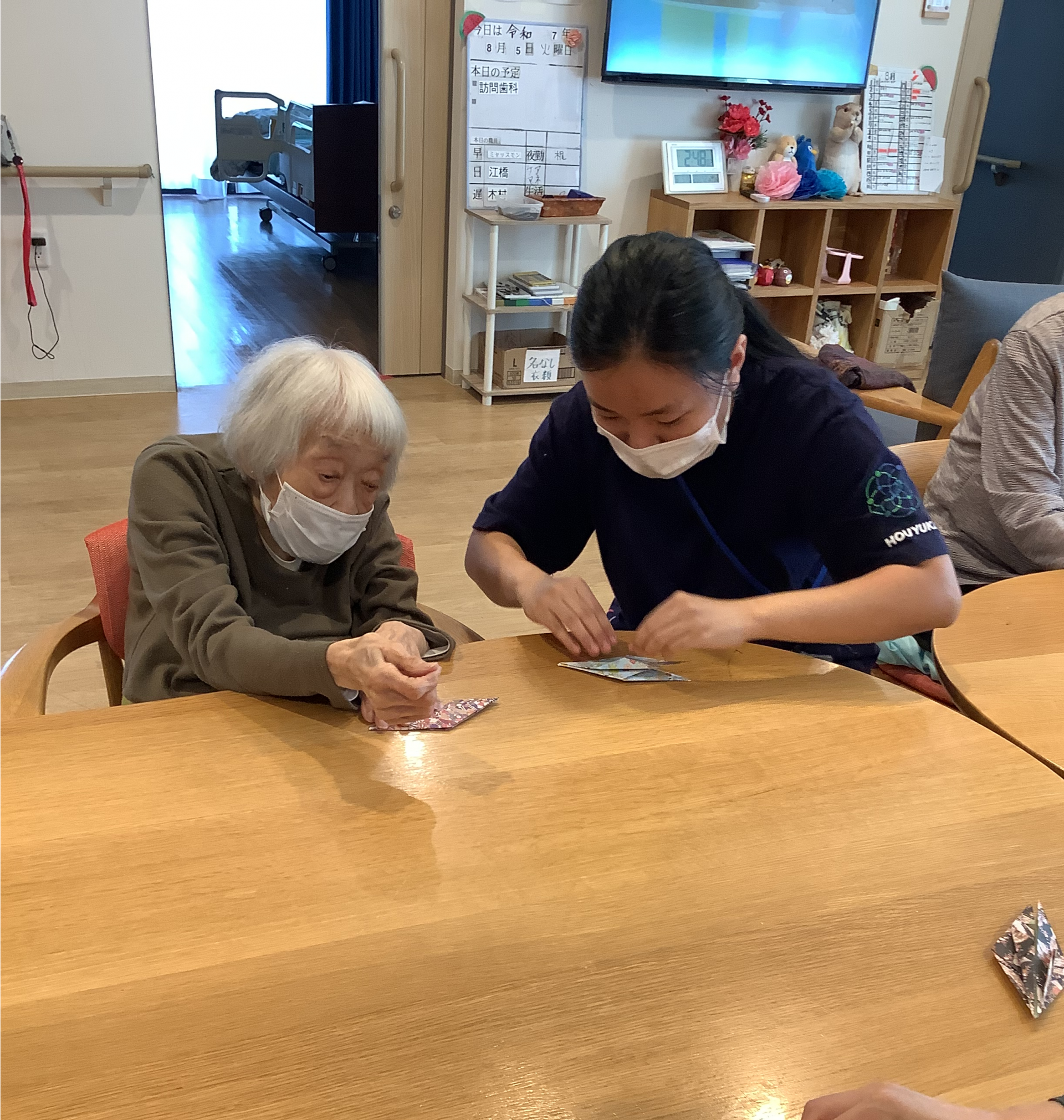 外国の職員さん「難しいそう~」と仰りながら皆様と「鶴」を折ってみました!