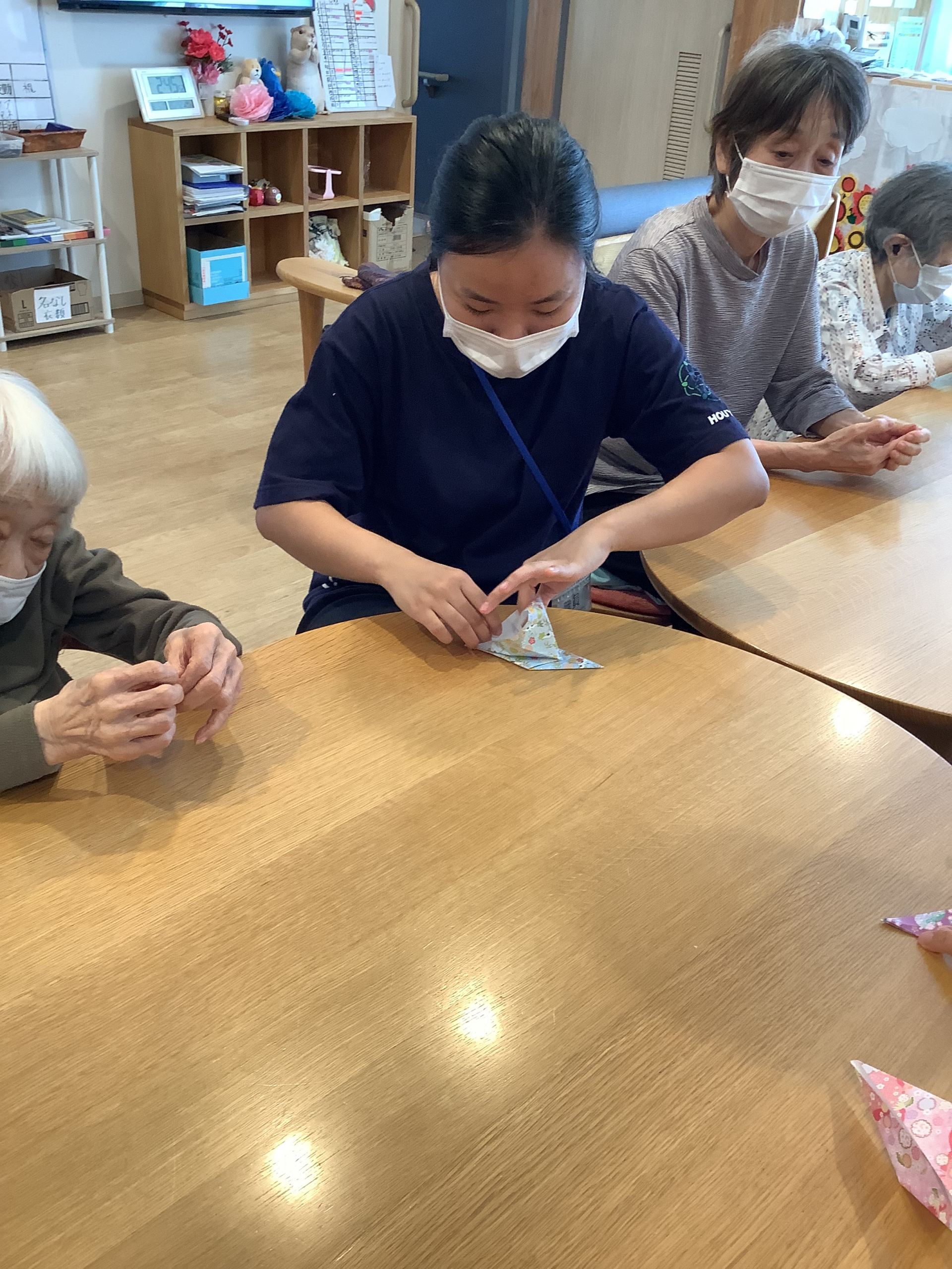 外国の職員さん「難しいそう~」と仰りながら皆様と「鶴」を折ってみました!