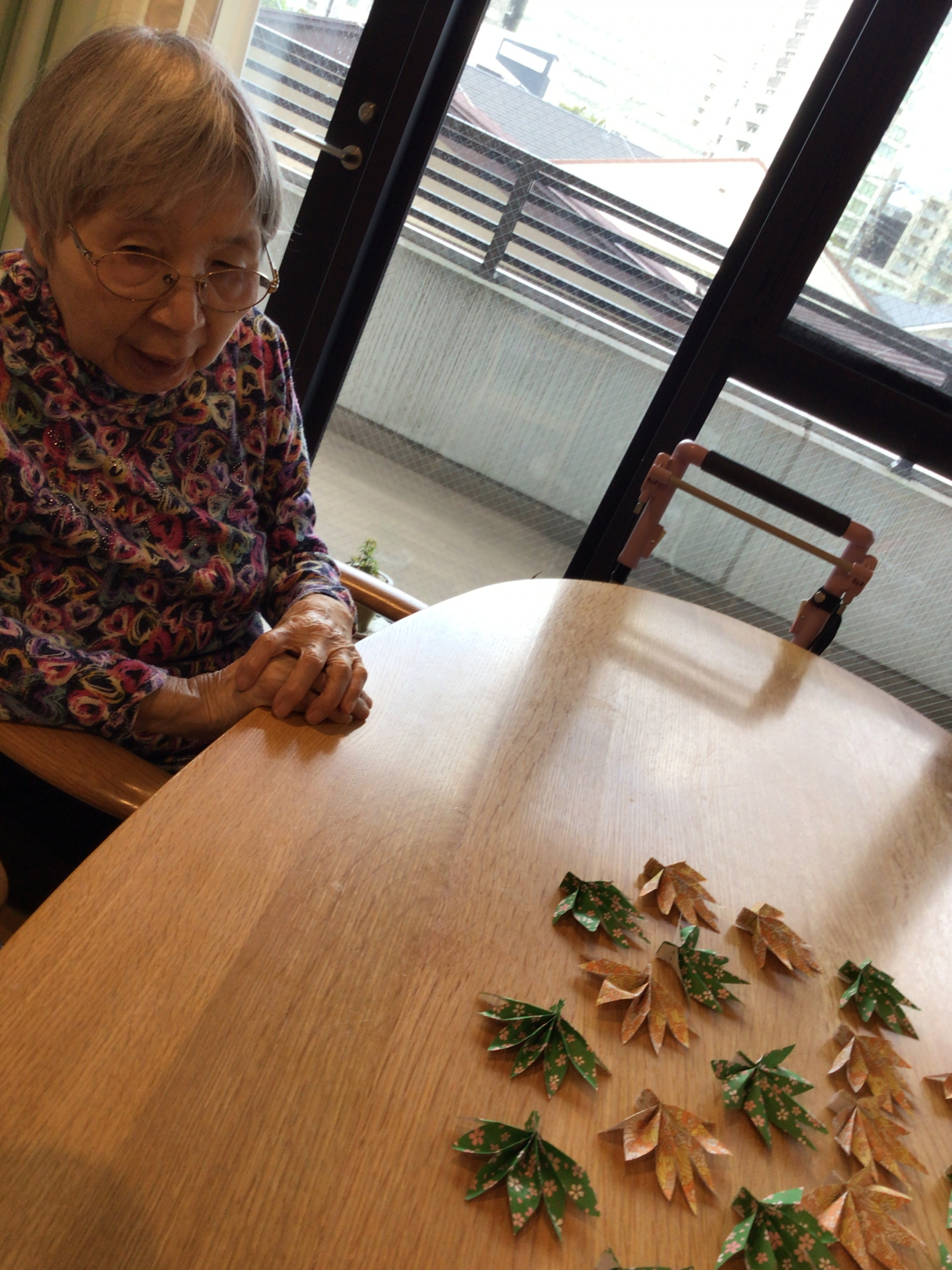 今日は皆さんと一緒に新聞を折ったりして,紅葉の折り紙も作りました。