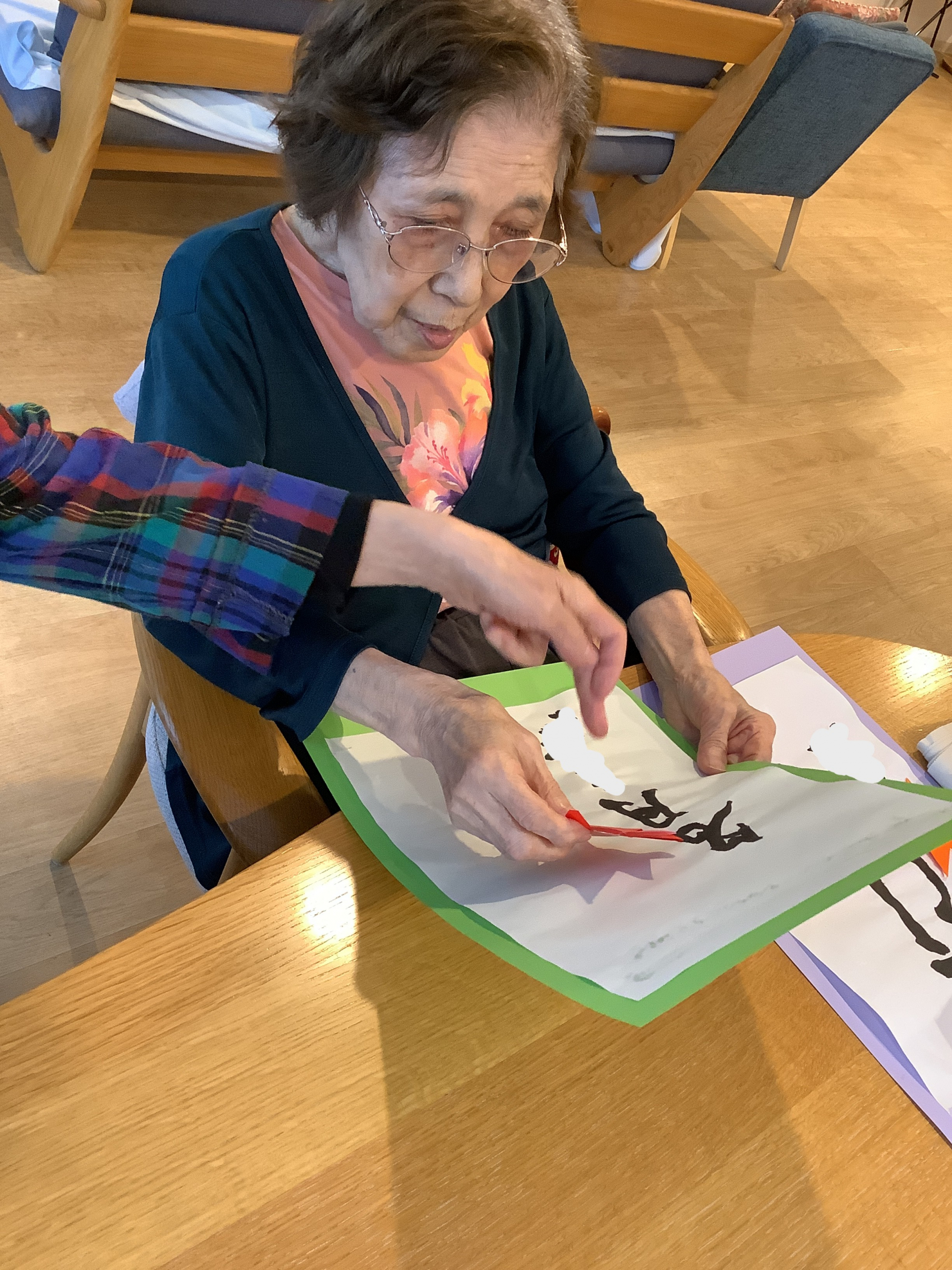 選んだ画用紙に、昨日書いた習字を貼っていきます。
