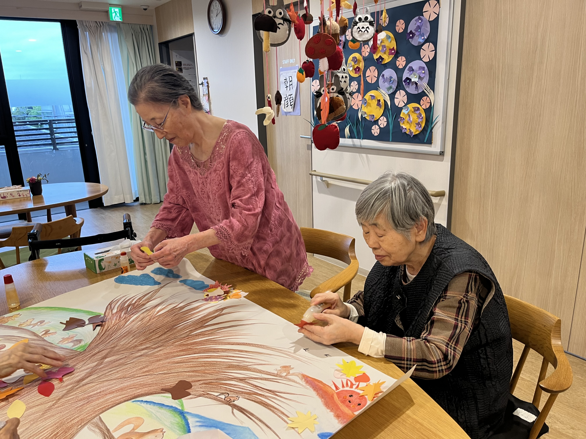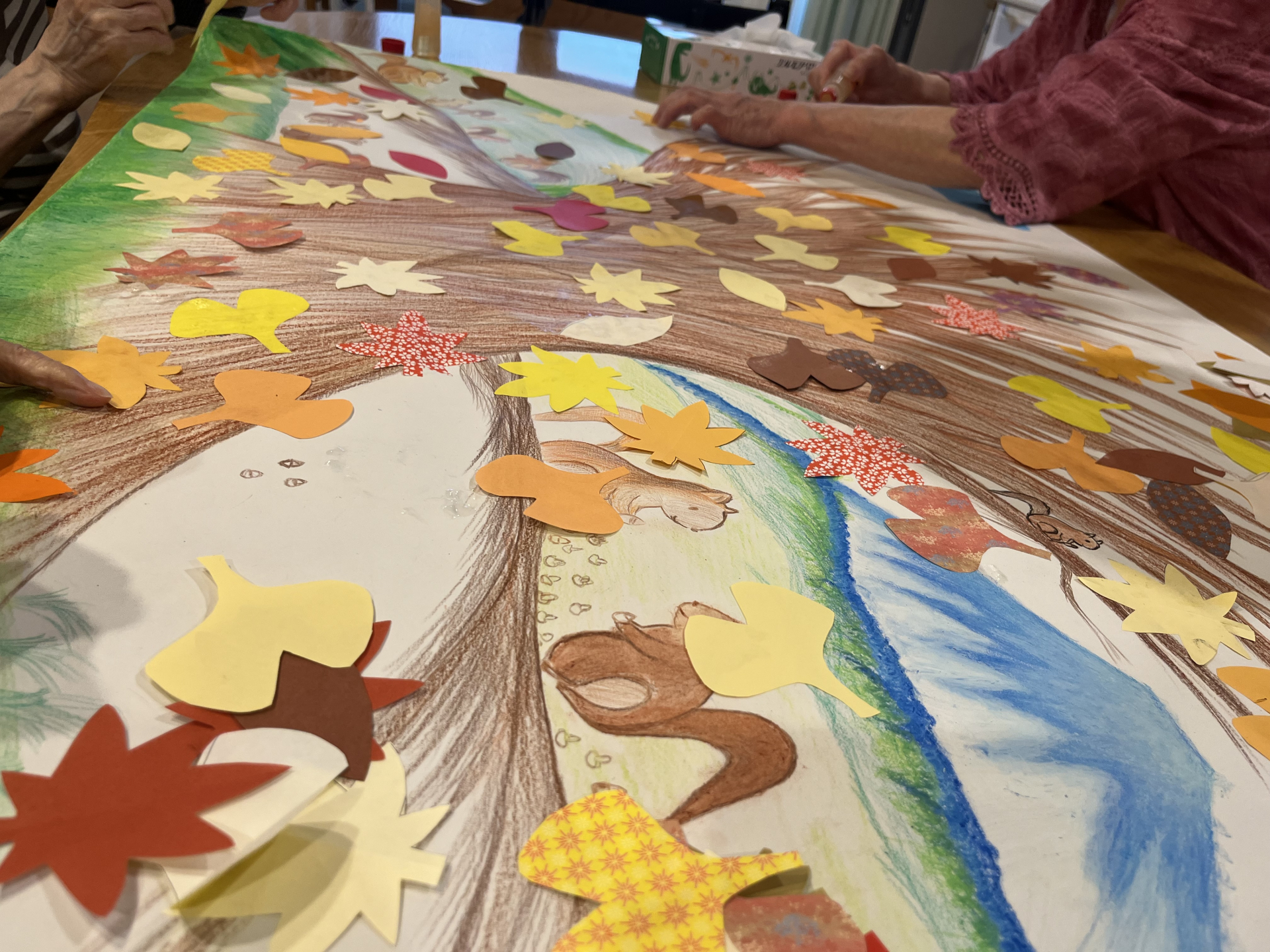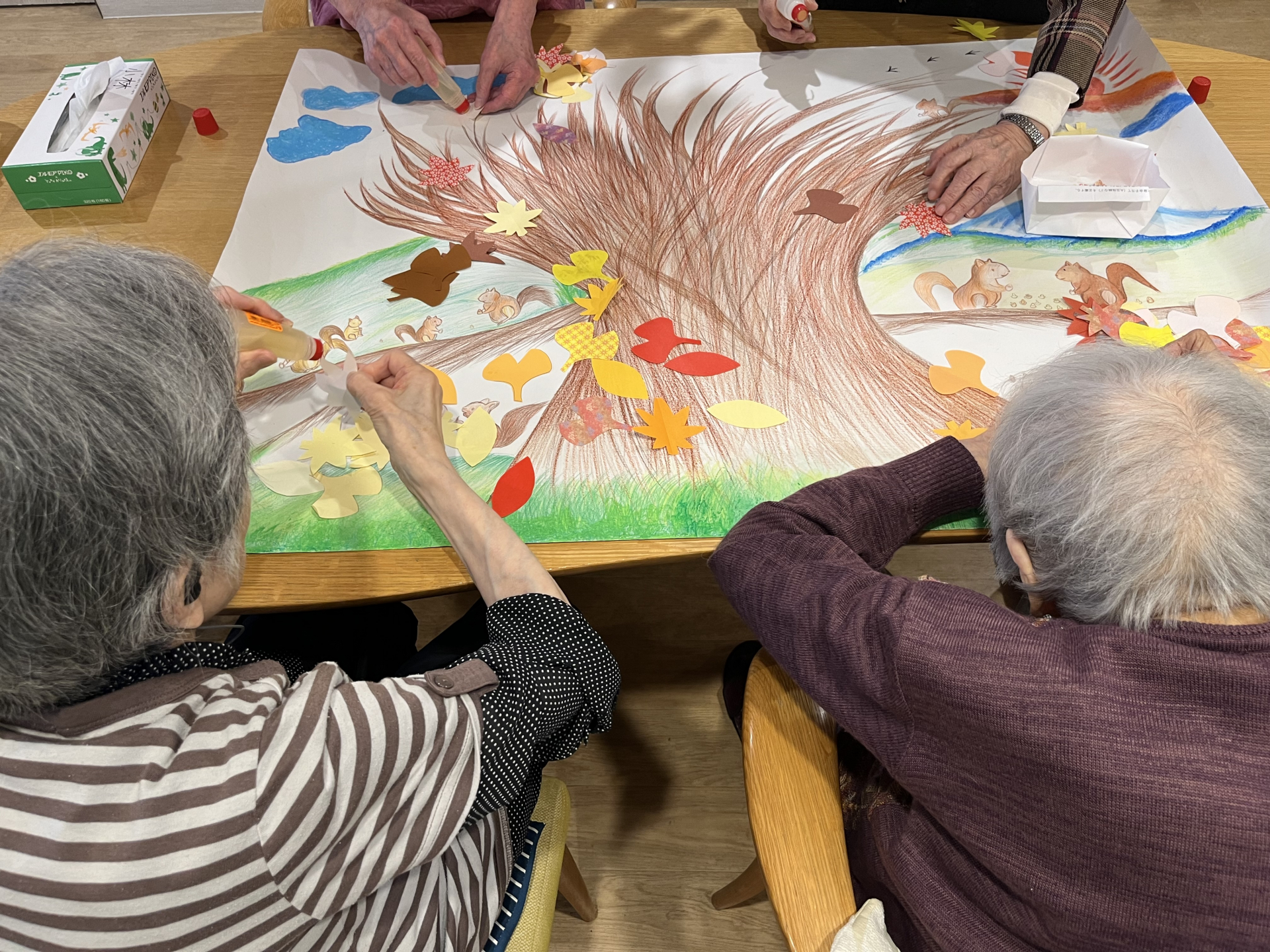 大きな木に紅葉やイチョウを貼っていきます・・