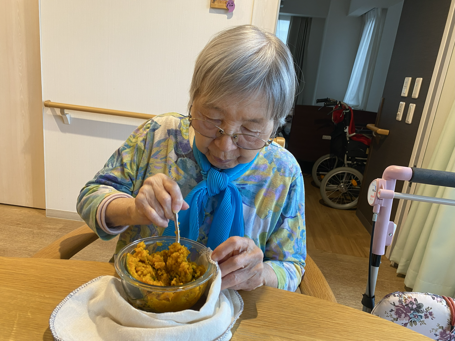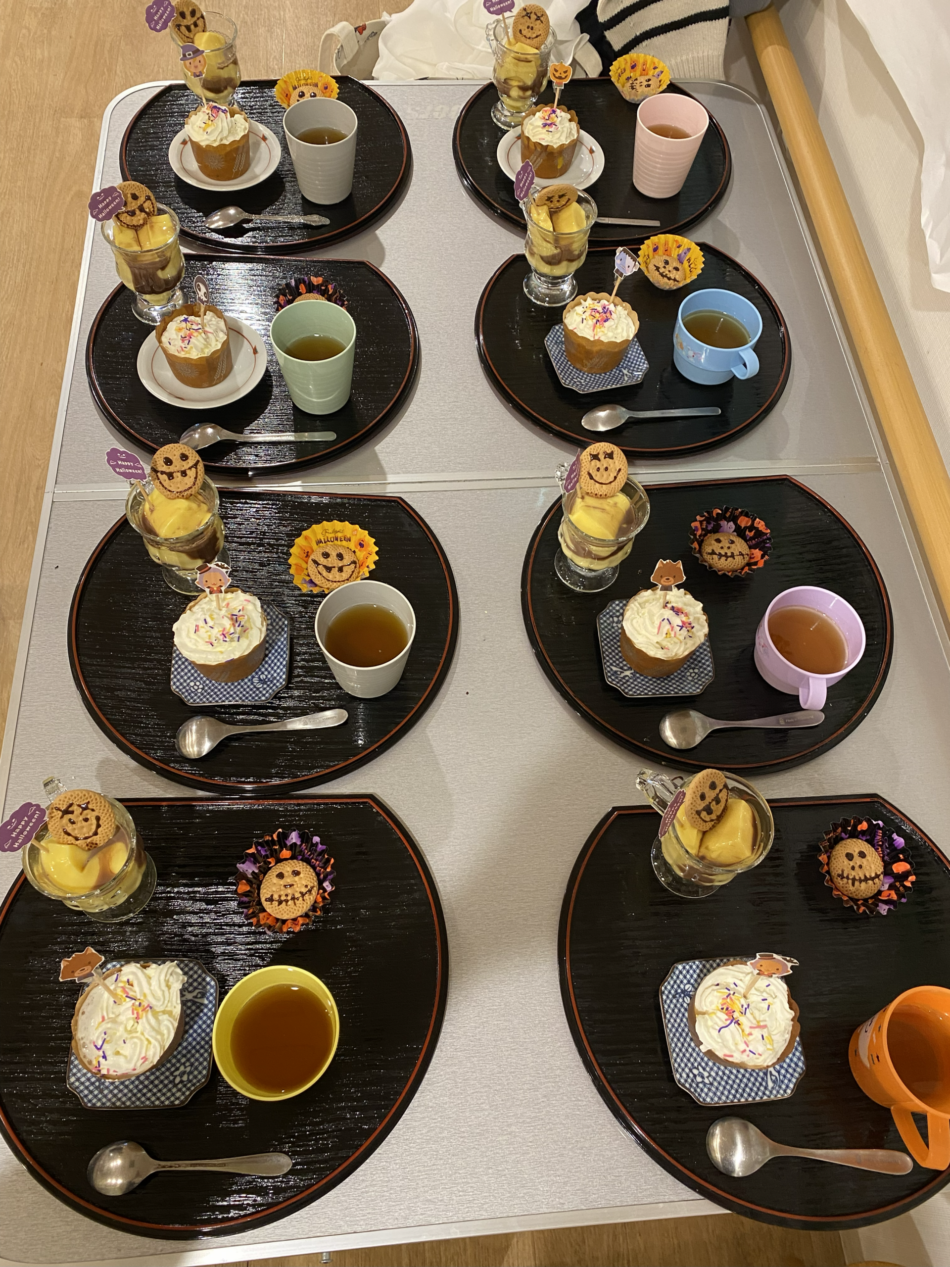作った焼きたてのカボチャマフィンと他の甘いものを一緒に召し上がり,笑い声たくさん聞こえて楽し時間になりました