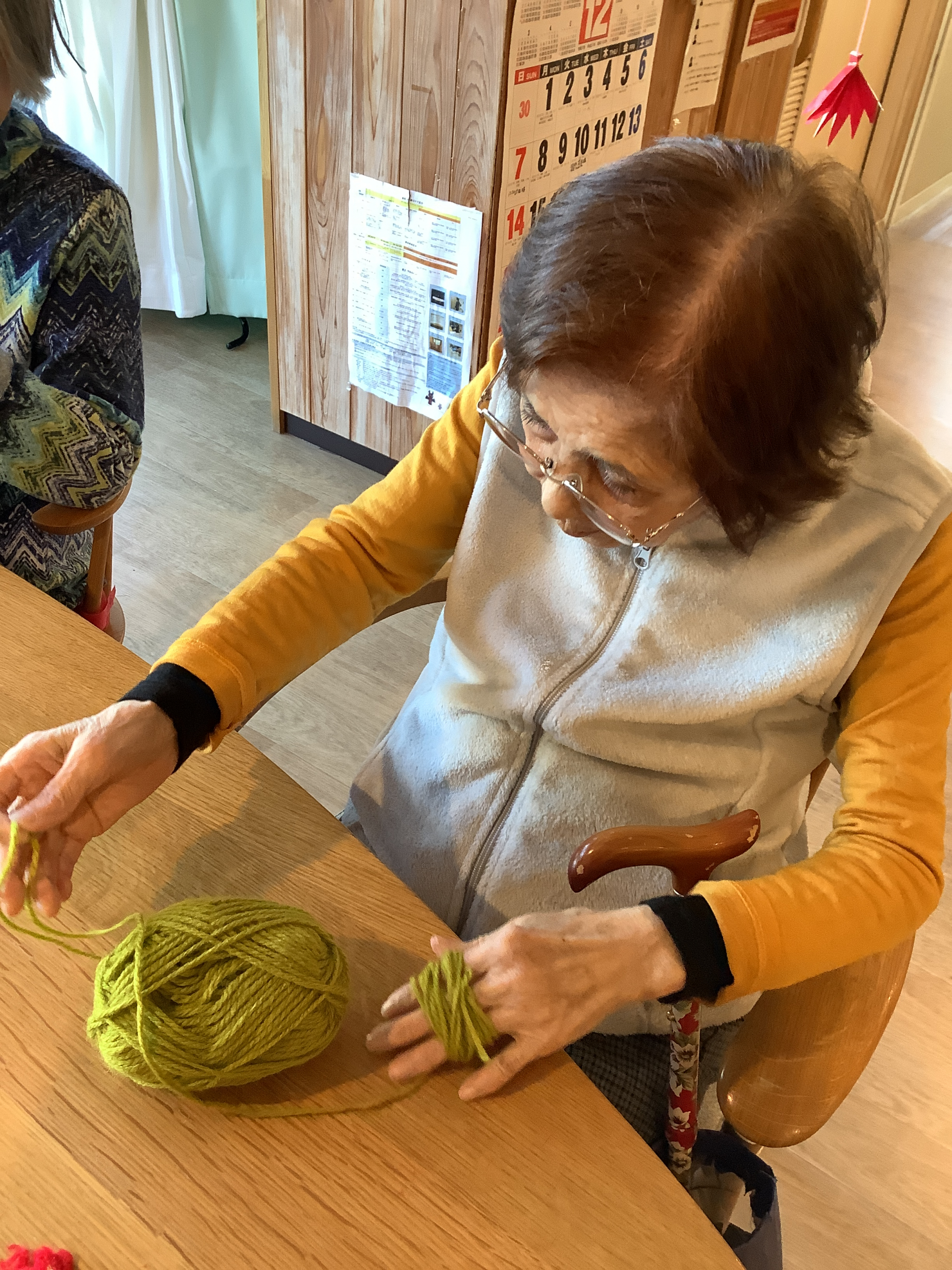 指に毛糸をたくさん巻き付けて,きゅっと縛り,長さを整えます。