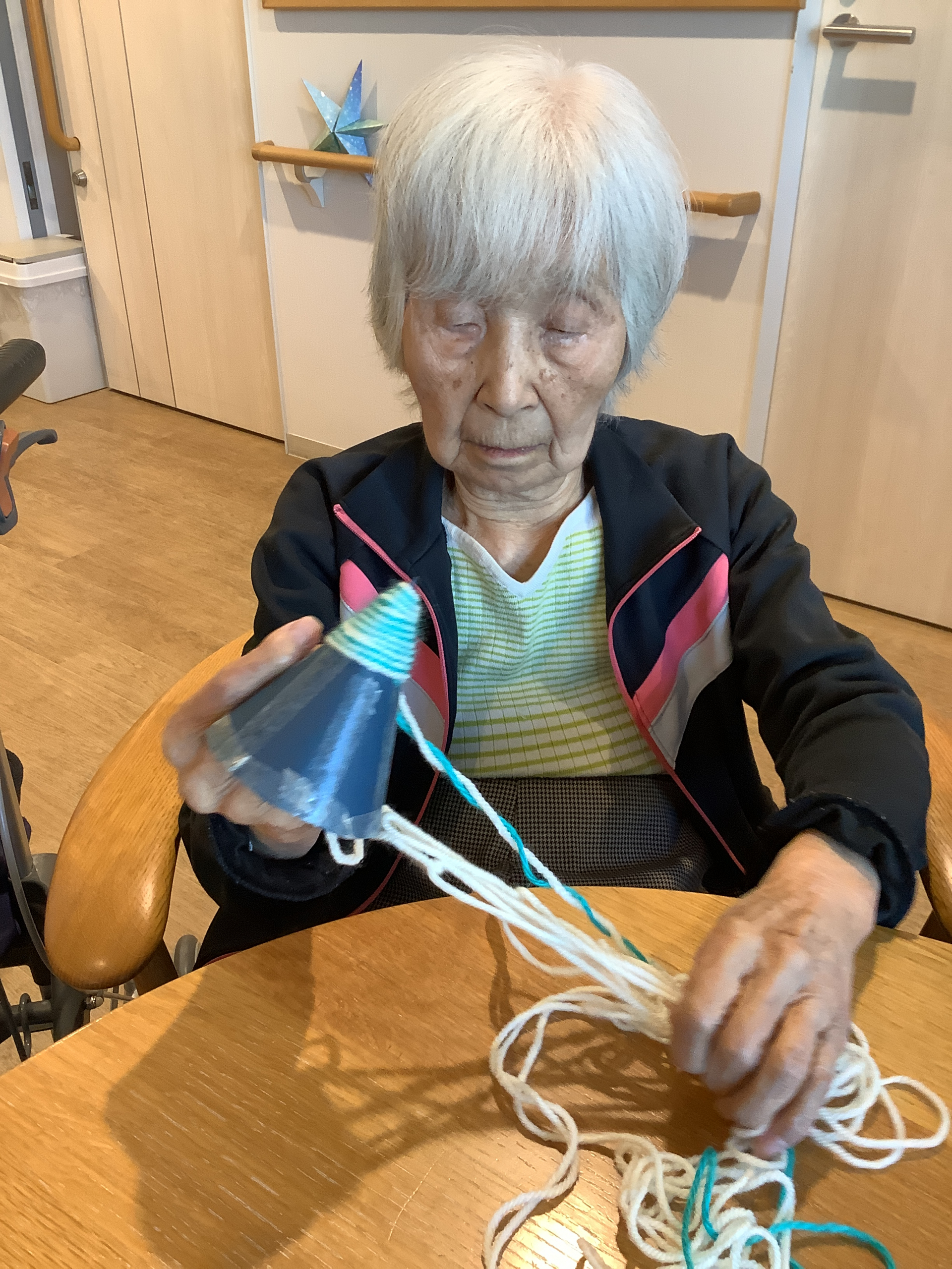 本日のレクリエーションは,毛糸を使ってミニクリスマスツリーを作りました!