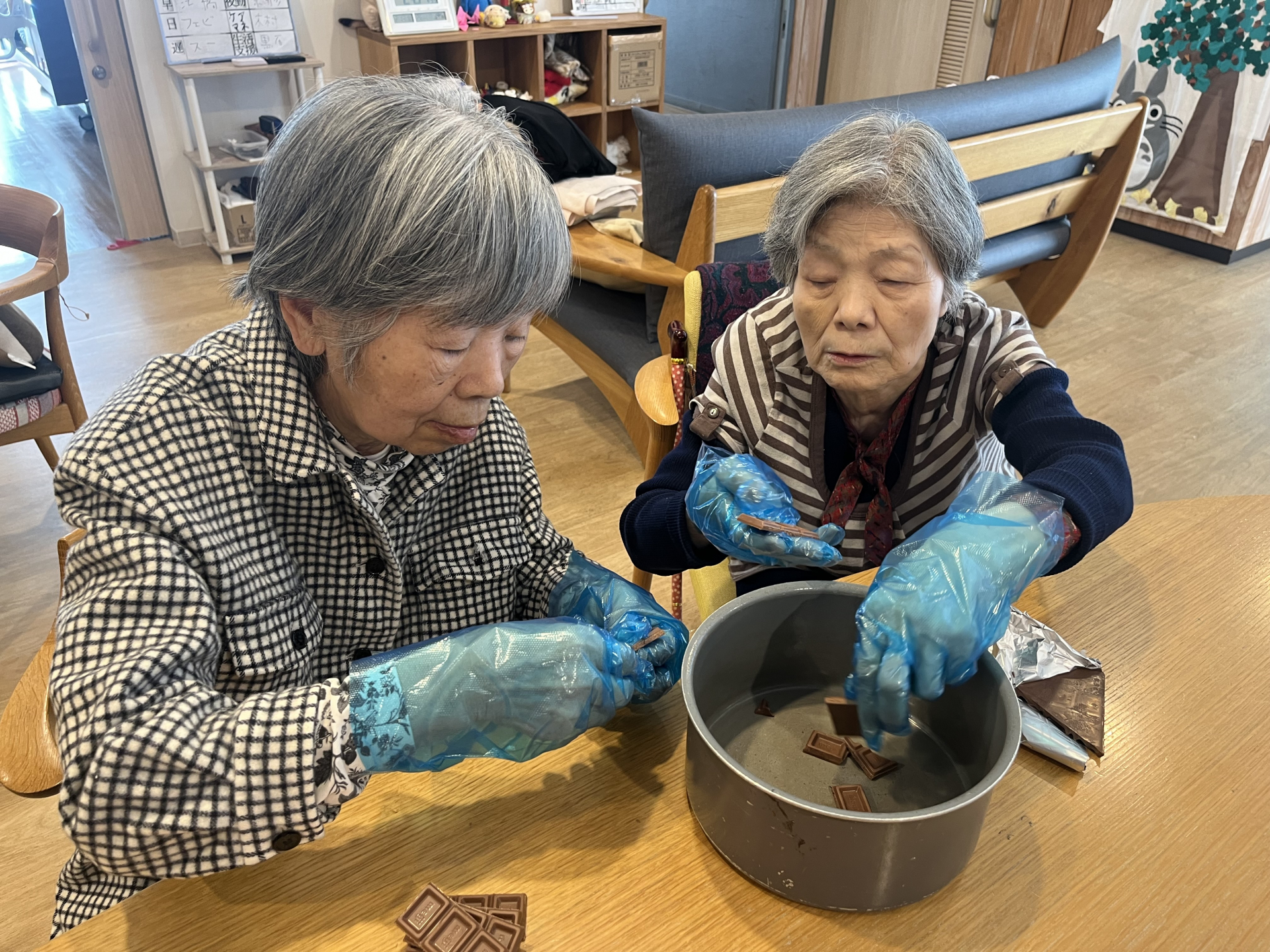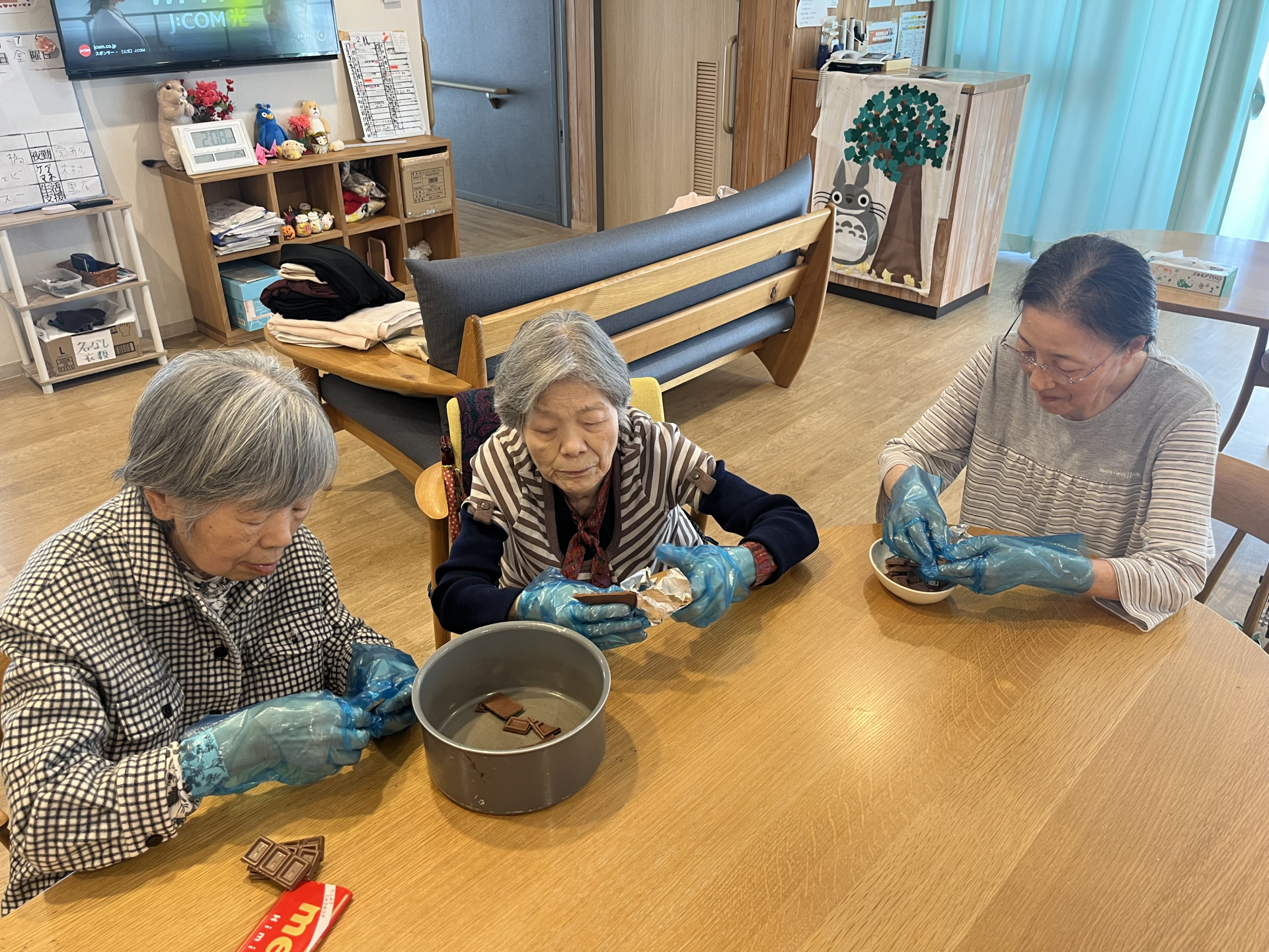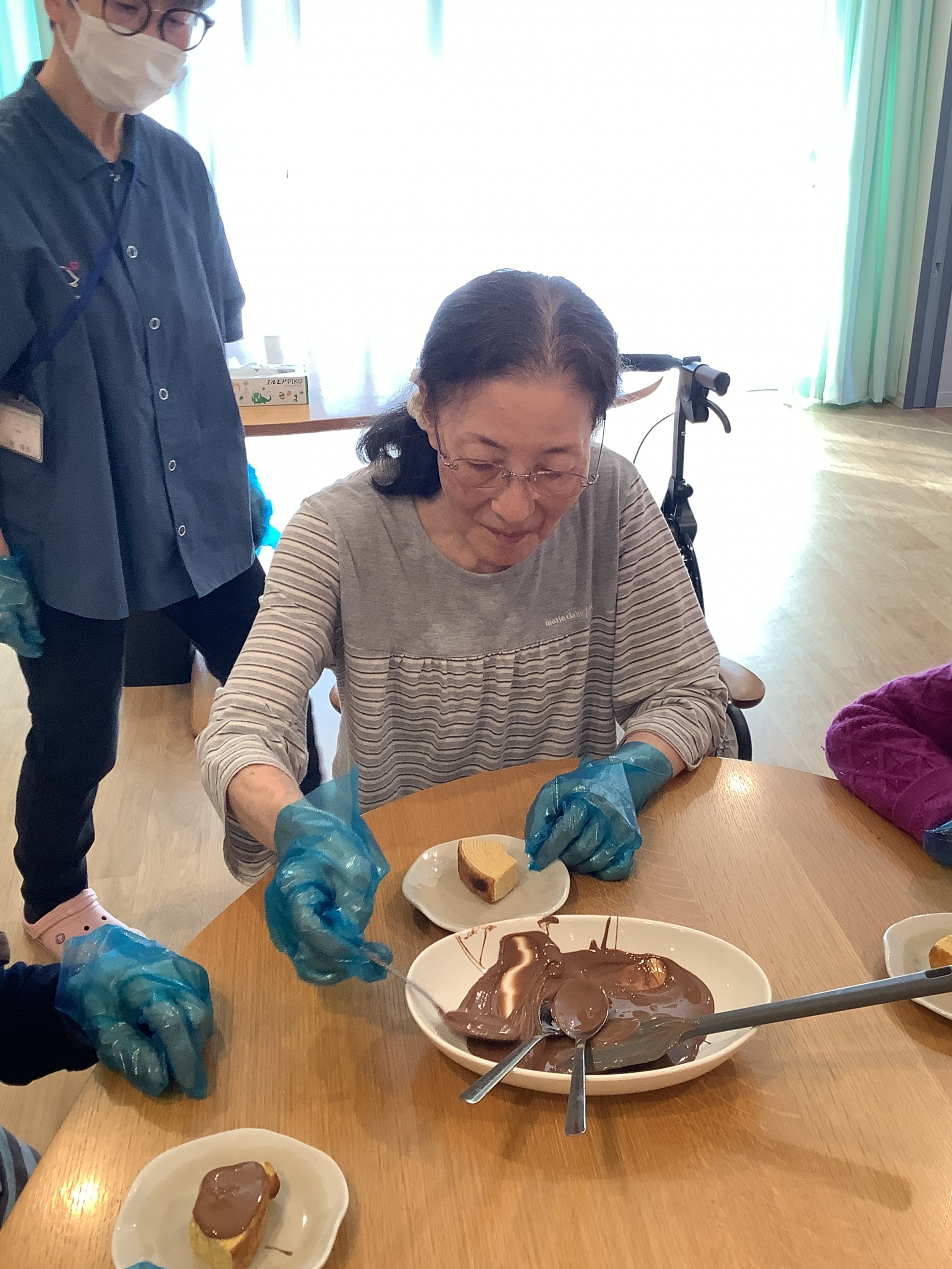 バームクーヘンやプチケーキにチョコや抹茶など好きな物をトッピングしていきます