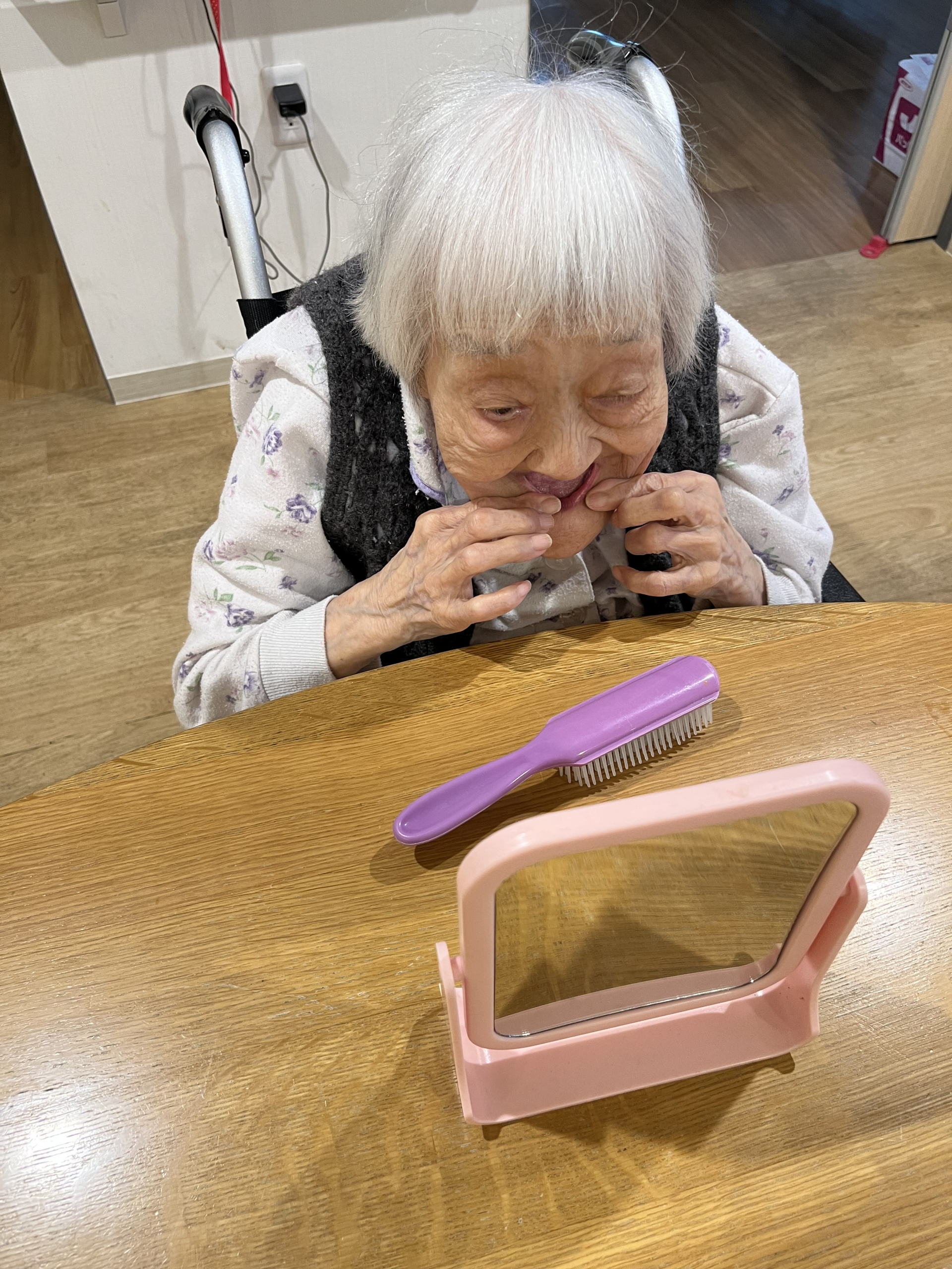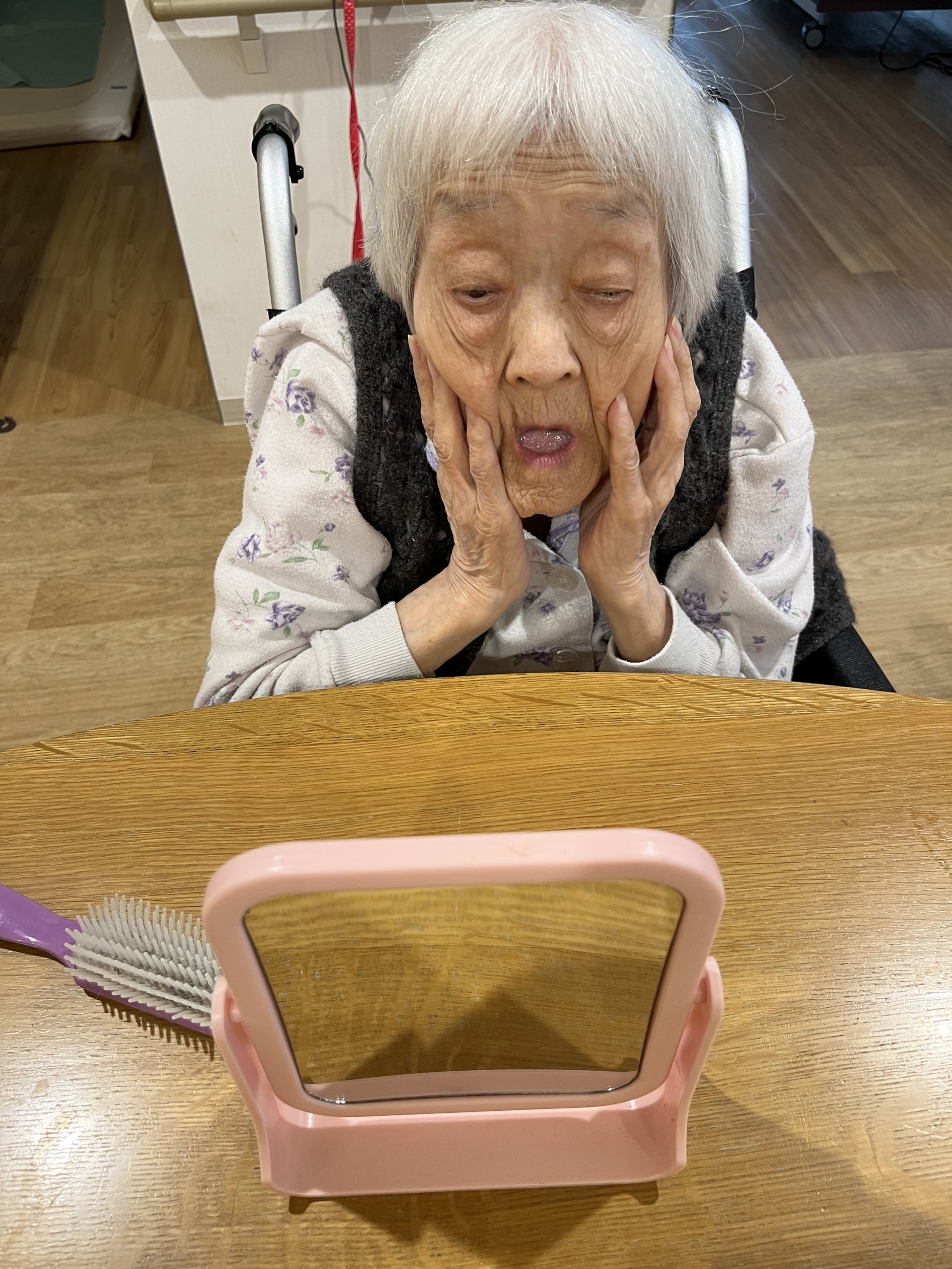 鏡を見て顔のマッサージから始まります♬