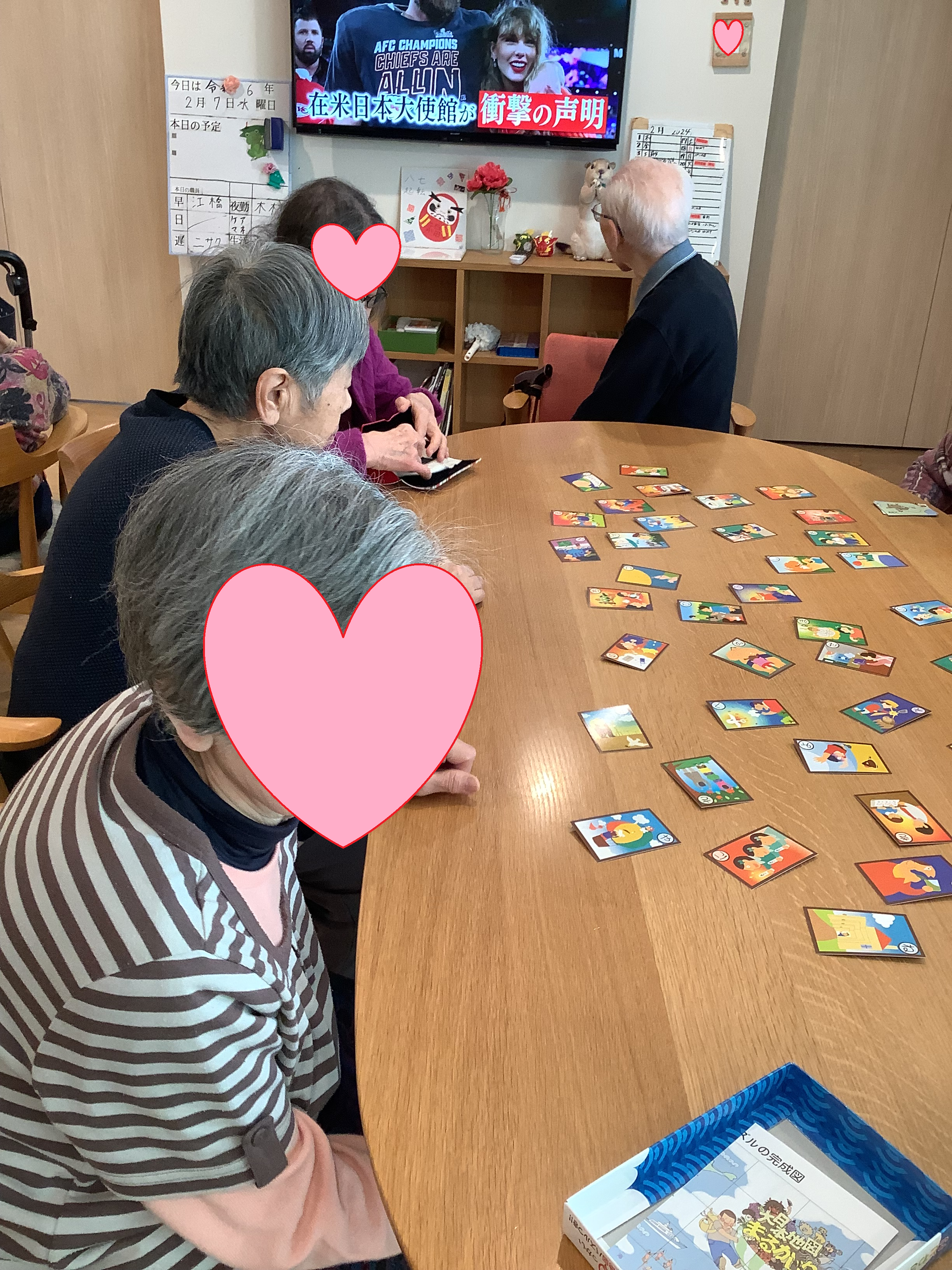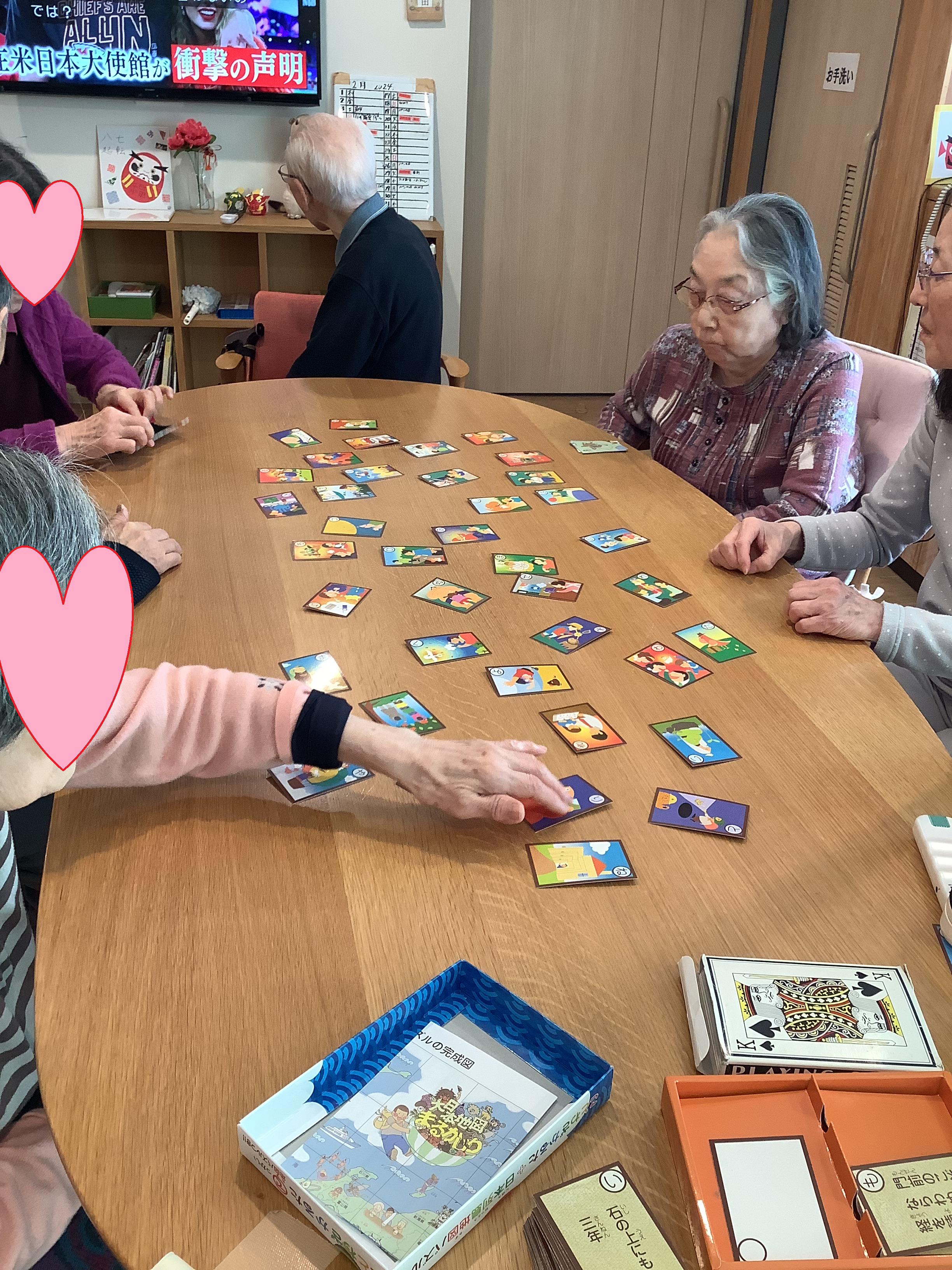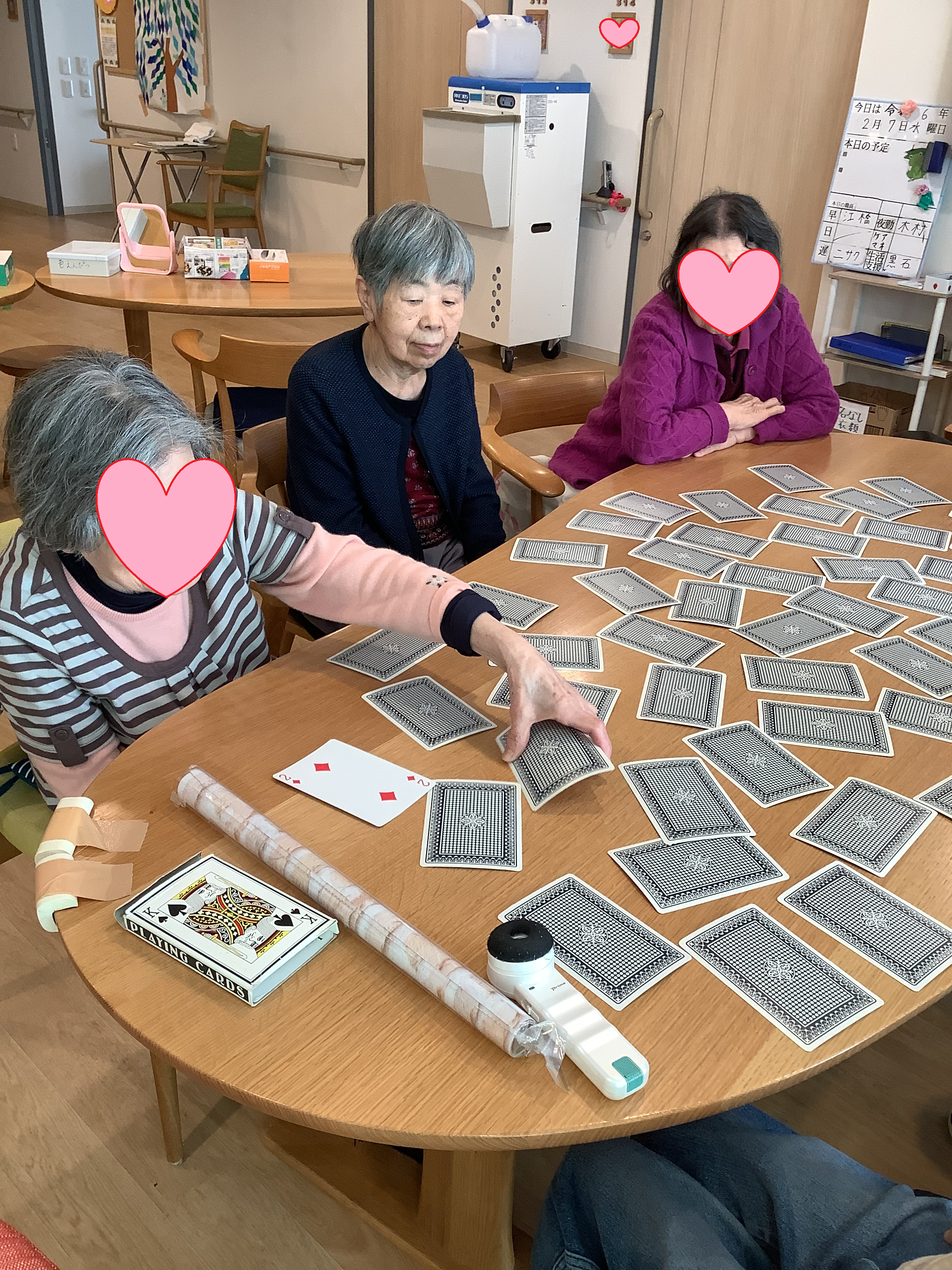 2024.02.08 活動報告 ☆WEST☆ カルタからのトランプ Tweet シェアする 15時のお茶の前に一勝負! まずは・・「かるた」 手の届かないかるたは「手作り棒」を使います(#^^#) かるたの後は・・トランプで勝負! 楽しい時間を過ごされました♬ きむら 前の記事 2024.02.08 活動報告 ☆WEST☆ ありがとう 次の記事 2024.02.07 活動報告 ☆彡EAST 大詰め☆彡 一覧へ戻る