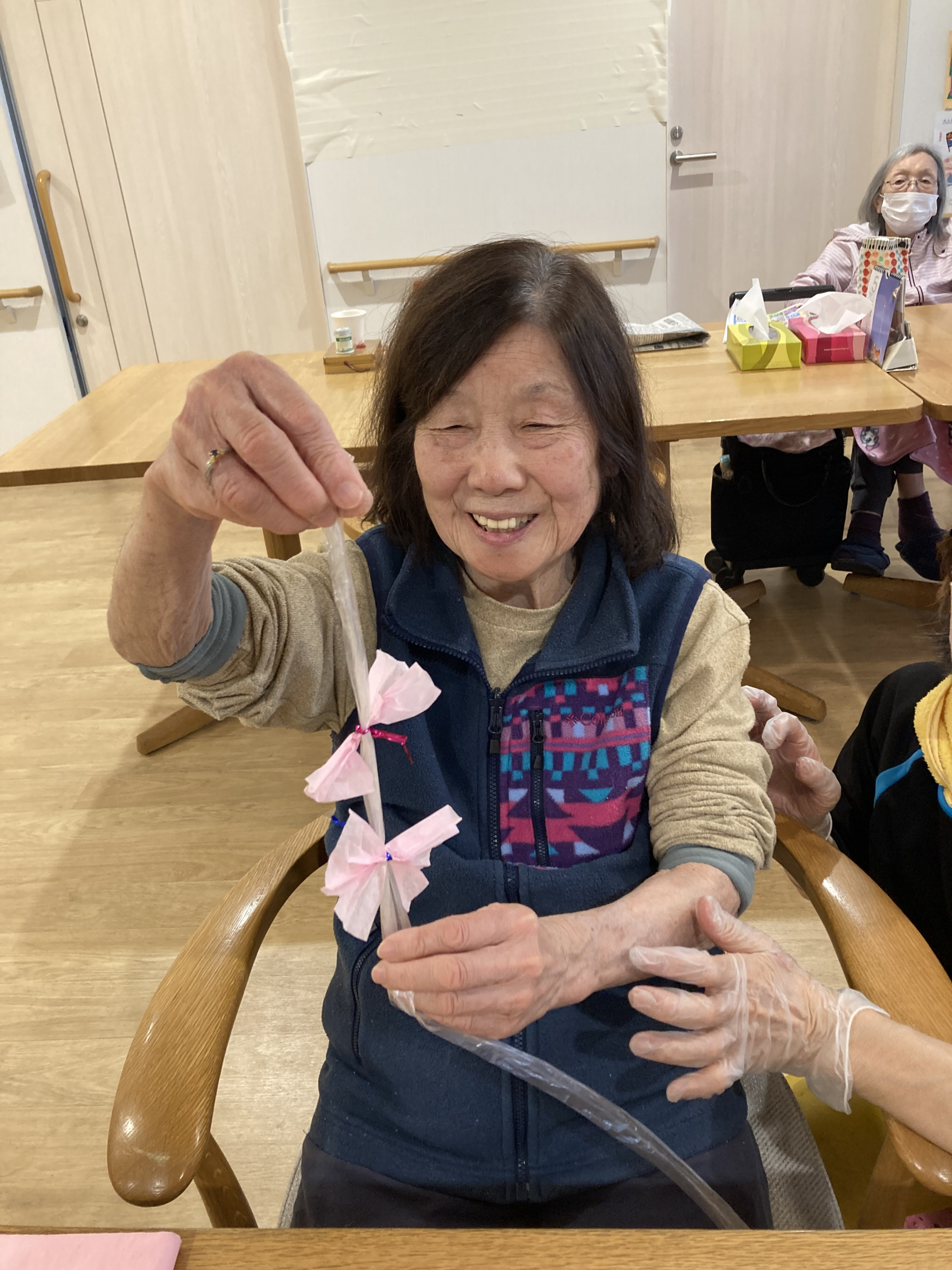 折り紙でしだれ桜を作ったり、