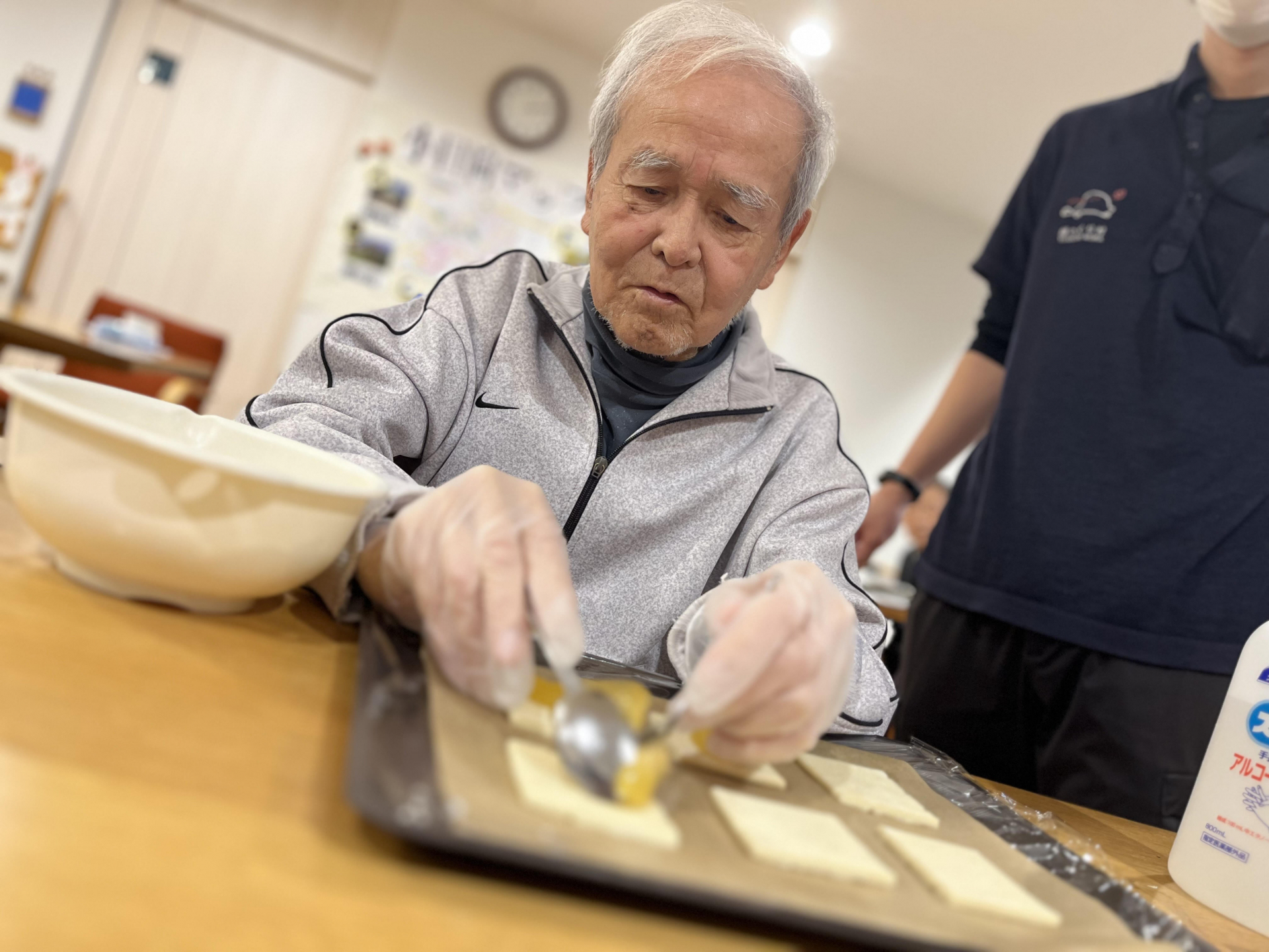 職員と一緒に、集中してリンゴを均等にそして丁寧に並べます。