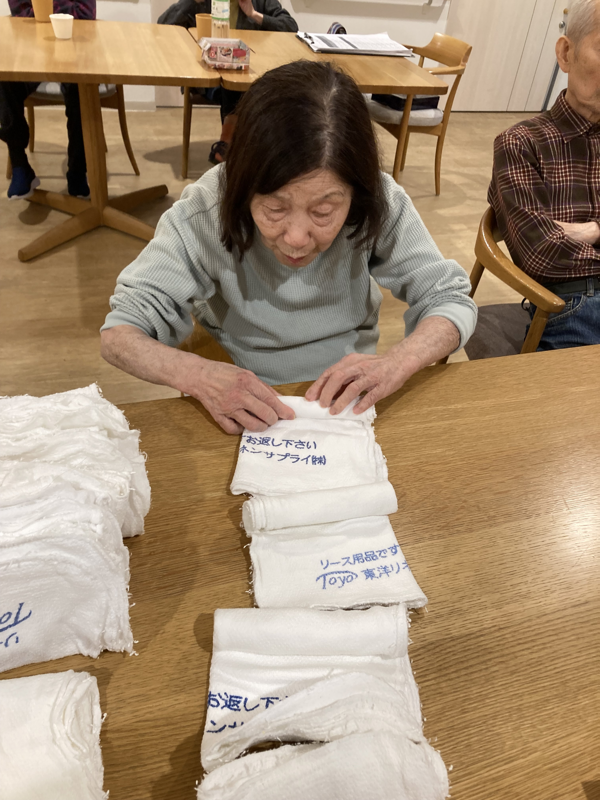 脳の活性化のため指先を使ってタオルを丸めてもらいました。