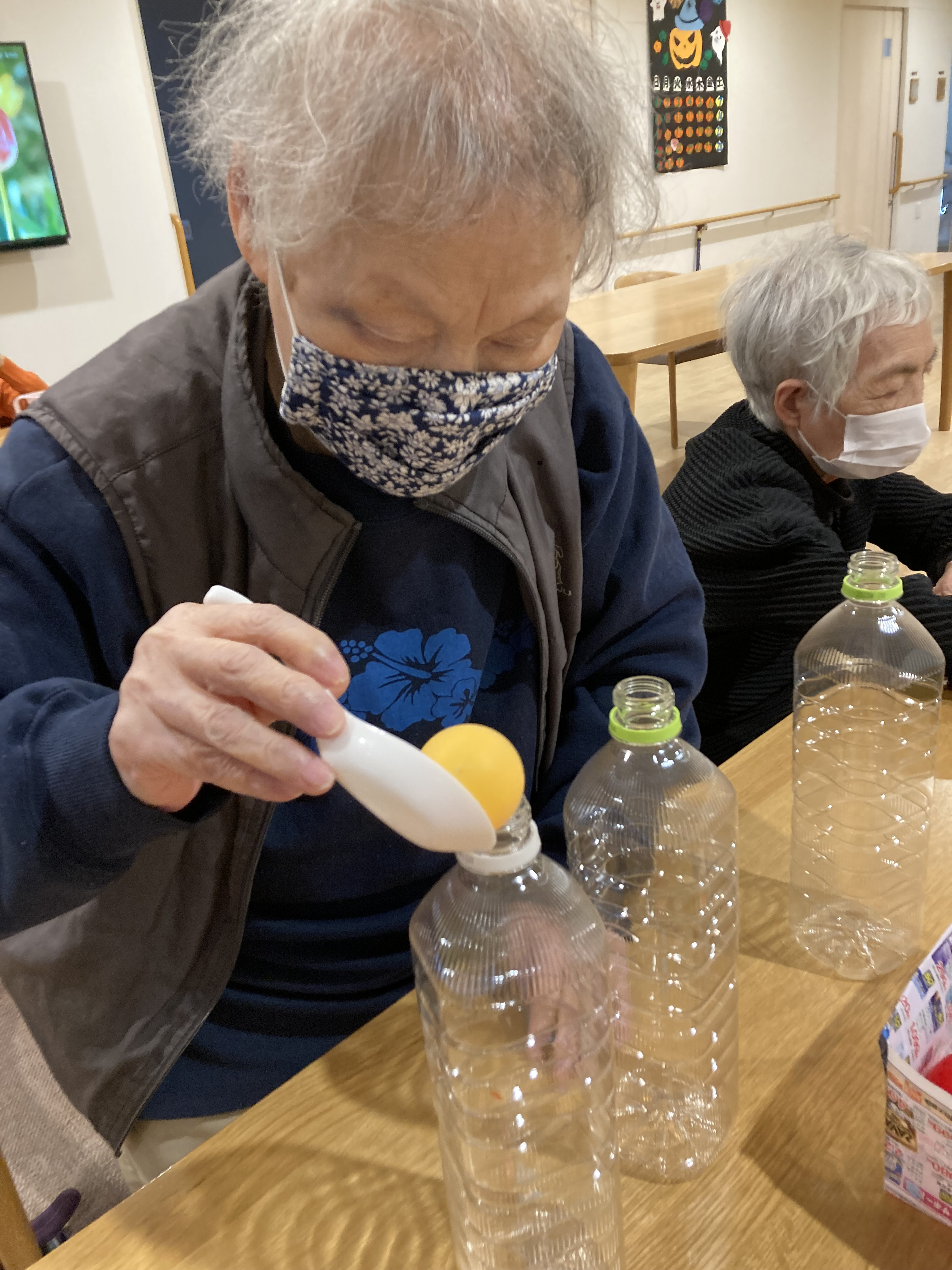 色々な大きさのボールをレンゲからペットボトルの口にのせています(@_@。