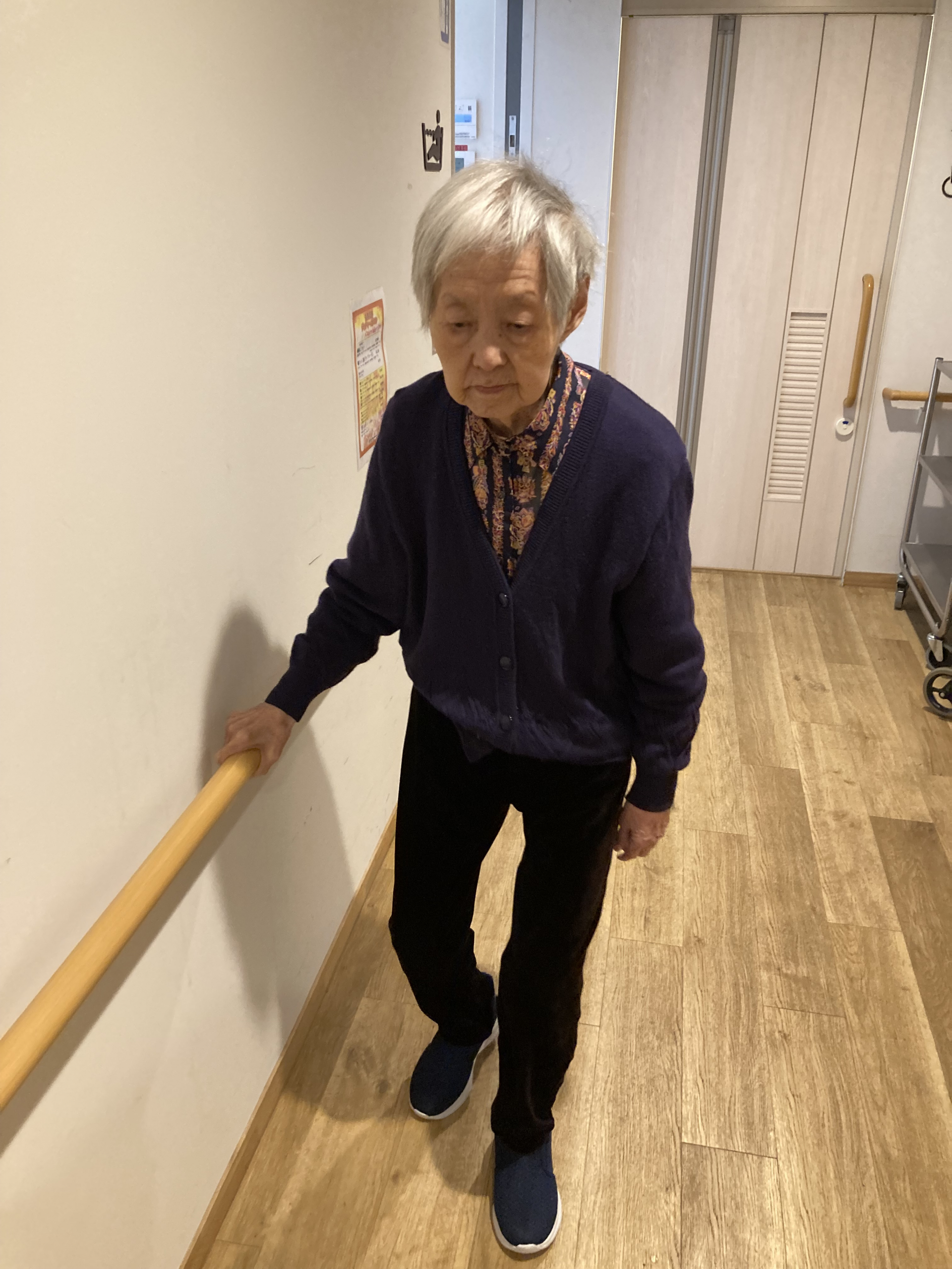手すりを掴んで歩行練習の後に