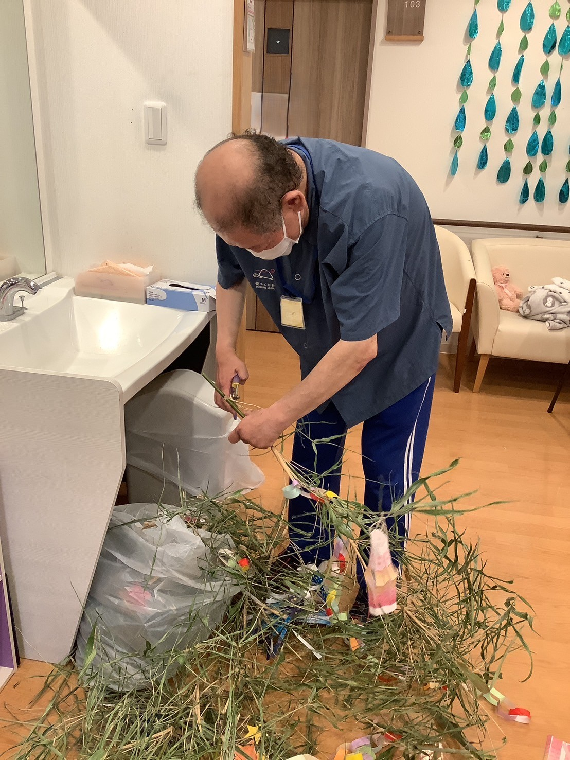 七夕の笹を毎年持ってきてくださる職員さん。七夕が過ぎたこの日は、大きな笹のお片付け中でした(''◇'')ゞ