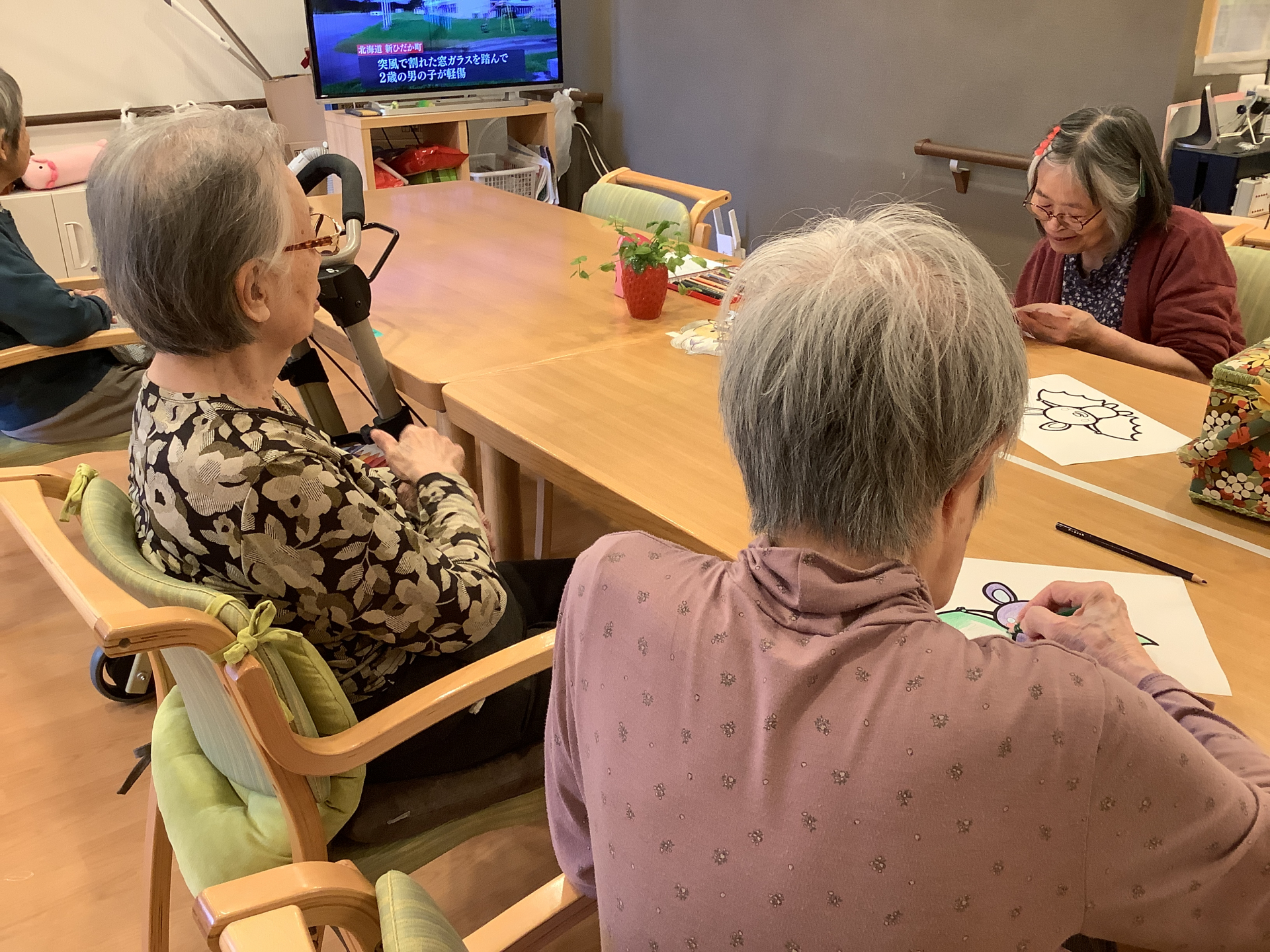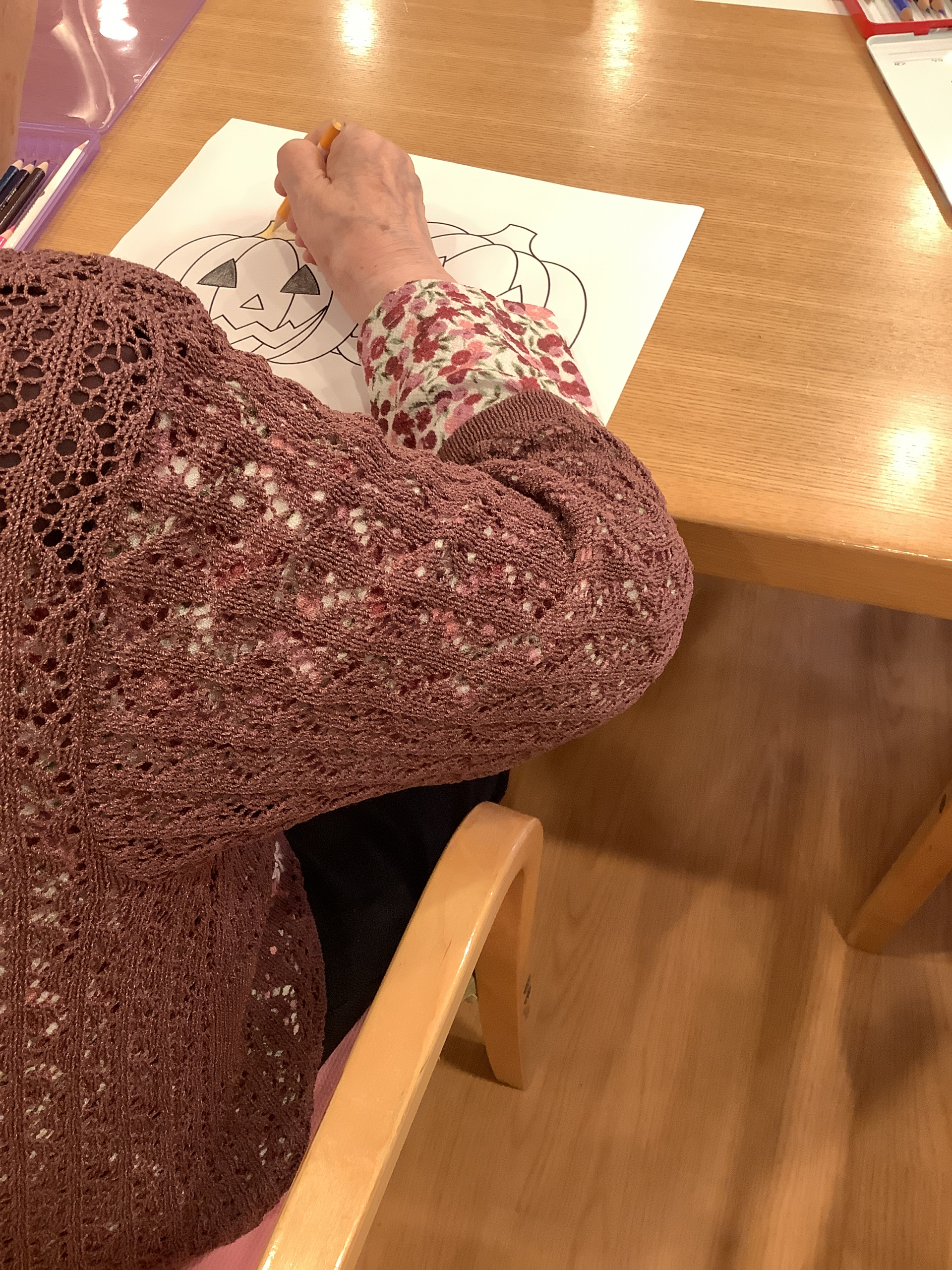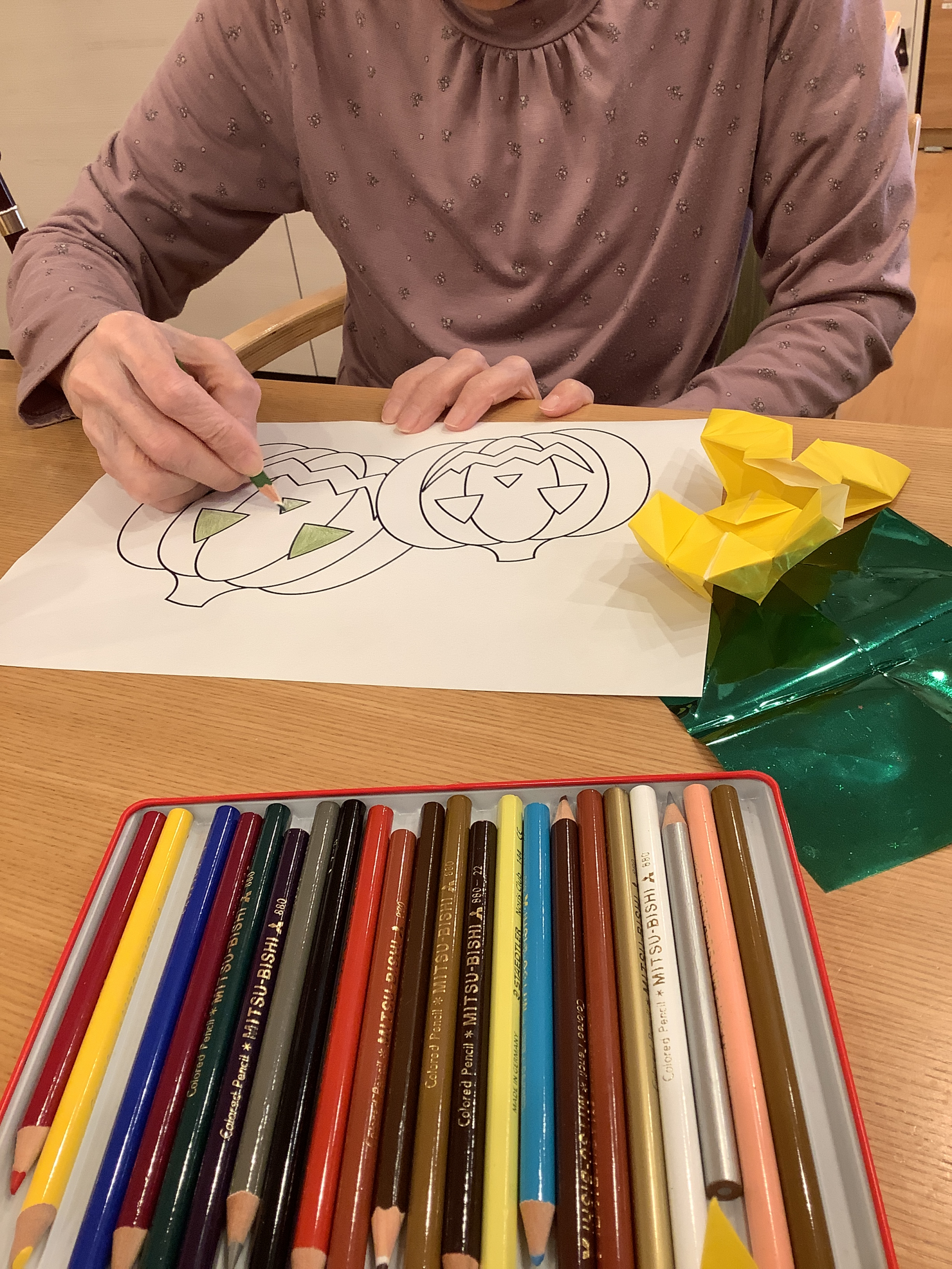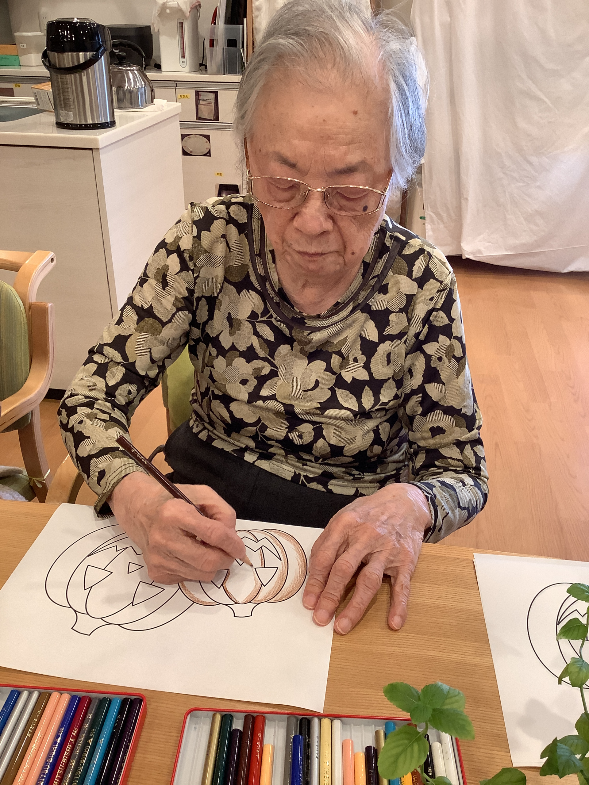 ということで、ご入居者様にハロウィン系の塗り絵をたくさんお願いし、壁に貼っていくことに(*^_^*)
