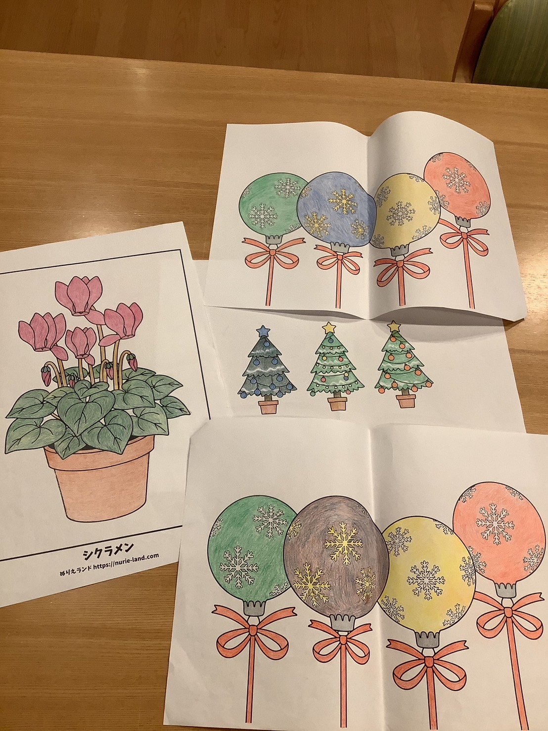 1階フロアには、ご入居者様がレクリエーションとして楽しんだ塗り絵の作品がたくさんあります。