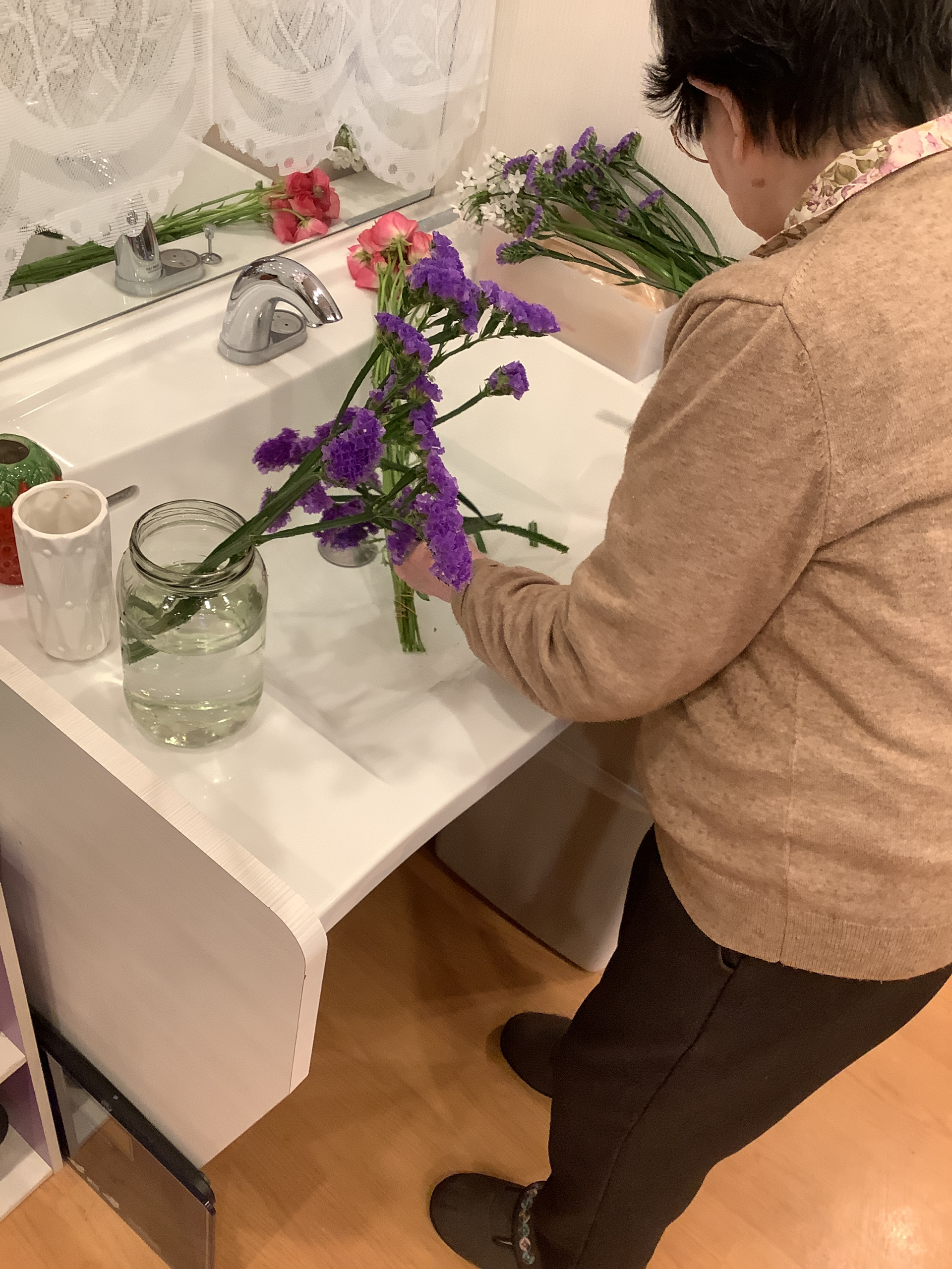 職員からお願いせずとも、ご入居者様が自主的に花瓶の水を交換してくださったり、傷んでいる箇所を切ってくださったりする光景がよく見られております(*'ω'*)