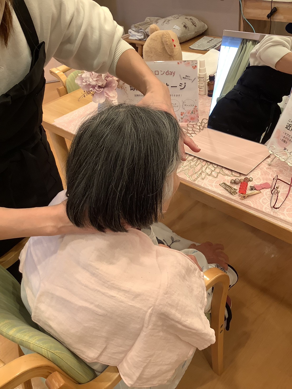 外に出ないとなかなか受ける機会がないマッサージですが、沓掛ではこうして施設の外から美容レクのスタッフさんが来てくださるので、中にいてもさまざまな体験をしていただくことが可能です!!