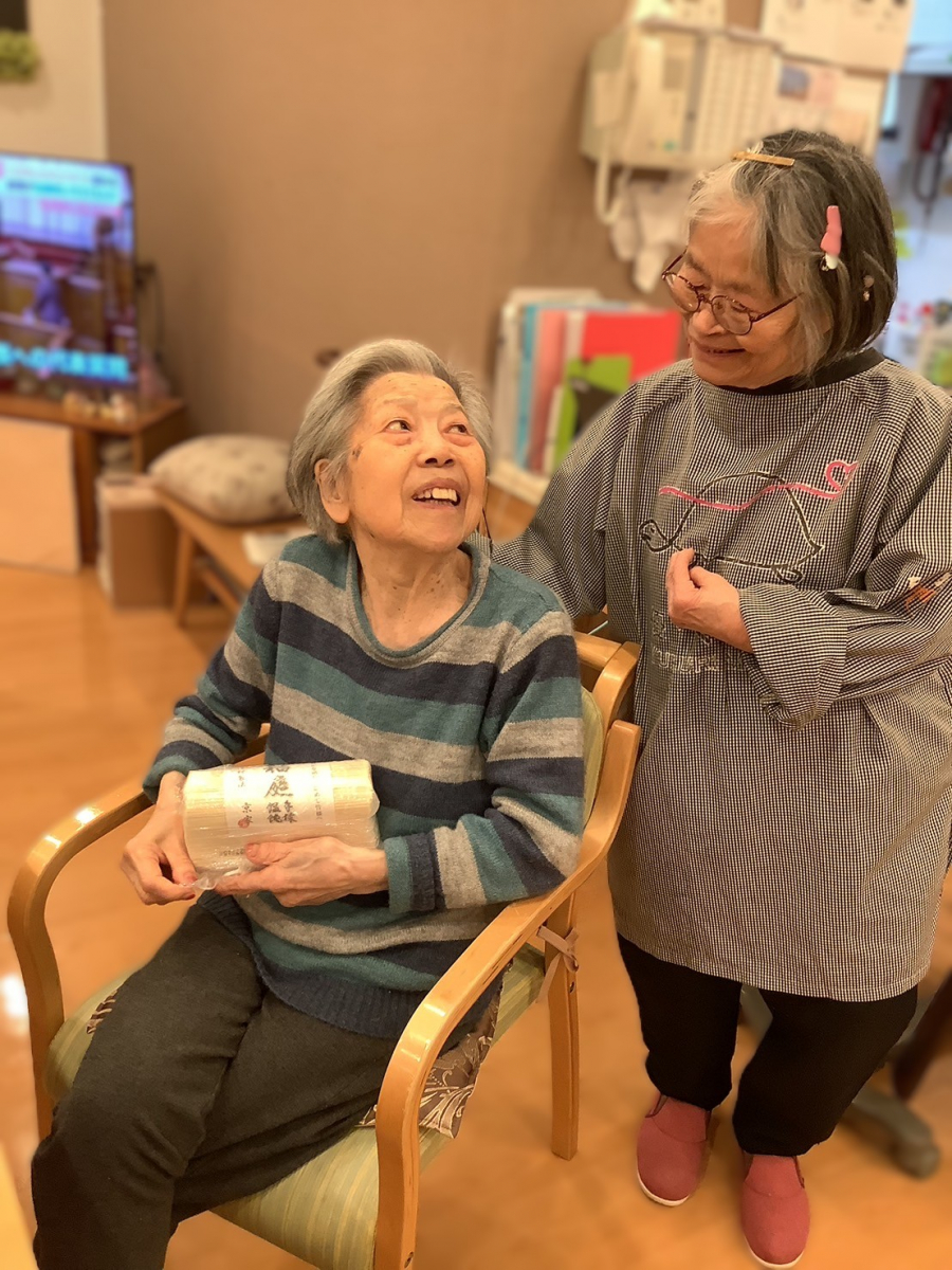 笑顔で手渡されると、受け取ったご入居者様も「ありがとうございます」と嬉しそうなご様子でした。お二人でお話しされる姿からは、温かい交流のひとときが感じられました。