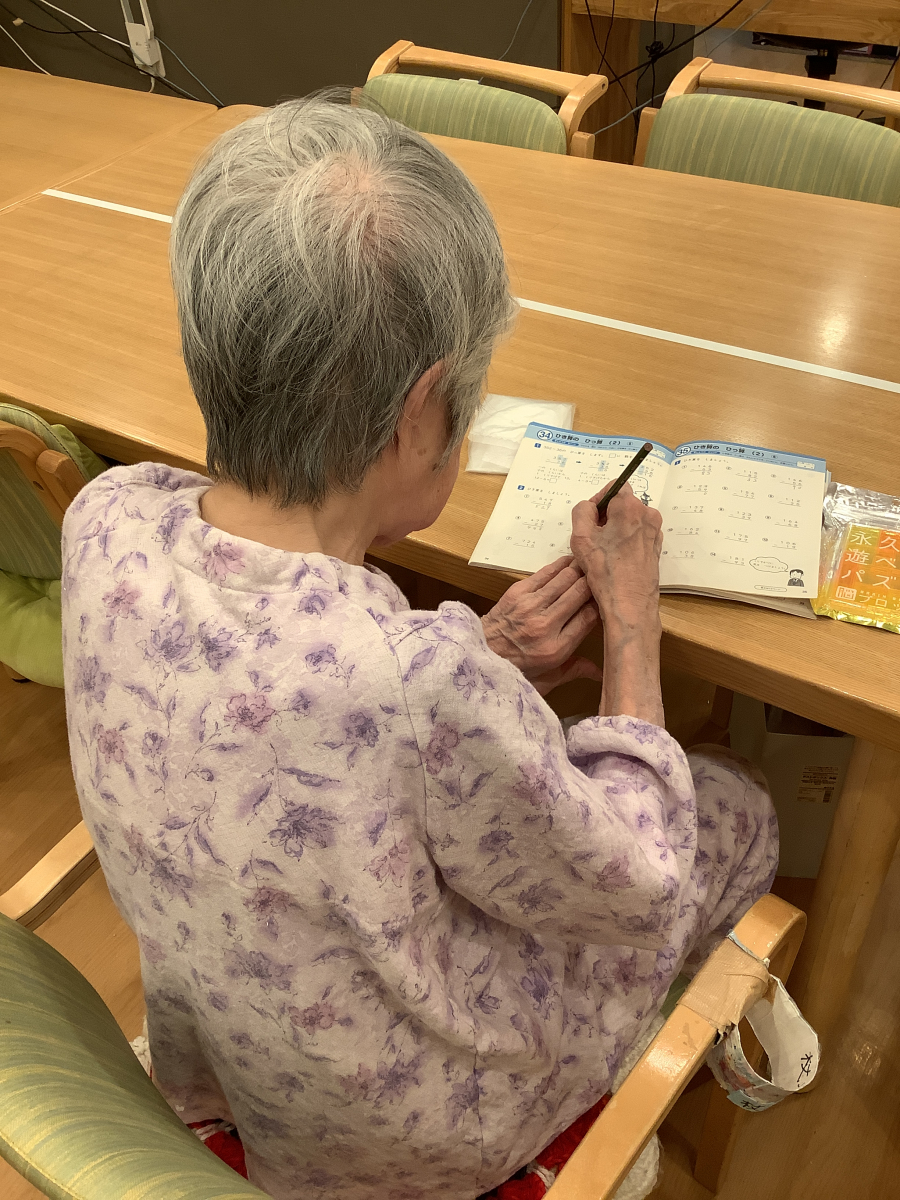 お昼過ぎから取り組んでいた計算ドリル。脳トレ好きなご入居者様なので、お渡しした時から嬉しそうなご様子でした♪