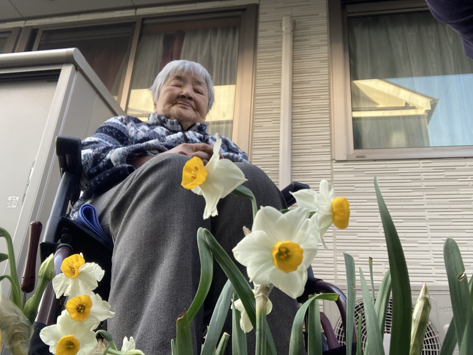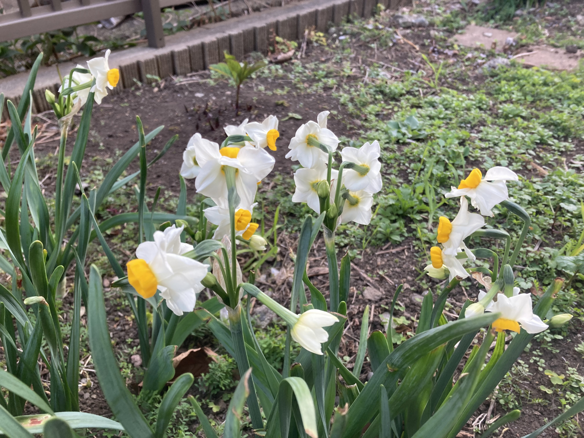 咲き始めた花は、ノースポールの真っ白な花びらと、水仙の鮮やかな白色。