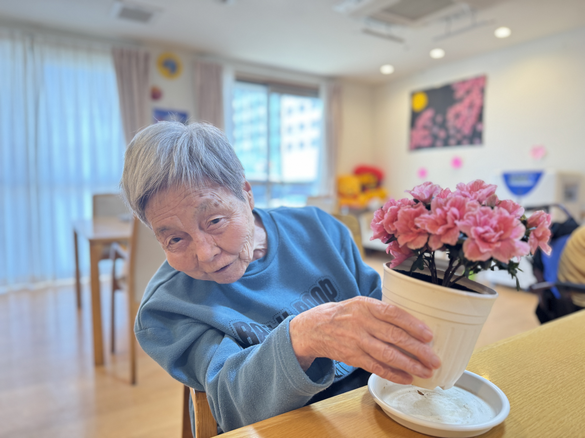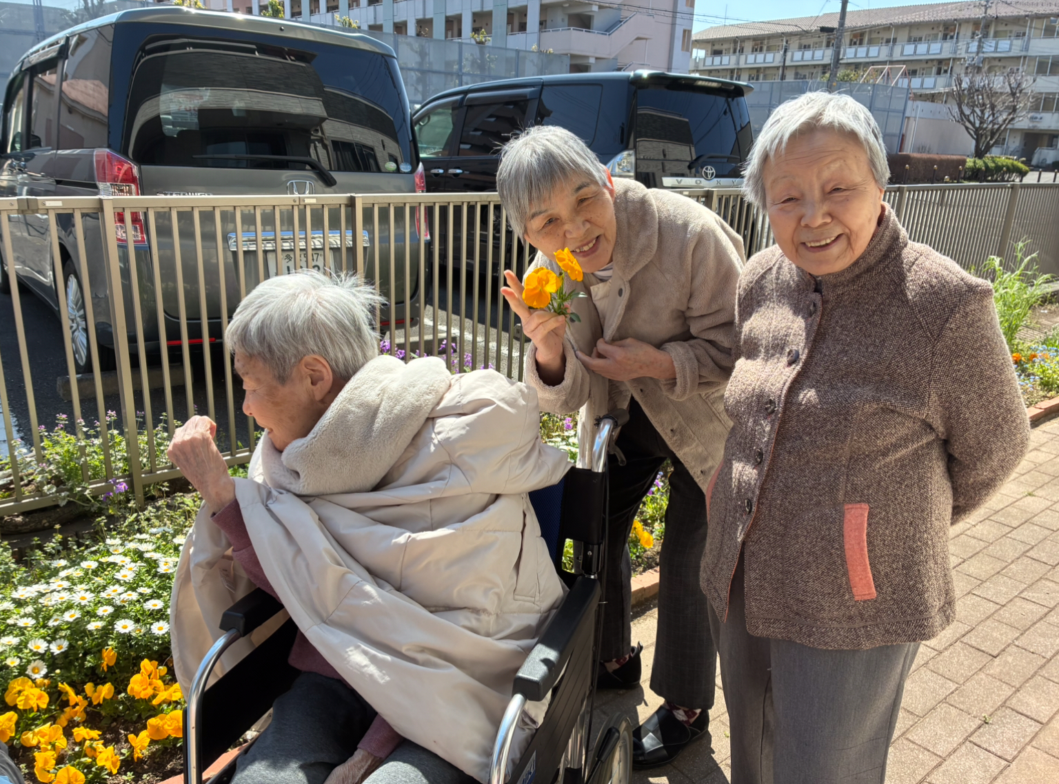 施設の庭では、色とりどりのお花たちが元気に咲き誇っています。